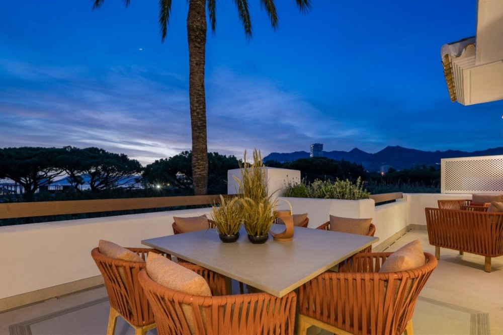 - This elegant first-floor apartment has undergone a luxury renovation and is now ready to welcome its new owners. Spacious and ultra-modern, it is located in a highly desirable beachfront complex in Reserva de Los Monteros, celebrated for its prime setting, 24-hour security, lush tropical gardens, and two shared pools. West-facing and spanning 130m² of living area, the apartment includes a spacious living and dining room, an open-plan kitchen, and a TV lounge, all opening onto a generous 30m² terrace. The three bedrooms are all generously sized, with the master suite offering an en-suite bathroom, and each room features large windows providing direct outdoor access. Additional amenities include a second bathroom, guest toilet, laundry room, hot/cold air conditioning, a designated underground parking space, and a storage room. Ideal for families, this apartment offers a unique opportunity for year-round beachfront living in a peaceful and secure environment. Close by, you'll find popular beach bars and clubs including the acclaimed “Trocadero Arena” and can enjoy a scenic stroll along the promenade to the heart of Marbella. Several golf courses and Marbella’s town center are also just a short drive away.