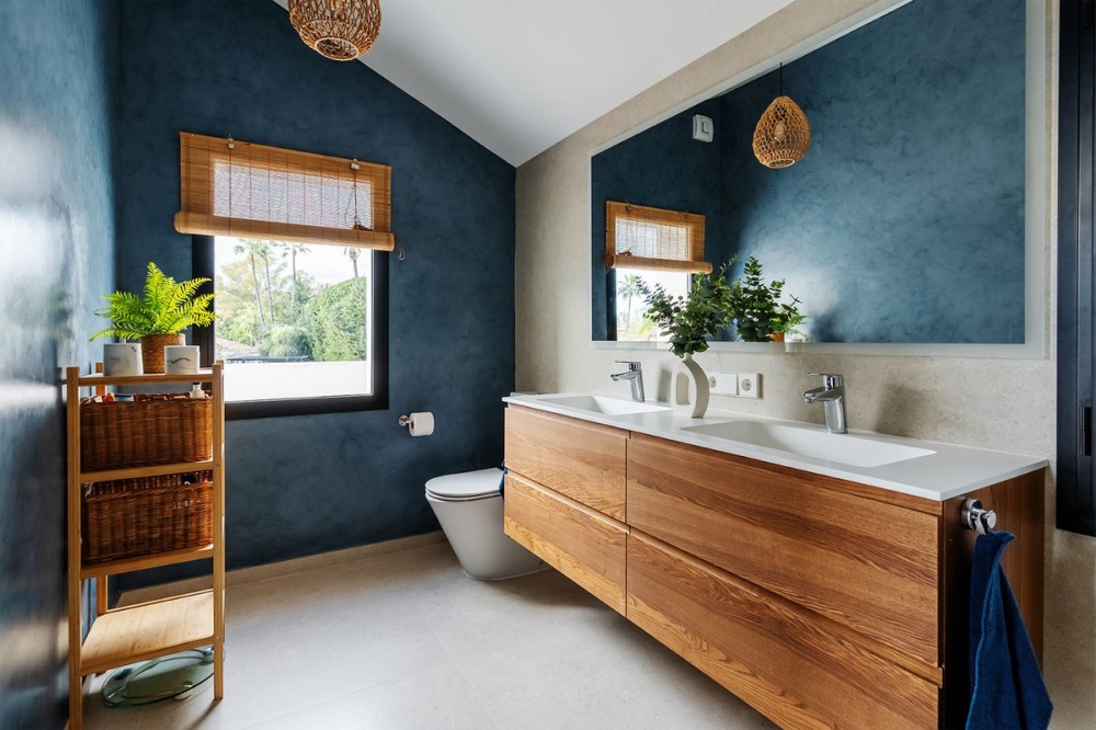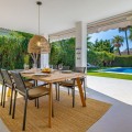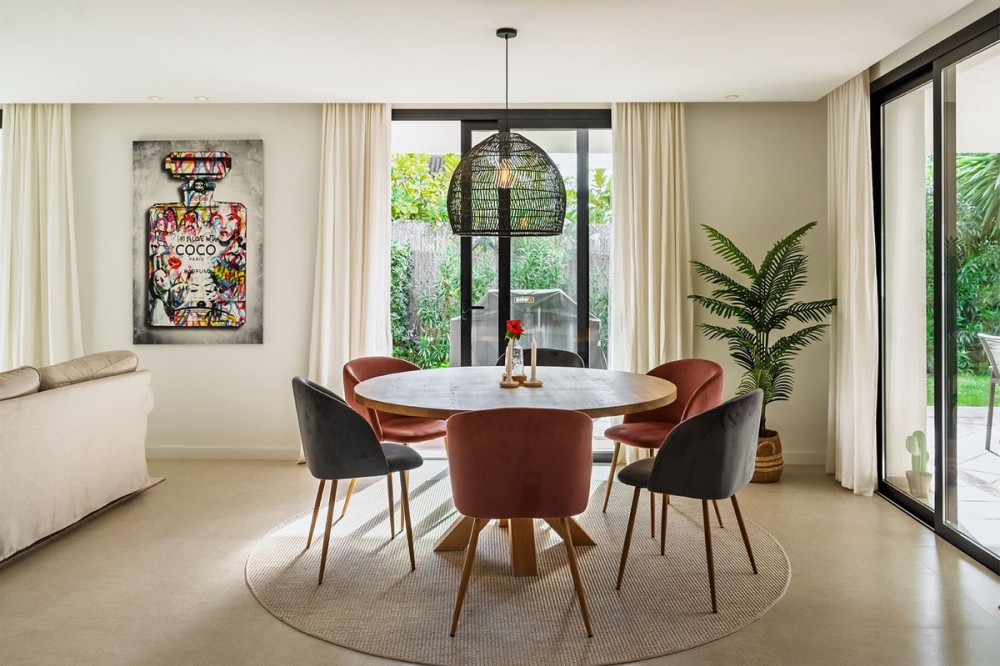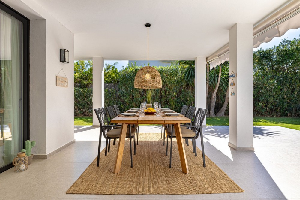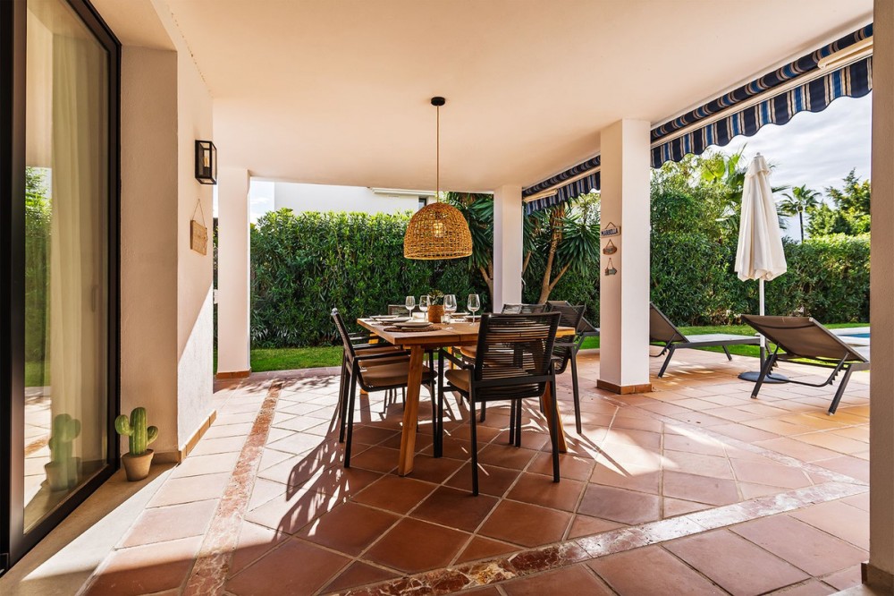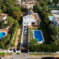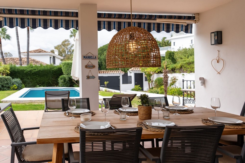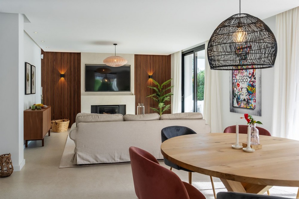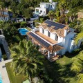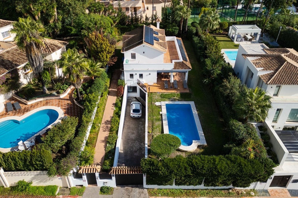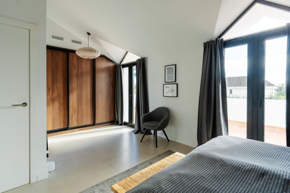 - This fantastic villa is located in the middle of the Golf Valley in Nueva Andalucia, a quiet and very attractive area with proximity to golf courses such as Las Brisas, Los Naranjos and Aloha Golf. Here you live with a 20 minute walk to the nearest restaurants and café. Only a few minutes by car to Puerto Banus and Marbella town, which offers a wide range of restaurants and shops. Proximity to the beach and the long, lovely promenade. In Nueva Andalucia you are close to a supermarket, school, pharmacy and bank. Welcome to a newly renovated villa of the highest quality, completed in 2024 in a modern Scandinavian style. Four bedrooms and four bathrooms, three of which are en-suite with underfloor heating. The ground floor has a kitchen from Ballingslöv and Siemens appliances, a living room in a bright open plan and direct access to the large terrace and garden. Large sliding glass doors that provide natural sunlight into the entire villa. Upper floor with two bedrooms en-suite and a balcony that is accessible from both rooms with a lovely view where you can sense La Concha and Los Naranjos golf course. Basement with bedroom en-suite, spacious gym and a separate laundry room. Here there are endless possibilities to decorate how you want and according to your own needs. From the basement you have access to a large garage, storage room and the entrance to the house. Solar cells that give the villa an energy-efficient living space, fireplace in the living room for a lovely cozy feeling and natural warmth. Airzone air conditioning system where you personally ensure temperature control throughout the villa. Spacious terrace, partly covered, private pool and outdoor shower. Large garden that provides plenty of space for outdoor activities and enjoying the wonderful climate of the Costa del Sol.