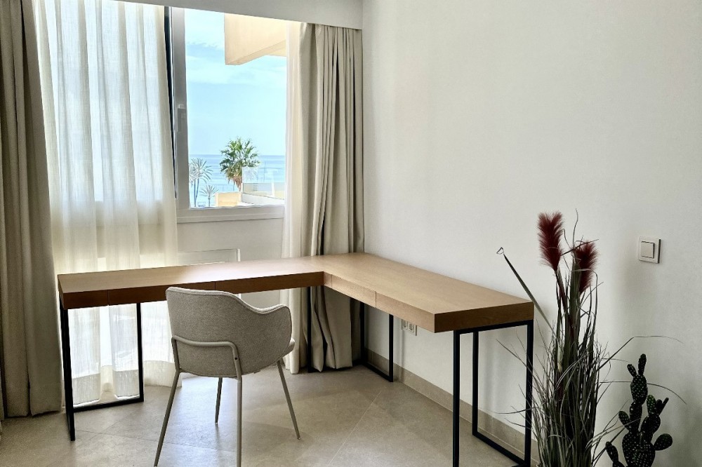 - This exceptional beachfront apartment is situated in the heart of Marbella, directly on the promenade overlooking Marbella's Sport Port. Spanning 120 square meters, the fully furnished space features two bedrooms and two bathrooms. Every detail has been thoughtfully designed and finished with high-quality materials for a luxurious living experience