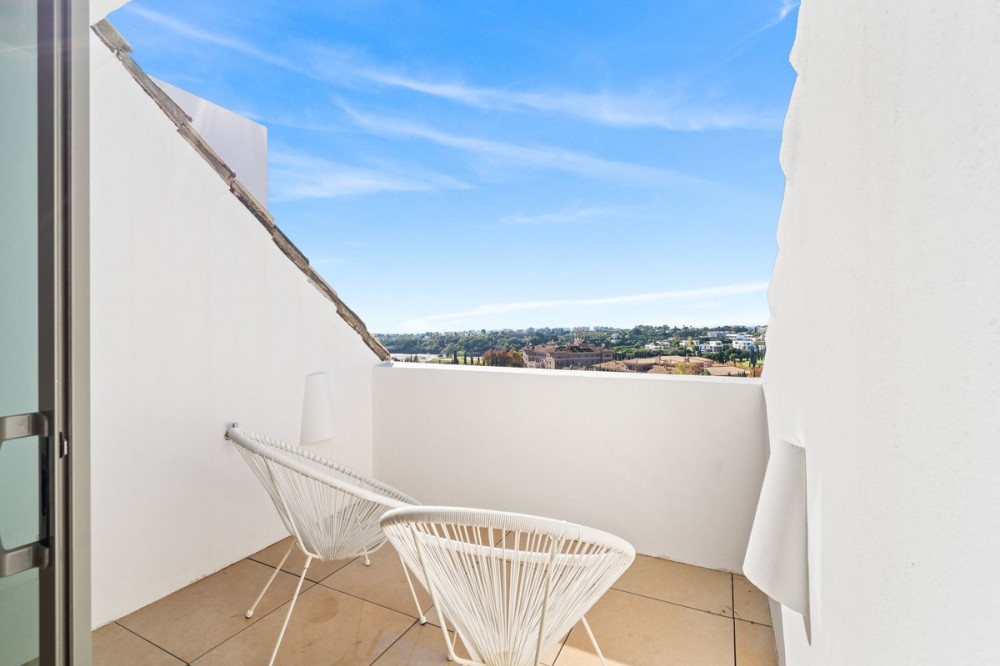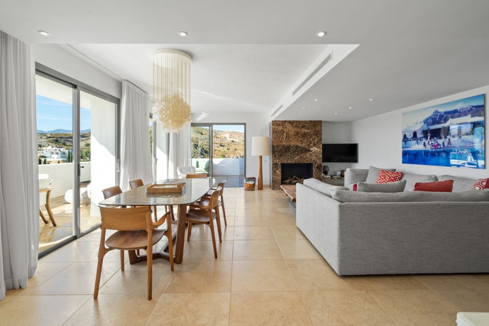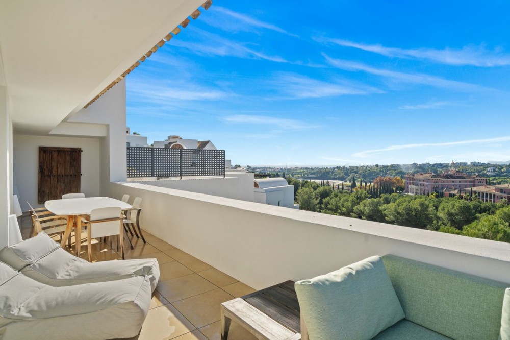 - Experience luxury living in this stunning penthouse located in the exclusive complex of Los Flamingos Golf, Tee 5. Nestled within a secure, gated urbanization, residents enjoy access to two beautiful pools and meticulously maintained gardens. This prime location is surrounded by prestigious golf courses, just minutes away from the sandy beaches, and conveniently close to the vibrant amenities of Puerto Banús, Estepona, and Marbella. It's truly an ideal setting to indulge in the upscale lifestyle of the Costa del Sol. Spanning an impressive 300 m², this elegant penthouse features a spacious living room, a fully equipped kitchen with modern appliances including a dishwasher, and 3 generously sized bedrooms each with its own bathroom, plus an additional guest toilet. Step outside onto the expansive terrace, complete with a dining area, lounge space, private pool, and breathtaking panoramic views of the sea, mountains, golf courses, and the prestigious Villa Padierna. Underground parking is icluded. Don't miss the opportunity to own this piece of paradise on the Costa del Sol!