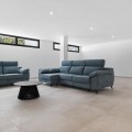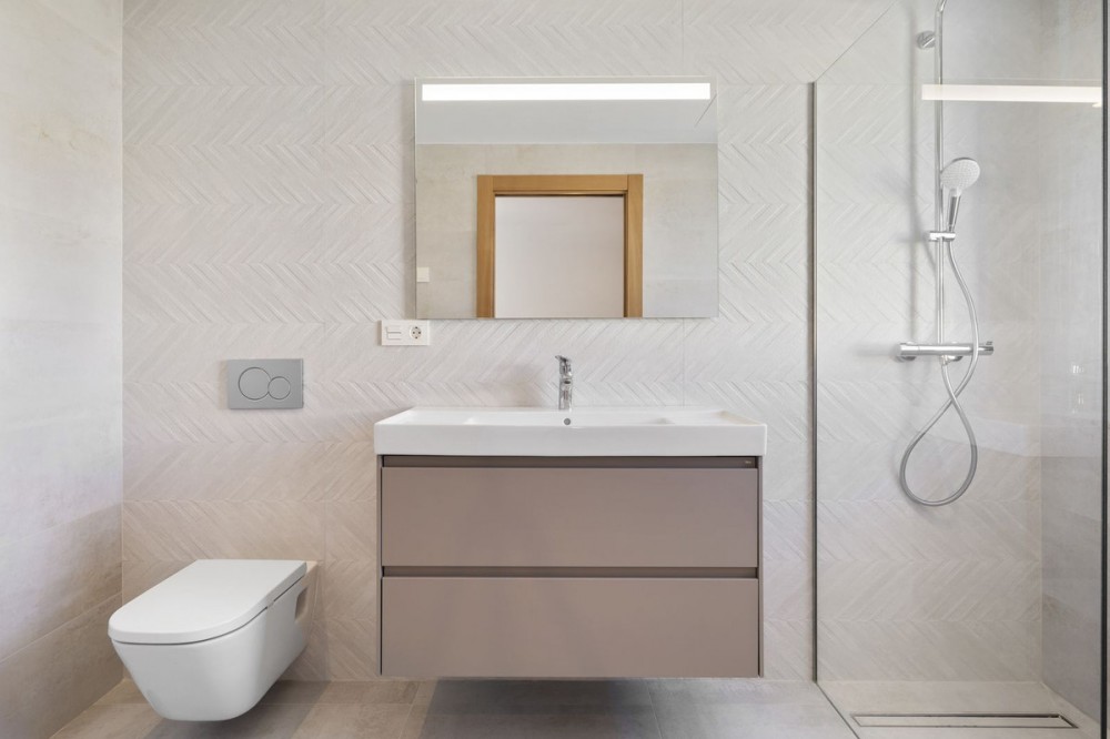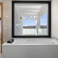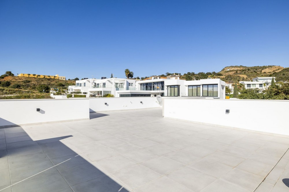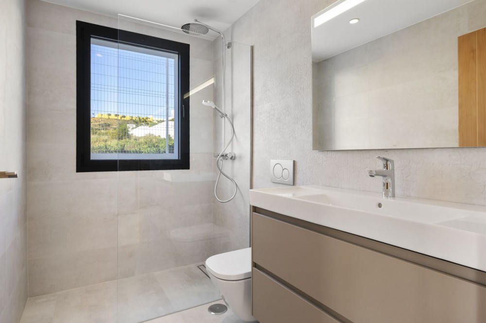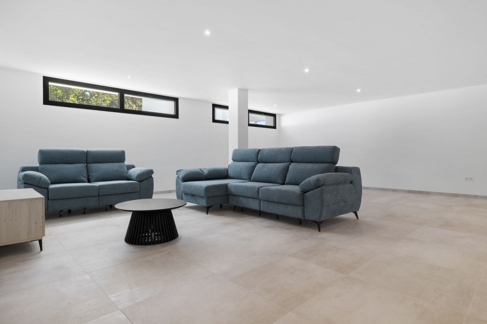 - SPACIOUS CONTEMPORARY VILLA IN TOP LOCATION! This beautiful villa is located only a short walk from the center of La Cala de Mijas, a unique villa just newly built. With its 6 spacious bedrooms with fitted wardrobes and five luxurious bathrooms it is definitely an amazing property which you do not often find that close to the center of La Cala. Upon entering on the ground floor, you will find a beautiful spacious living room with a glass facade so that you have a lot of natural light. A beautiful open kitchen with spacious dining table makes this an area where you literally feel at home. The kitchen is equipped with all necessary built-in Bosch appliances. Next to the kitchen there is a storage room where the washing machine and dryer are, both Bosch as well. From the living room you can walk outside and you immediately have access to the swimming pool with an outdoor shower. Next to the swimming pool there is another 30m2 terrace. There are several electricity and water points on this terrace. From both the living room and the swimming pool you have an amazing view, on one side you will see the mountains and on the other side the ocean. On the same level you find a bedroom and bathroom, and the entire ground floor is equipped with underfloor heating. If you go upstairs, you will find three large bedrooms, all with beautiful fitted wardrobe and an en-suite bathrooms. The two bedrooms at the front of the house have sliding doors that open onto a terrace with once more beautiful views. Like the ground floor is also this floor equipped with underfloor heating. From the top floor you can go to the roof terrace, this exceptionally large terrace has a beautiful sea view. Unique is the basement of the house, because here you find two more bedrooms and a bathroom. And not just that, a huge relaxation area has also been created here, there is enough space to create a gym and a large television room for example. Outside you notice the beautifully landscaped garden that surrounds the house, in which many beautiful materials have been used and very high-quality artificial grass so that the garden is easy to maintain. There are many places around the house where you can relax in silence, completely privately. On the street side there is an entrance gate for the cars, there is room for three cars that can all be parked on private property. If you are looking for a modern, spacious villa close to La Cala center, then this is your chance! A visit is definitely worth it!!