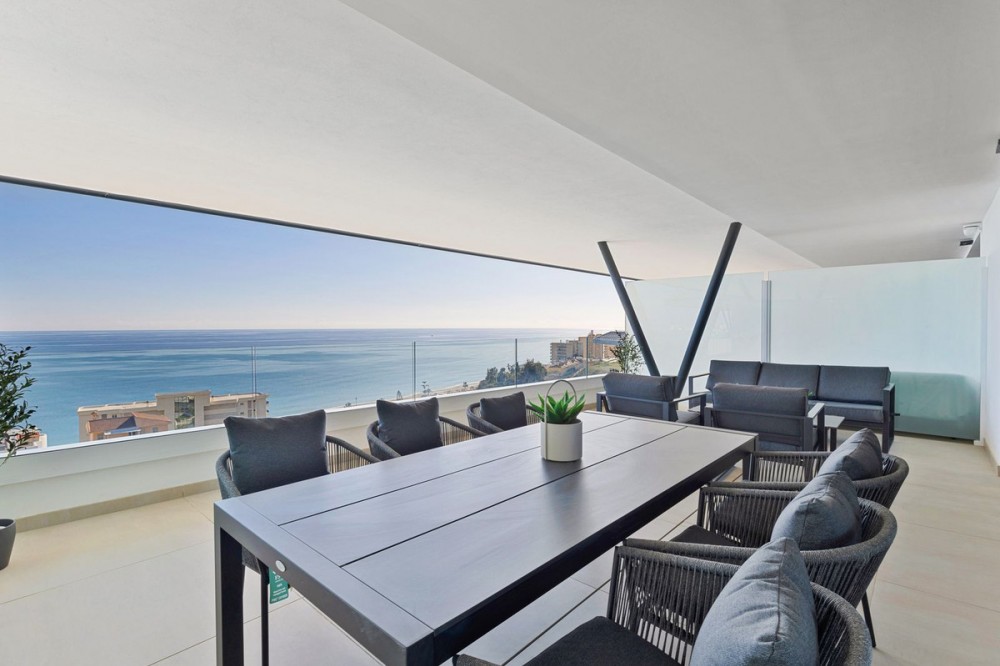 - A stunning new duplex with sea views in Fuengirola. If you are looking for a stylish apartment made with the highest quality materials, step inside! The location is unbeatable and the south-facing balconies offer views of the sea far into the horizon. The fully equipped kitchen opens onto the living room and terrace. On the ground floor there is 1 bedroom and a bathroom and a small utility room in a separate space. On the upper floor there are two bedrooms with their own bathrooms. ir conditioning with Airzone system and home automation. The community has a beautiful infinity pool, sauna, Turkish bath and gym. The Seaviews community is located just a stone's throw from Carvajal train station.