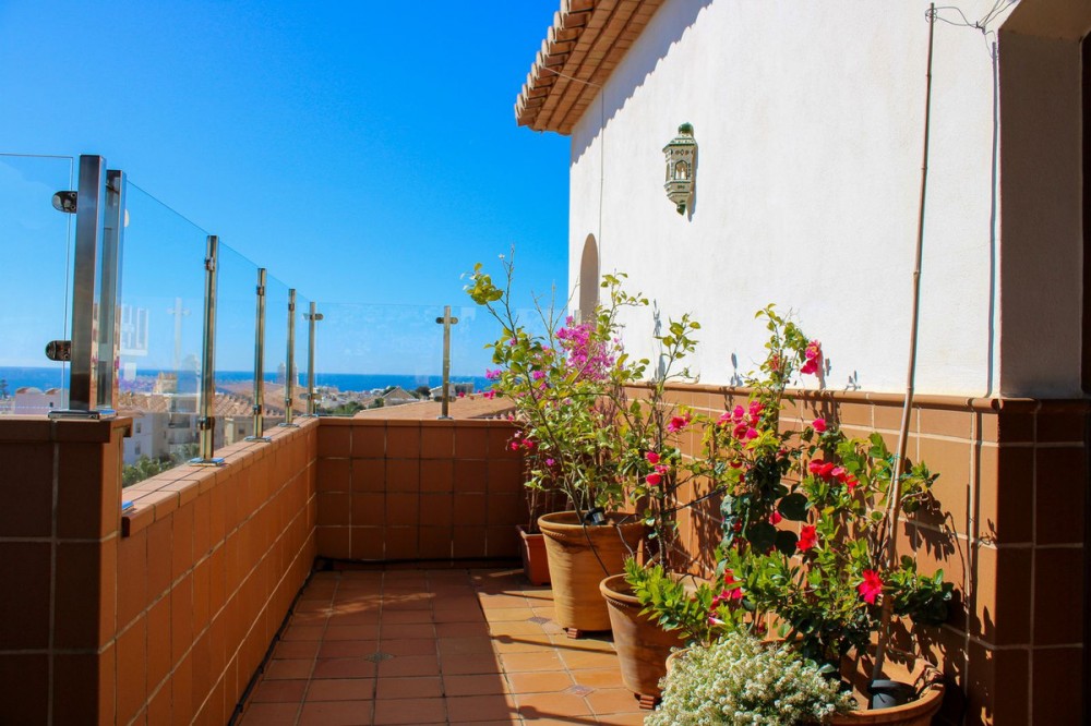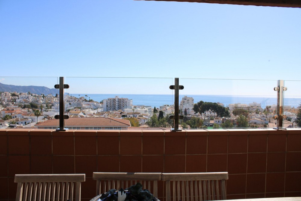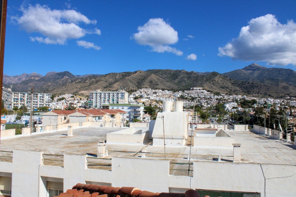- Exclusive penthouse in the heart of Nerja, spectacular sea views with both sunrise and sunset from the terraces. Large well-planned penthouse with 3 bedrooms and 2 bathrooms, wonderful terraces with sun all day. Restaurants and supermarkets are around the corner, it only takes 15 minutes to walk to Balcony Europe. It takes less than 15 minutes to walk to the nearest beach, Burriana or Carabeo. A spacious hall welcomes us to this unique penthouse, here there is a lot of light and space. A large fully equipped kitchen with separate dining area, adjacent to the kitchen is a laundry room and there is also the exit to one of the floor's lovely terraces. Large living room with fireplace, from the living room you also reach the large terrace at the front of the apartment. From here you also reach the three bedrooms and the two bathrooms, one of the bedrooms is en-suite and also has a walk-in closet. The large terrace with barbecue area invites you to magical evenings, with views over large parts of Nerja and the sea. Here you feel at home with family and friends, the place where you enjoy life. Malaga airport is 50 minutes by car, but there is also a regular bus service from Nerja. The renowned Baviera golf course is only 20 minutes by car from your new home. In winter, you only have an hour and a half drive to Granada, with skiing in Sierra Nevada. Skiing in the morning and swimming in the afternoon, the best of both worlds.