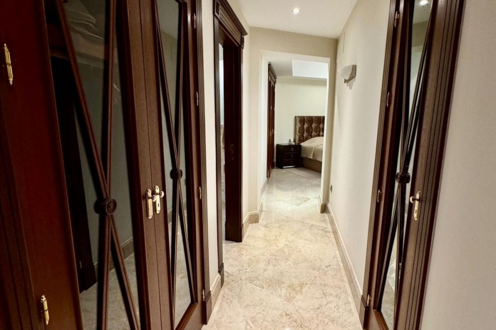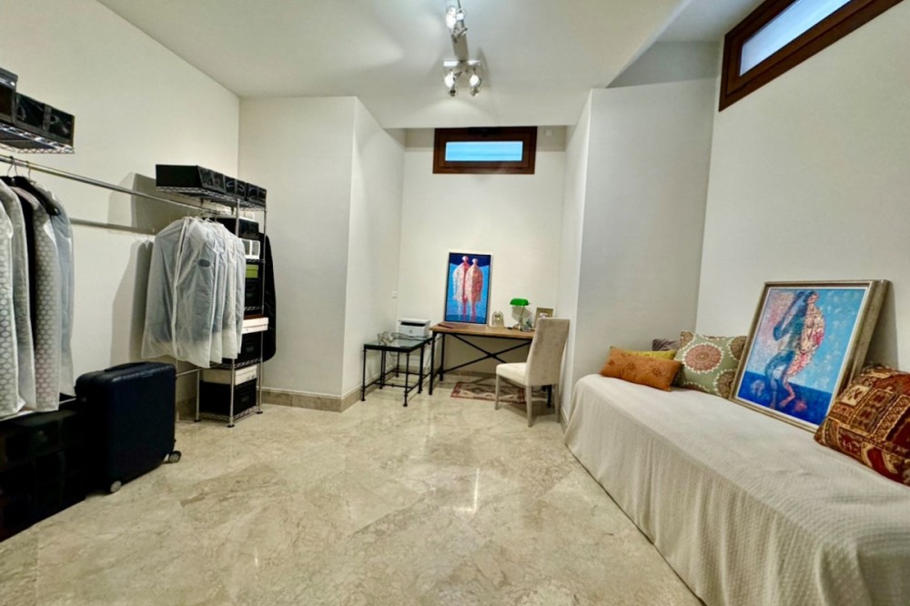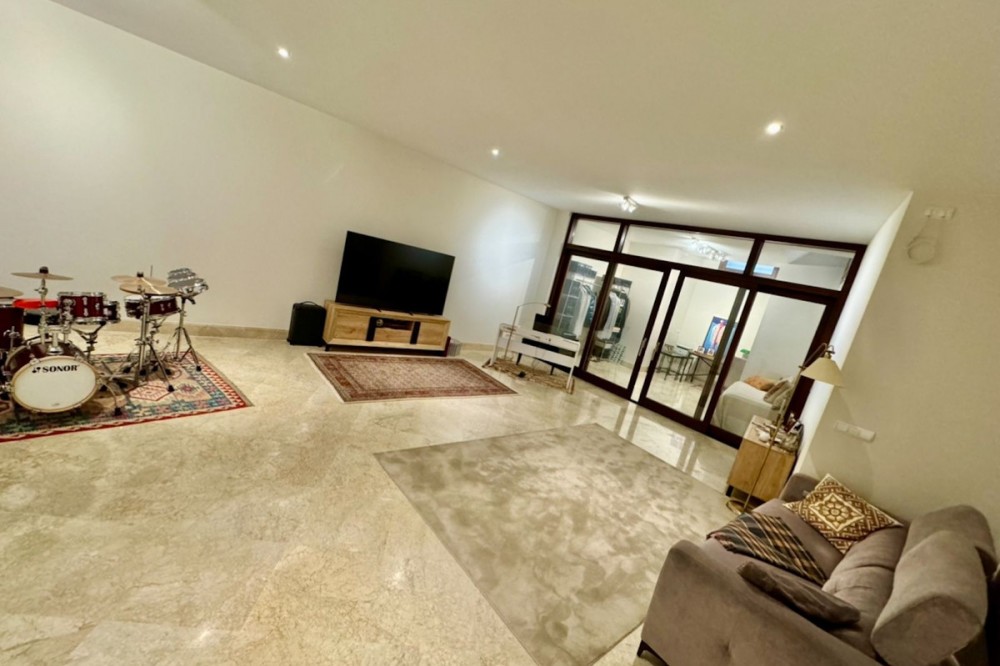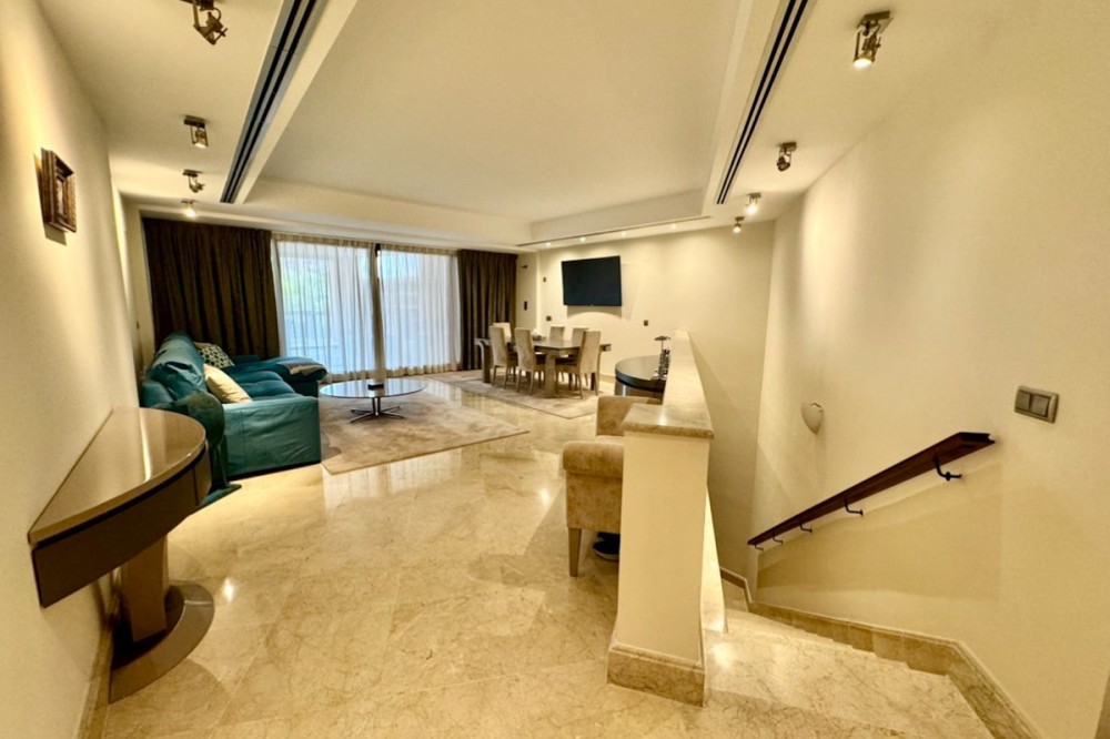 - Modern beachfront apartment in prestigious gated complex, located in San Pedro de Alcantara. This south facing apartment located on the elevated ground floor. There is a spacious living & dining area with the access to the big terrace and to the swimming pool. At the same level there is a fully fitted kitchen (with Bosch appliances), one master bedroom en-suite, one guest bedroom with access to the covered terrace, guest bathroom. Apartment has semi basement where there is another spacious living area with soundproofed music area, an office and guest bathroom. This space can be converted into a third bedroom, a gym, or any other idea. Two underground parking spaces and storage (7 m2) are included in the price. Gated complex has a big swimming pool and spectacular garden with direct access to the beach, 24hrs security and concierge service. Apartment is fully furnished with good quality Italian furniture. Glassed terraces, marble cream color floors. It is within walking distance from all kinds of shops and services, International schools and Marbella. An ideal holiday home or permanent residence!