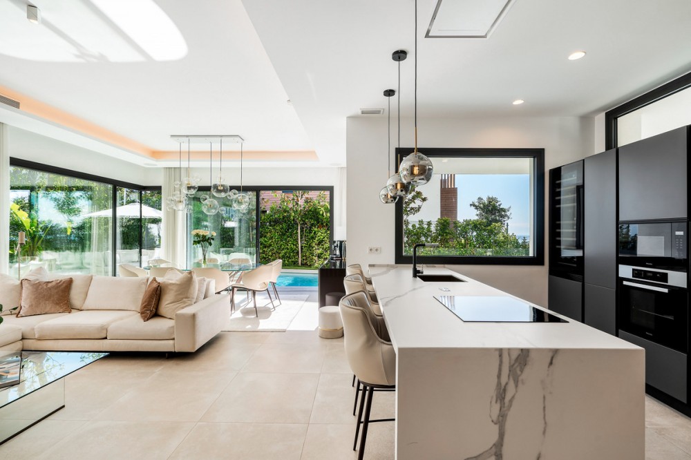 - Located in the prestigious area of Sierra Blanca, this modern villa offers a prime setting just 1.8 km from the Golden Mile’s beaches. Completed in 2022, the property combines exceptional design with the highest quality finishes, delivering sea views from every level and true luxury living in one of Marbella’s most sought-after neighbourhoods. From the moment you enter, the attention to detail is clear. A bespoke modern kitchen with fully integrated Miele appliances connects seamlessly to the open-plan living and dining area, flowing directly onto the expansive terrace, pool, and gardens. Thanks to its south to west orientation and floor-to-ceiling windows, the villa is bathed in natural light throughout the day. Only the finest materials have been used, including Porcelanosa tile flooring inside and out, triple-glazed Cortizo windows, Porcelanosa bathroom fittings, oak carpentry, and ambient lighting throughout. Comfort and convenience are guaranteed with underfloor heating across the entire home, zoned air conditioning, a domotics system for lighting and climate, and a built-in cinema-grade sound system. The outdoor areas are designed for relaxation and entertaining, with Mediterranean planting, citrus trees, and a low-maintenance rear garden with magnolias. The heated pool includes a swim current system, perfect for endless laps under the sun. The villa’s layout offers three bedrooms upstairs and one on the lower level. The master suite enjoys its own en-suite bathroom, while the two additional bedrooms share a high-spec bathroom. Each bedroom opens onto a private terrace with sea views and peaceful seating areas. The lower level features a further bedroom with en-suite, a utility room with Miele appliances, storage, and a large private garage fitted with a Tyssenkrupp car turntable for ease of access. Additional gated driveway parking adds practicality. The showpiece of the property is the spectacular rooftop solarium. With panoramic views stretching from Puerto Banús to Gibraltar and across to North Africa, this level is designed for entertainment and wellness. It includes a dining space for up to ten guests, an outdoor teppanyaki grill, a Porcelanosa kitchen with fridge, dishwasher, and island, a large jacuzzi, an outdoor shower, a Balinese bed, and a bespoke Scandinavian sauna with built-in Bluetooth. An automated retractable roof and heating panels ensure year-round enjoyment. Las Vistas 4 combines prime location, world-class qualities, breathtaking views, and exceptional lifestyle features, making it a rare opportunity to own one of Marbella’s finest modern villas.