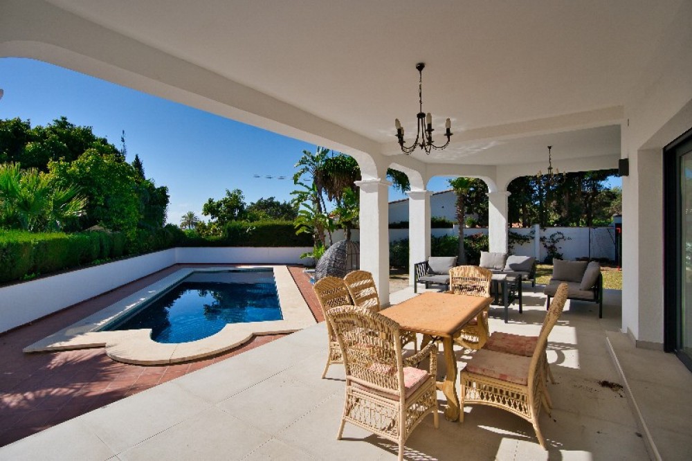 - This magnificent villa is located in one of Marbella s best beachside urbanizations; Marbesa and is a short walk to the beach and 5 beach restaurants and 1 supermarket. Also within easy walking distance the 5 star hotel Don Carlos, Nikki Beach Club, the protected nature area of Cabopino and the marina of Cabopino. This south facing villa has sea views from upstairs and is composed of 3 bedrooms en suite and is situated on a flat plot with a lovely pool and set in matura gardens with sub tropical plans and trees. The open plan kitchen is beautifully done and gives access to the spacious living room. The villa offers a carport with space for 2 cars inside the grounds. The house has been completely renovated to a high standard recently.