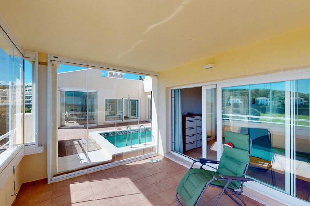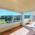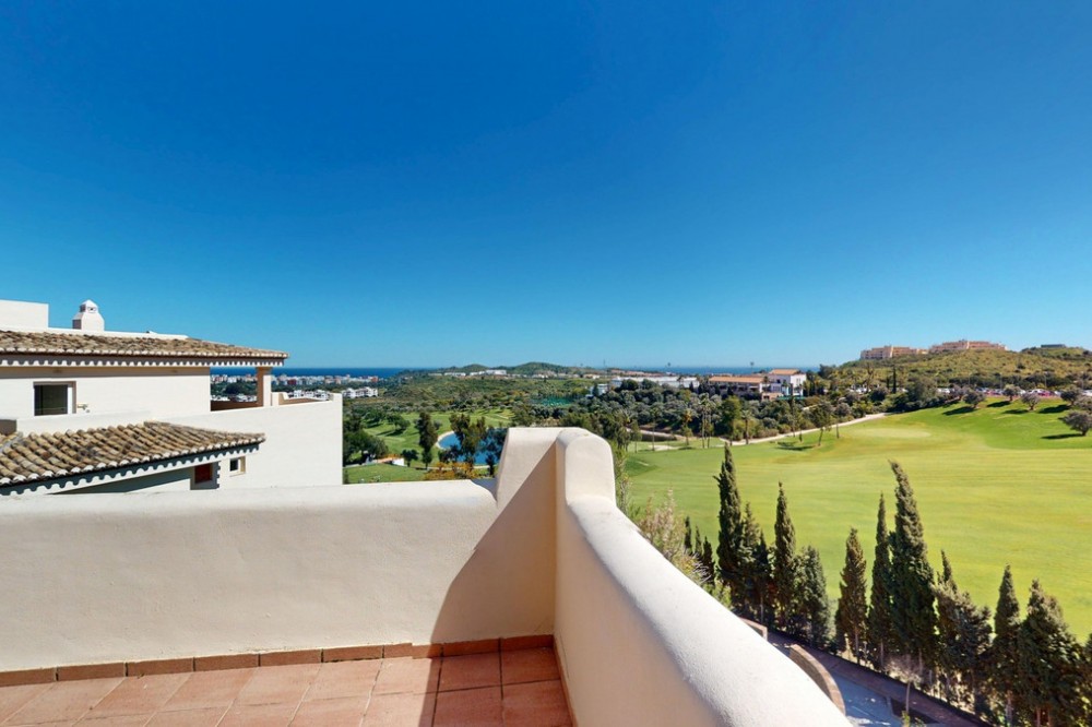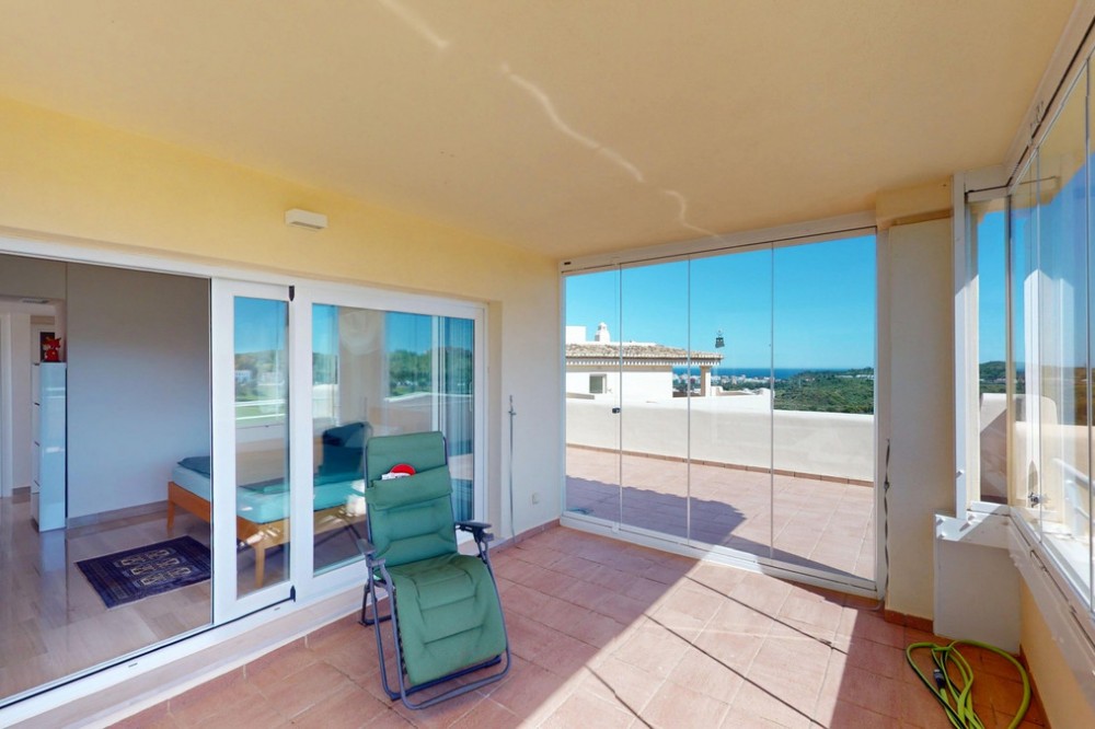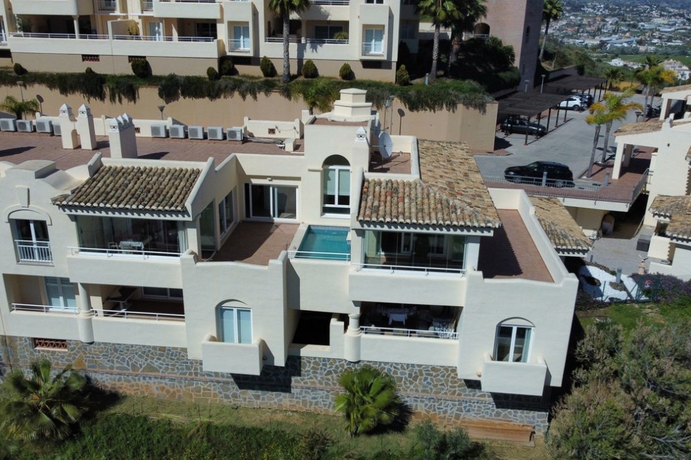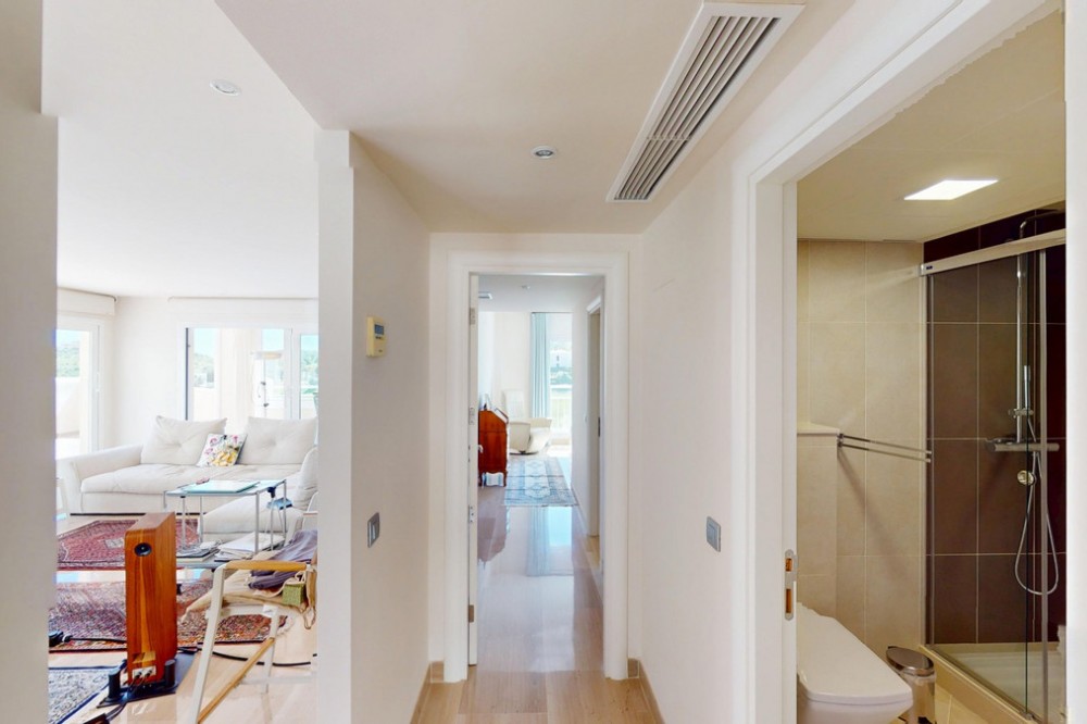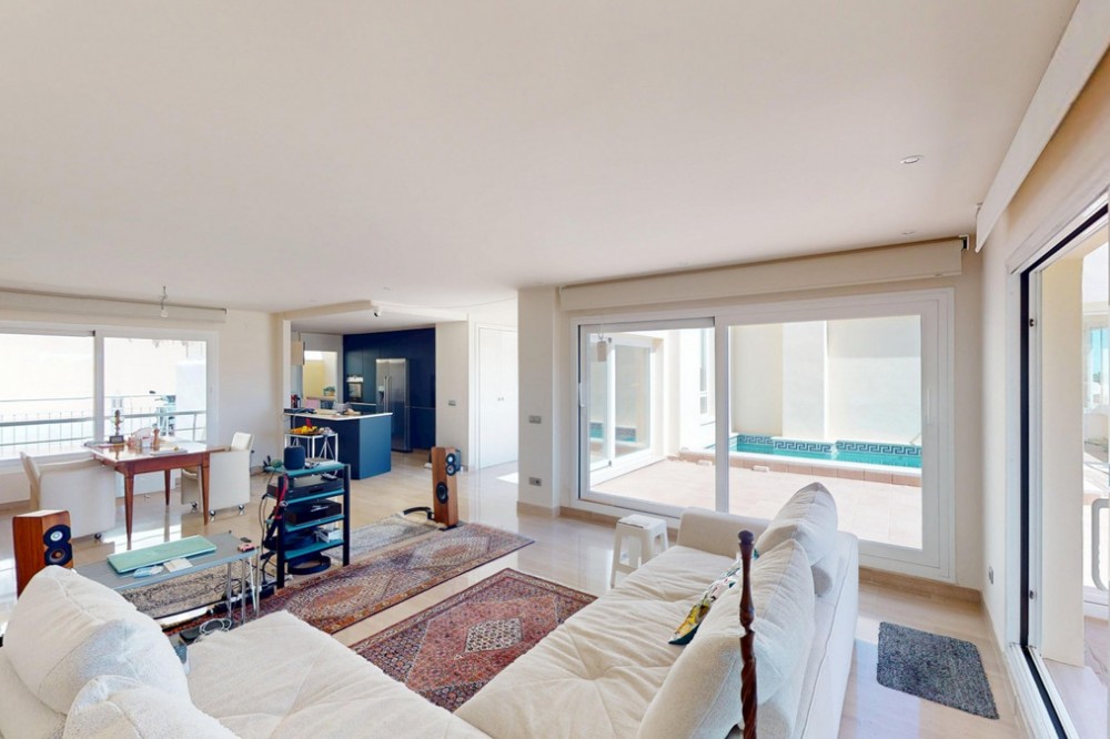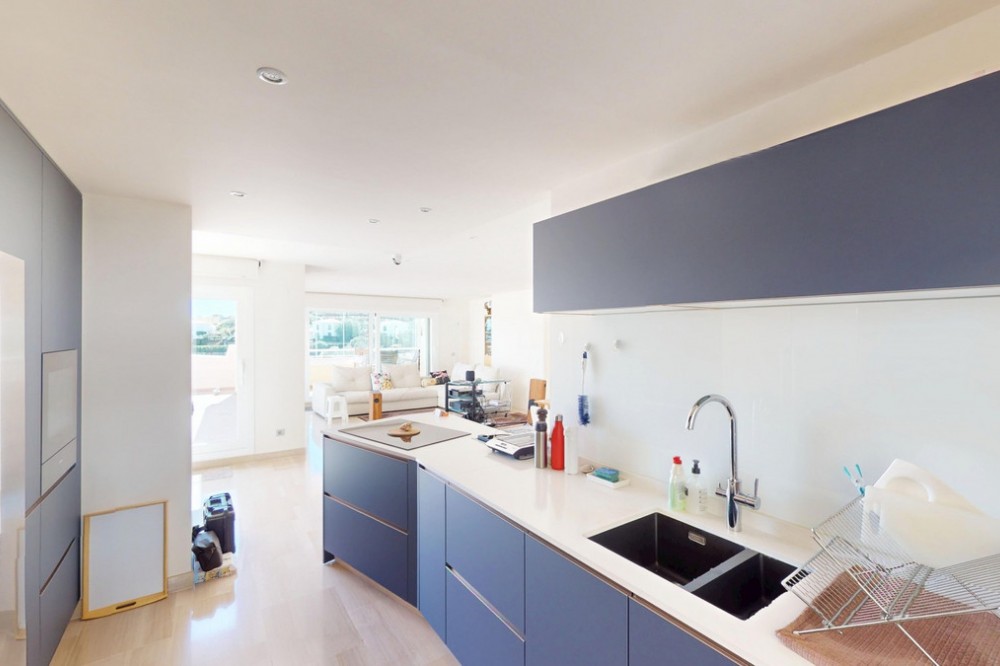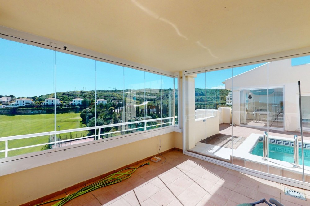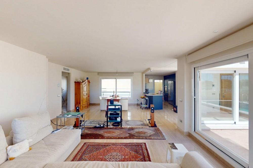 - This contemporary penthouse in Mijas, Málaga, offers a harmonious blend of comfort and style. It is located directly on a golf course and offers an impressive view of the sea, so you can enjoy both the tranquillity of the green and the panorama of the coast. The open-plan living area features floor-to-ceiling windows that flood the space with natural light and provide stunning panoramic views of the surrounding landscape. The living room is tastefully furnished with a plush white sectional sofa, accented by vibrant area rugs that add warmth to the polished floors. The sleek kitchen boasts modern navy cabinetry contrasted with white countertops and high-end stainless steel appliances, creating a sophisticated culinary space. The penthouse's three bathrooms are elegantly appointed, with one showcasing a floating double vanity in rich wood tones and a glass-enclosed shower. The primary bedroom is a serene retreat with direct access to a private terrace. It features a canopied bed, a spacious walk-in closet, and a luxurious en-suite bathroom with both a bathtub and a shower. The second bedroom offers equally impressive views and is furnished with a comfortable double bed. A dedicated office space provides a functional work area with a modern desk setup and ample natural light. The crowning feature of this property is the private terrace, complete with a swimming pool and expansive views of the surrounding hills and greenery. Additionally, the penthouse includes two parking spaces and two storage rooms. Residents also have access to excellent communal amenities, including a large swimming pool, a heated pool, and an outdoor kitchen that can be used by everyone. With its thoughtful layout, luxurious amenities, and prime location in Urbanización Cerrado del Águila, this penthouse offers a perfect balance of indoor comfort and outdoor living in the heart of Costa del Sol. We are pleased to be able to present this dream property to you soon, either personally or via virtual viewing. Because this world is unique - just like our Axarquía. In Andalusia. On the Costa del Sol. Here, on the sunny side of life...