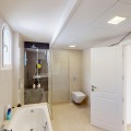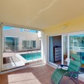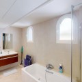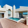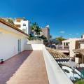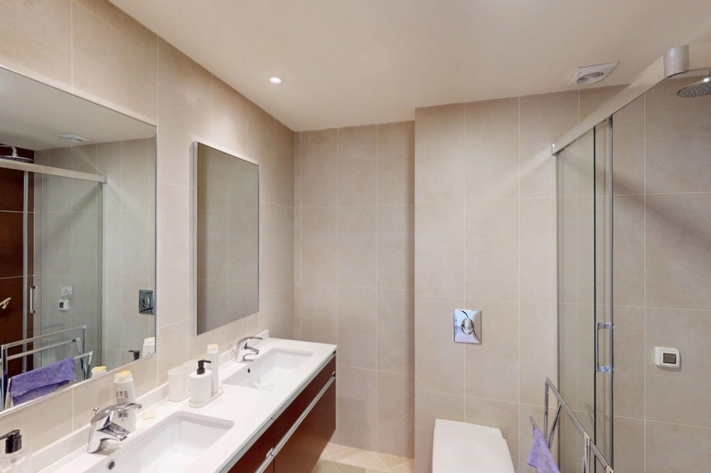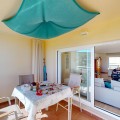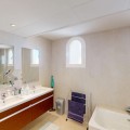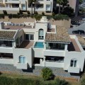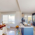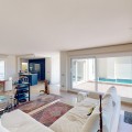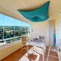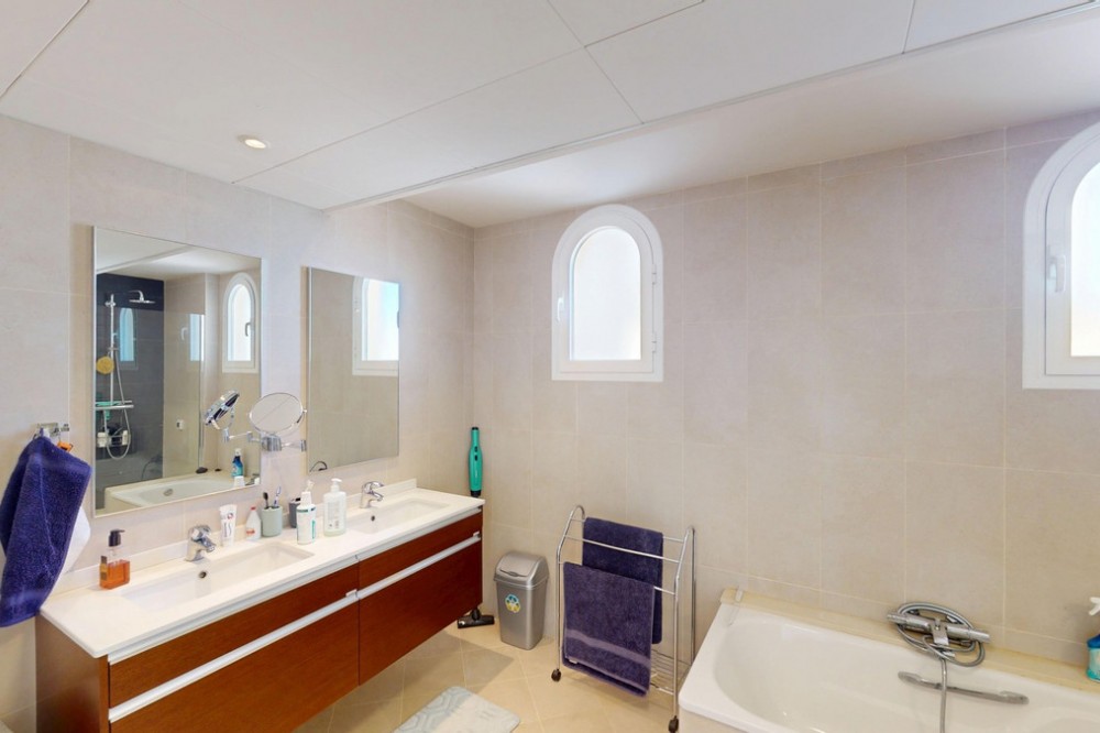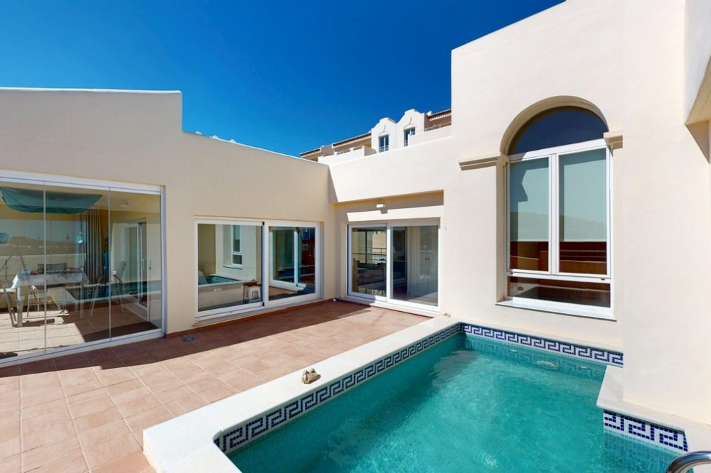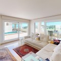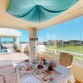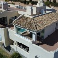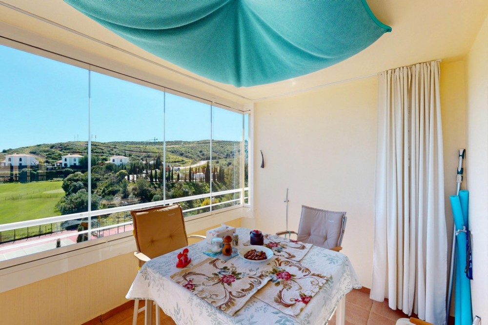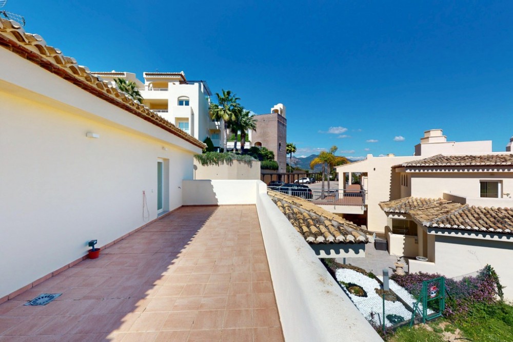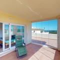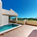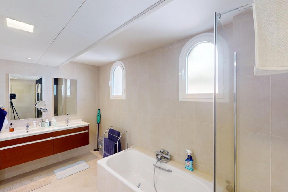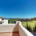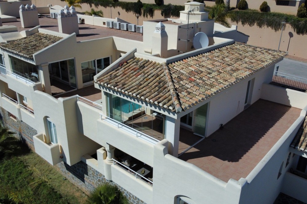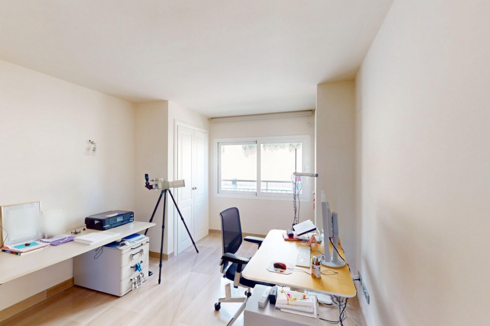 - This contemporary penthouse in Mijas, Málaga, offers a harmonious blend of comfort and style. It is located directly on a golf course and offers an impressive view of the sea, so you can enjoy both the tranquillity of the green and the panorama of the coast. The open-plan living area features floor-to-ceiling windows that flood the space with natural light and provide stunning panoramic views of the surrounding landscape. The living room is tastefully furnished with a plush white sectional sofa, accented by vibrant area rugs that add warmth to the polished floors. The sleek kitchen boasts modern navy cabinetry contrasted with white countertops and high-end stainless steel appliances, creating a sophisticated culinary space. The penthouse's three bathrooms are elegantly appointed, with one showcasing a floating double vanity in rich wood tones and a glass-enclosed shower. The primary bedroom is a serene retreat with direct access to a private terrace. It features a canopied bed, a spacious walk-in closet, and a luxurious en-suite bathroom with both a bathtub and a shower. The second bedroom offers equally impressive views and is furnished with a comfortable double bed. A dedicated office space provides a functional work area with a modern desk setup and ample natural light. The crowning feature of this property is the private terrace, complete with a swimming pool and expansive views of the surrounding hills and greenery. Additionally, the penthouse includes two parking spaces and two storage rooms. Residents also have access to excellent communal amenities, including a large swimming pool, a heated pool, and an outdoor kitchen that can be used by everyone. With its thoughtful layout, luxurious amenities, and prime location in Urbanización Cerrado del Águila, this penthouse offers a perfect balance of indoor comfort and outdoor living in the heart of Costa del Sol. We are pleased to be able to present this dream property to you soon, either personally or via virtual viewing. Because this world is unique - just like our Axarquía. In Andalusia. On the Costa del Sol. Here, on the sunny side of life...