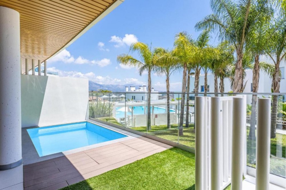 - Welcome to One Residences, Calanova Golf, Mijas. This is a unique opportunity to purchase a spacious ground floor apartment with private garden and pool, and panoramic golf, sea and mountains views, and perfect south orientation. Ample living room with open plan a fully fitted kitted kitchen and direct access to an ample, covered terrace and a private garden with pool and breathtaking views over the Calanova Golf Course. Two bedrooms, each featuring its own bathroom and direct access to the mentioned terrace and private garden, a guest toilet and an independent laundry room. Underfloor heating throughout the apartment, a home automation system, etc. are some of the property features. Two underground parking spaces and a storage room are also included in the sale price. The complex itself, an exclusive small-scale urbanization, boasts an abundance of luxury facilities; a fully equipped gym, two outdoor pools, a spa with jacuzzi, sauna and Turkish bath, a private cinema, a golf simulator, a wine cellar, a co-working space, a poolside, and finally 24/7 security with concierge services. One Residences is located just beside the Club House of Calanova Golf, La Cala de Mijas, with its professional golf-shop and excellent restaurant. La Cala de Mijas itself, is just a few minutes' drive away, offers you numerous restaurants, bars, supermarkets, another 9-hole Golf Course “La Noria”, a beautiful beach and beach clubs, and much more. Do not miss this opportunity!