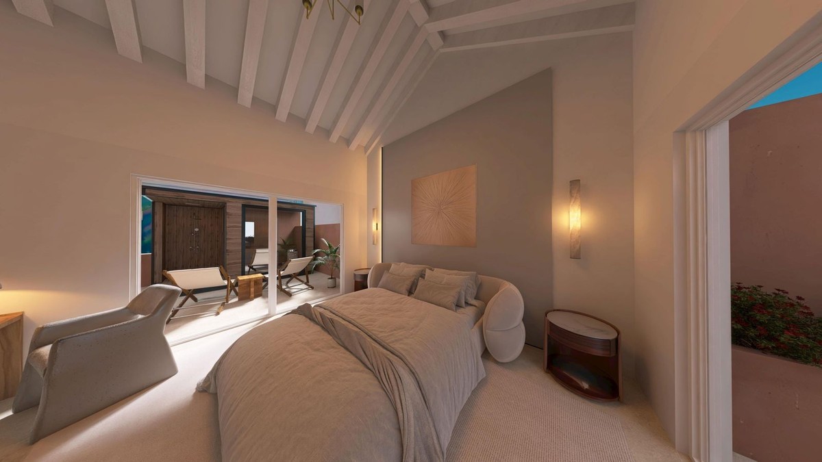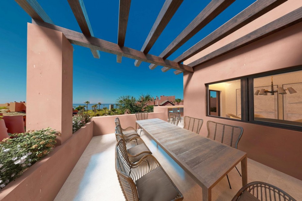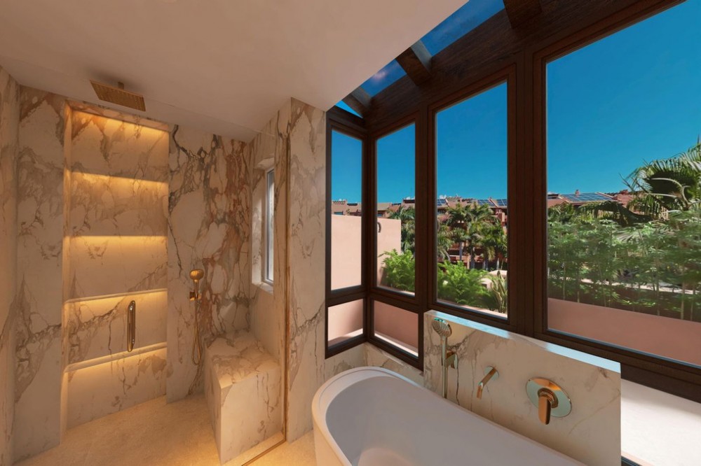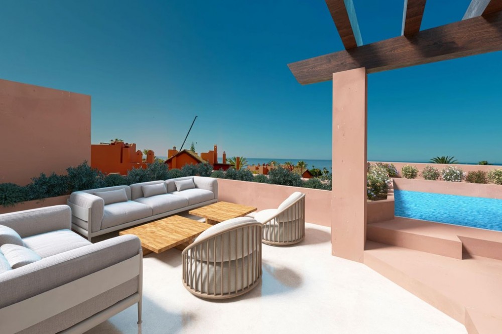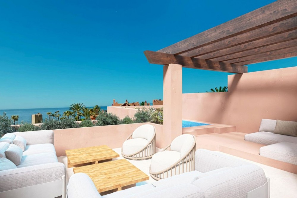 - This super-luxury, south-facing, fully renovated penthouse offers three bedrooms and four bathrooms, crafted to the very highest standards. It boasts outstanding sea views, and offers a spacious 120m2 private terrace. The 206m2 open living space is both ample and luxurious, featuring elegant flooring, a brand-new designer kitchen equipped with Miele appliances, a Bang & Olufsen sound system, custom-made wardrobes, and an electric fireplace. Perfect for those seeking refined beachfront living. Located within the prestigious Torre Bermeja community, this property benefits from beautifully landscaped tropical gardens, a peaceful atmosphere, and exceptional security standards. Residents have access to a range of premium amenities, including outdoor swimming pools, a heated indoor pool, a fully equipped gym, and spa facilities, along with 24-hour security and concierge-style services, all impeccably maintained. Set directly on the beachfront, Torre Bermeja offers immediate access to the promenade, the sea, and nearby beach restaurants, while remaining just a short drive from Estepona town centre, renowned golf courses, international schools, and Marbella. This luxury penthouse is an ideal choice as a primary residence, a sophisticated holiday home, or a secure long-term investment in one of the most established beachfront developments on the New Golden Mile.