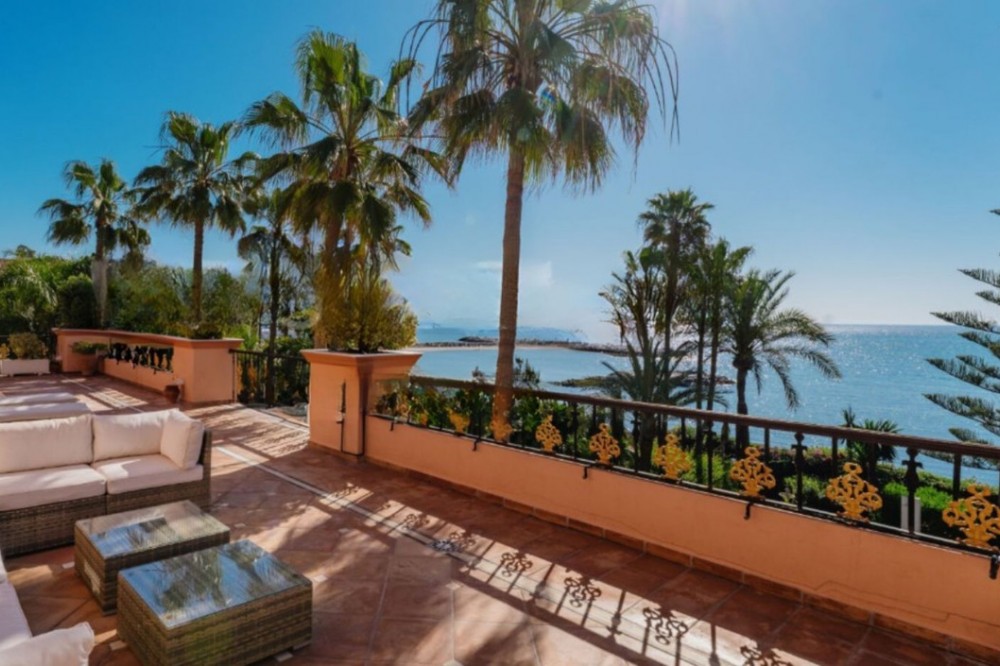 - Luxury Duplex Penthouse for Sale in Puerto Banús, Marbella Discover an extraordinary investment opportunity in the heart of Puerto Banús with this unique duplex penthouse located in the prestigious gated community of Casa Nova. Comprising two adjoining penthouses, this exceptional residence enjoys direct access to the beach and is just steps away from the vibrant marina, luxury boutiques, and acclaimed restaurants of Marbella's most glamorous district. Set within beautifully landscaped gardens with 24-hour security and a serene communal pool, Casa Nova offers the perfect blend of exclusivity and tranquillity. The property boasts spectacular panoramic views of the Mediterranean Sea and Marbella’s iconic coastline, ideal for those seeking a refined lifestyle on the Costa del Sol. The penthouse features expansive interiors flooded with natural light and designed with elegance in mind. The main level showcases three spacious living rooms, two fully equipped modern kitchens with Miele appliances, two guest toilets, and two home offices—all flowing seamlessly onto large terraces with uninterrupted sea views. Upstairs, four luxurious en-suite bedrooms provide a peaceful haven, each with direct access to sun-drenched terraces overlooking the sea. Perfect for entertaining, the extensive outdoor spaces are ideal for alfresco dining and enjoying Marbella’s year-round sunshine. Additional features include four private underground parking spaces, two storage rooms, top-tier security systems, and personalized concierge services for a truly effortless living experience. Whether hosting stylish gatherings, lounging by the sea, or indulging in the vibrant Puerto Banús lifestyle, this duplex penthouse embodies the essence of modern coastal luxury.