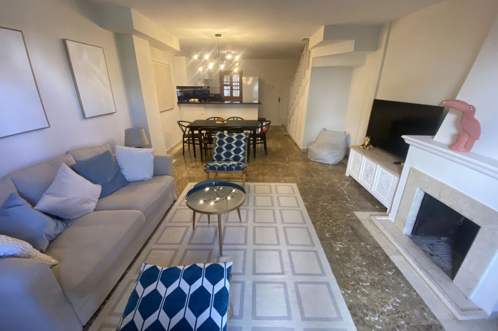 - Beautiful andalucian style townhouse located on the unique village Villacana Pueblo. Beachfront urbanization with several swimmig pools and restaurants. Walking distance to the best beach cluba such a Villa Padierma nad Mett. Townhouse is in the perfect condition - large living room with fireplace and direct access to the private garden and pool area, open plan kitchen. The second level - 2 bedrooms and 2 bathrooms.