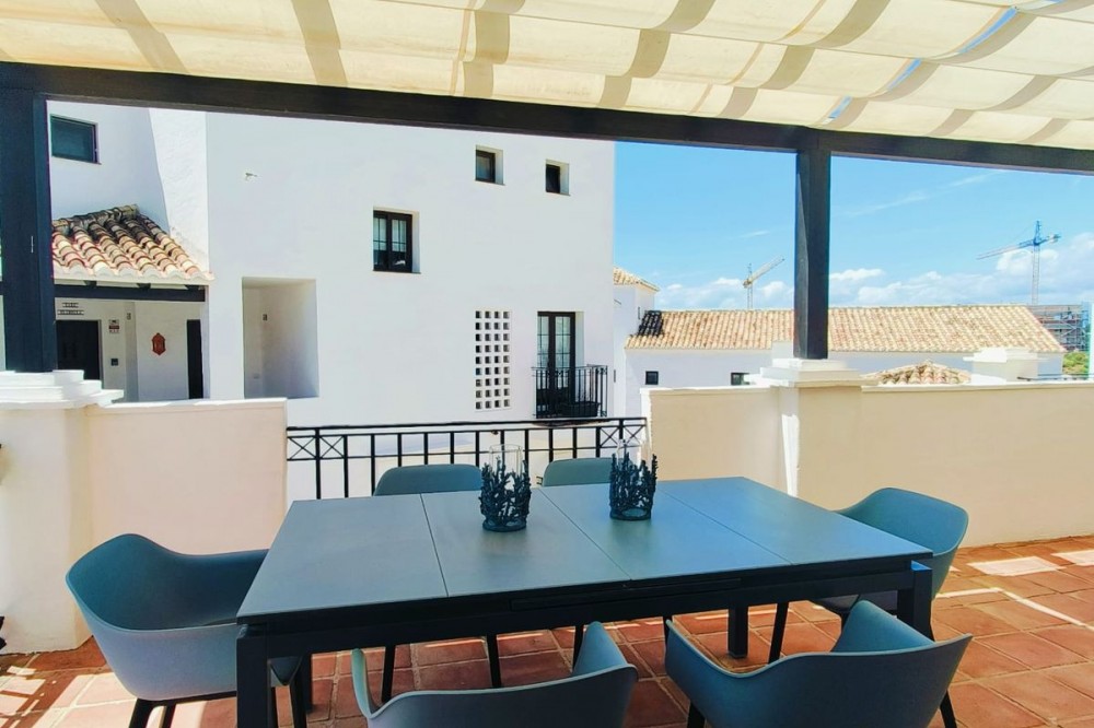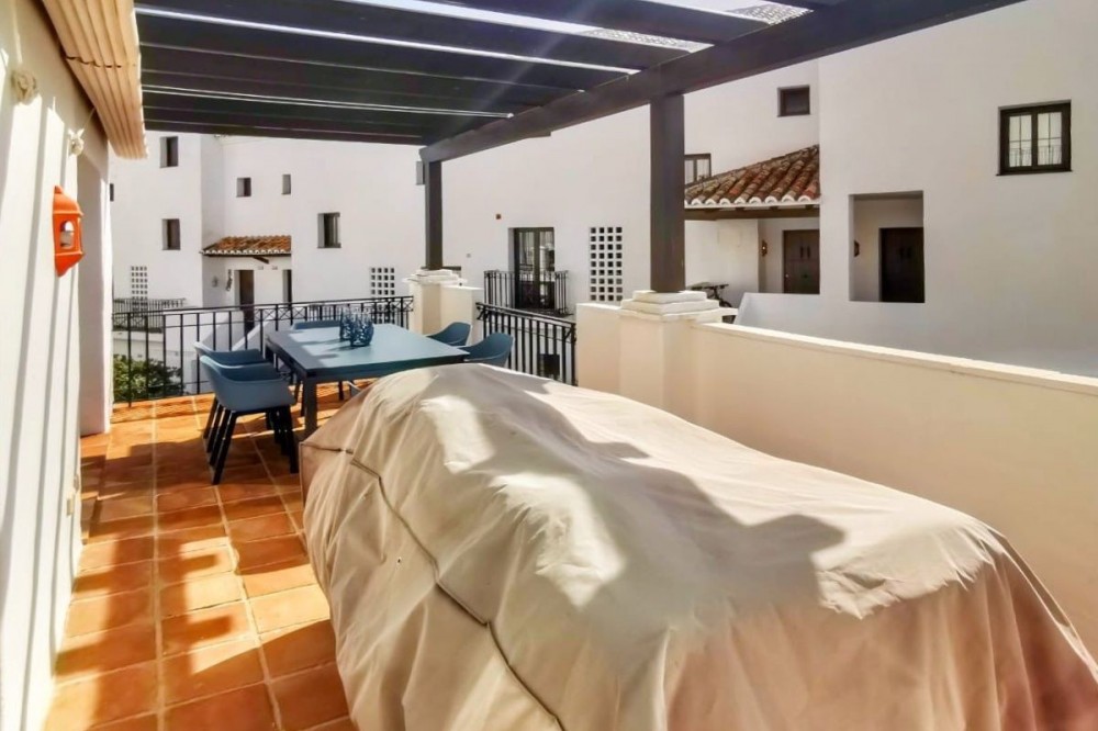 - Discover your dream home with this stunning townhouse in the prestigious Pueblo Los Monteros Urb. located in Altos de Los Monteros, Marbella. Meticulously maintained and ready for you to move in! Nestled within a secure, gated community designed in the charming style of an Andalusian village, this property offers access to a refreshing swimming pool—perfect for relaxation and leisure. This spacious penthouse boasts 4 generously sized bedrooms and 3 luxurious full bathrooms, plus a convenient guest toilet. Step into the first floor, where a welcoming entrance hall leads to a stylish staircase, a guest toilet, and a serene bedroom with an en-suite bathroom. The open-plan kitchen seamlessly flows into the elegant living-dining area, opening onto a expansive terrace—your private oasis with ample space for entertaining or unwinding. Ascend to the second floor to find two airy bedrooms sharing a full bathroom, along with another large terrace offering breathtaking views. The third floor is a true retreat, featuring the master bedroom with its own full bathroom and two private terraces showcasing sea and mountain vistas that will leave you in awe. Additional perks include a secure underground parking space and a spacious storage room, ensuring all your needs are met. Surrounded by lush nature and world-class golf courses, this penthouse is just a 7-minute drive from Marbella’s finest beaches, blending tranquility with easy access to vibrant coastal living. Don’t miss this rare opportunity to own a piece of paradise in one of Marbella’s most sought-after locations—schedule your viewing today! Indoor Built Area: 193m² Uncovered / Covered Terrace: 54m²