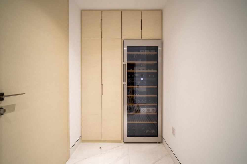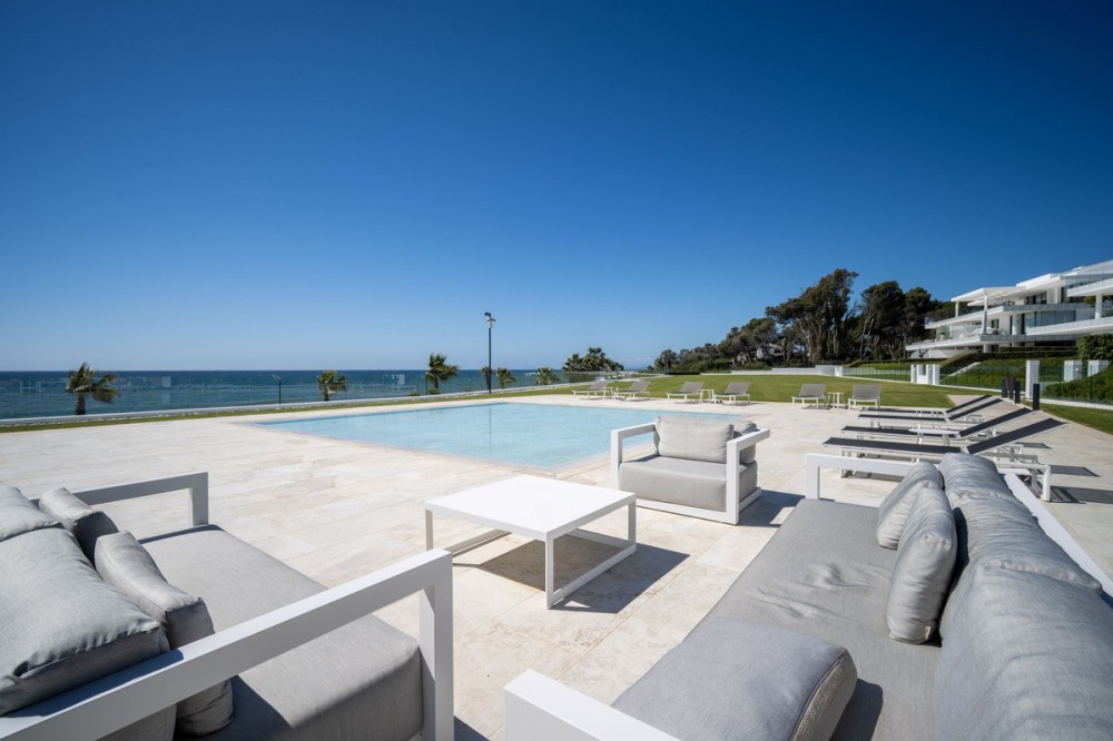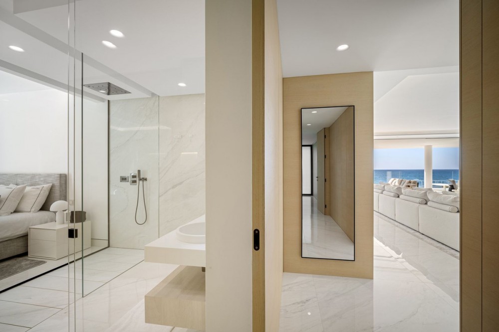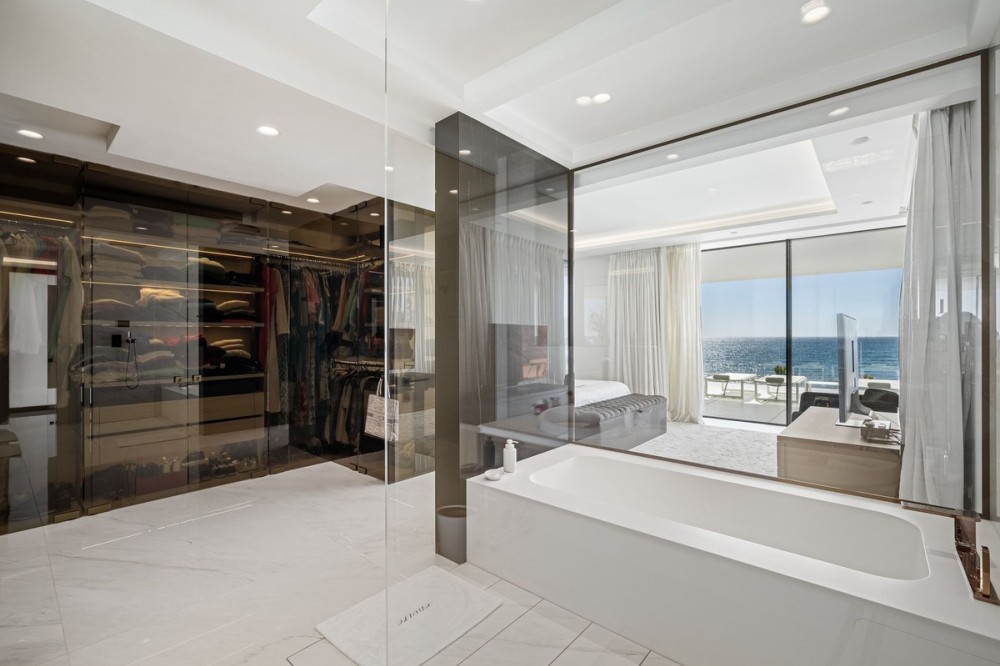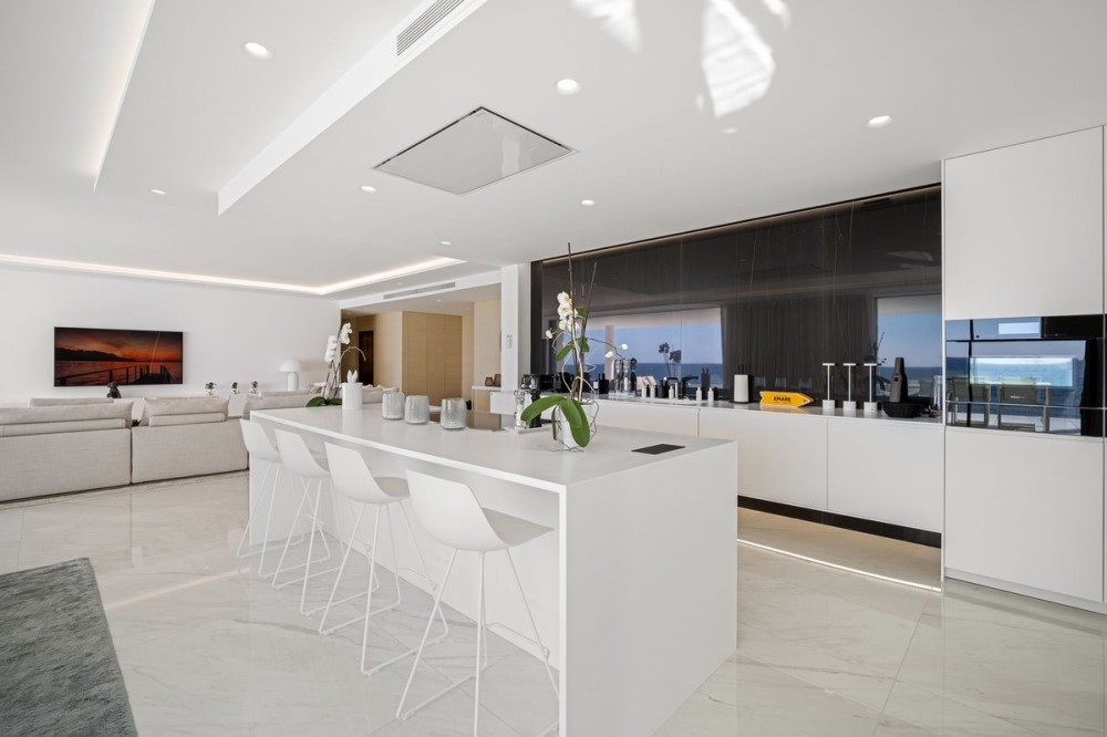 - Superb 548 m² apartment located on the seafront in Estepona, with exceptional panoramic views of the Mediterranean. It offers 5 bedrooms, 5 bathrooms (4 of which are en suite), 6 toilets, and a magnificent 129 m² private terrace facing southeast. The 309 m² interior boasts impressive high-end amenities: marble floors, underfloor heating throughout the apartment, including the basement, a home automation system, a Sonos audio system, high-speed internet, a dressing room, a wine cellar, and a covered terrace. The private elevator provides direct access to a large basement, ideal for a bedroom, a wellness area, a home theater, or a games room. A private gym completes this unique space (Technogym equipment). Exterior amenities include 4 parking spaces in a secure garage, direct access to the beach, a heated saltwater pool, and a communal garden and pool. The residence boasts a high level of security, with guards, camera surveillance, controlled access, and concierge services. Located near shops, restaurants, golf courses, and schools, this rare property combines comfort, elegance, and serenity in an idyllic setting.