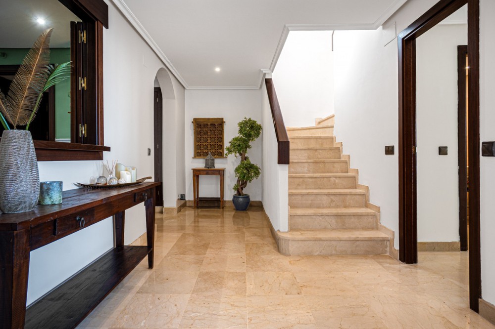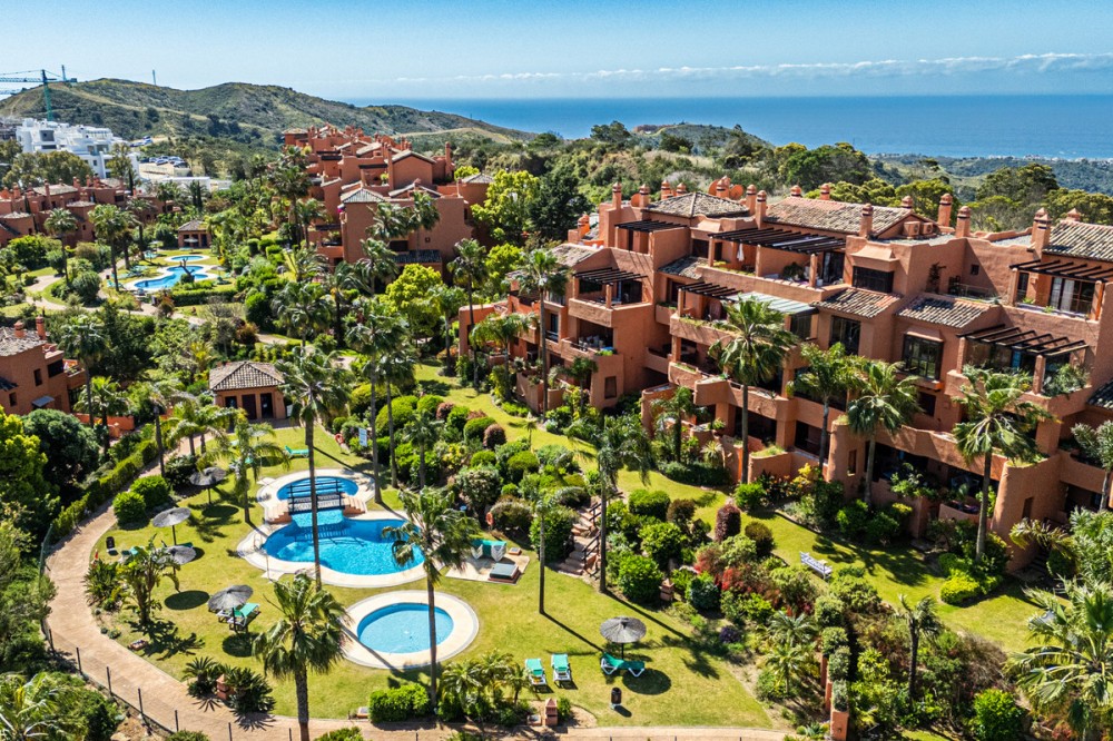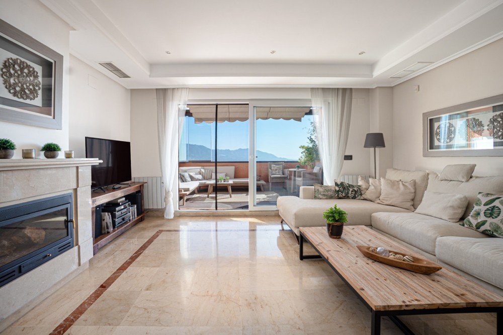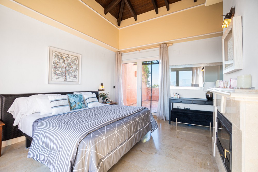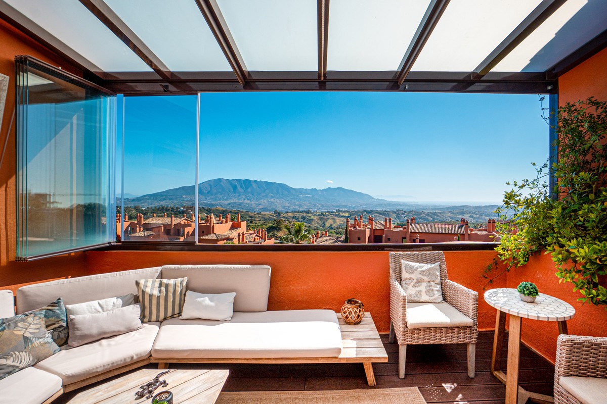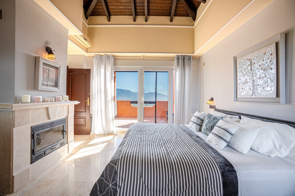 - Penthouse Greenvalley is a luxury duplex in Marbella with breathtaking panoramic views. The home features three terraces, three bedrooms, and elegant modern finishes. The spaces are bright and open, designed for comfort and natural light throughout the day. Located in an exclusive golf community, this home combines privacy, style, and access to world-class amenities. Inside, every detail reflects quality and sophistication. The kitchen is fully renovated with premium appliances and a practical layout. The living area includes a fireplace and a glass-enclosed terrace perfect for year-round use. The master suite offers a private retreat with its own fireplace, walk-in closet, and spa-style bathroom with hydromassage bathtub. Each room has air conditioning and smart heating for complete comfort. Residents enjoy access to lush gardens, four swimming pools, a gym, spa, tennis and paddle courts, and a private clubhouse with a restaurant. The property is surrounded by natural beauty, just minutes from Marbella’s beaches and top golf courses. Penthouse Greenvalley delivers a modern lifestyle where elegance meets tranquility — ideal for those seeking luxury living on the Costa del Sol.