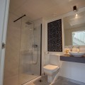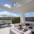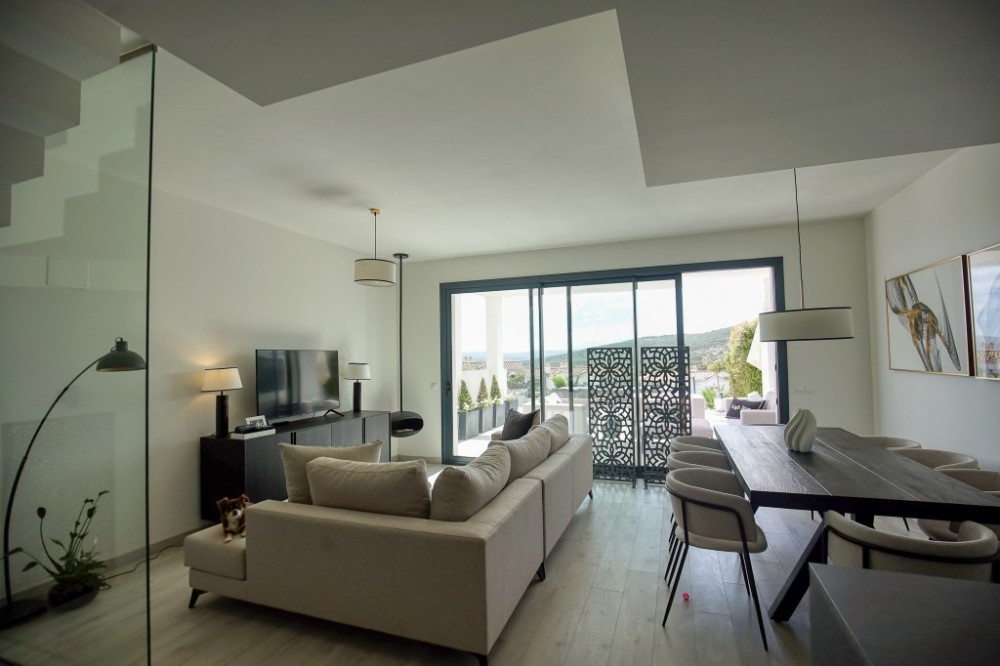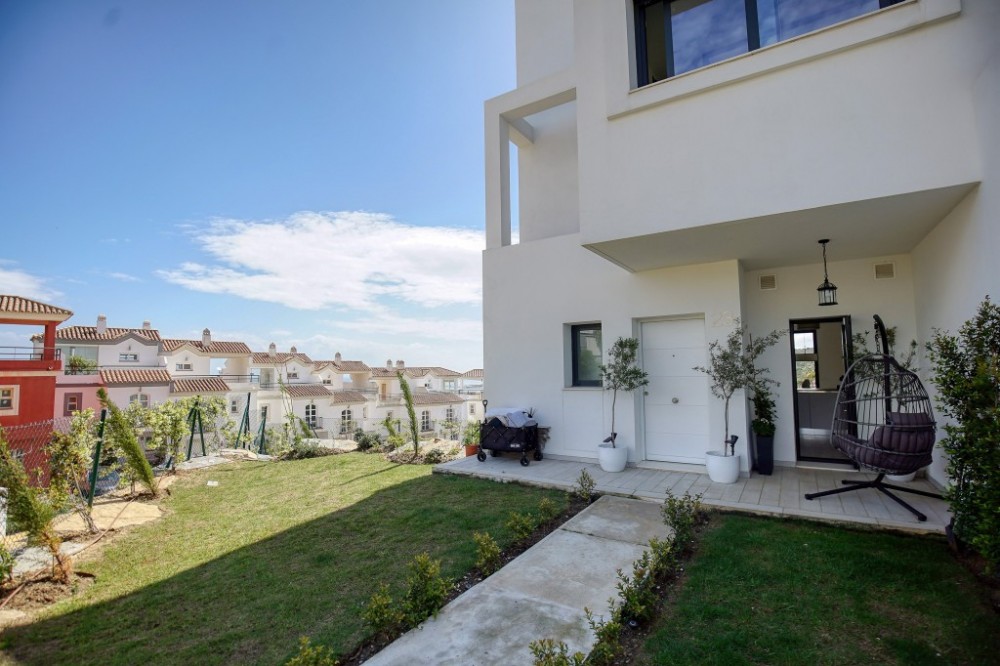 - This exceptional 3-bedroom, 2-bathroom corner residence offers an unbeatable combination of panoramic sea views stretching toward the mountains, abundant outdoor space, and standout privacy. Positioned in one of the most desirable spots within a modern, gated development, this home features a spacious private garden that wraps around the property—perfect for entertaining, outdoor dining, or simply soaking up the sun. A true highlight is the private rooftop terrace, where you’ll find a luxurious jacuzzi and a large sunbed—ideal for enjoying sunset views, starlit evenings, or relaxed afternoons with complete privacy. Inside, the bright open-plan living area connects effortlessly with the outdoor zones through floor-to-ceiling sliding doors, creating a seamless indoor-outdoor flow. The fully equipped kitchen, stylish bathrooms, and quality finishes throughout reflect a refined yet relaxed lifestyle. As a corner unit, this home benefits from extra natural light, enhanced privacy, and more outdoor space than standard units. Additional features include a private garage, access to a well-equipped resident gym, and beautifully maintained communal areas. A rare opportunity to own one of the top-tier properties in the development—perfect as a permanent residence, holiday escape, or investment.