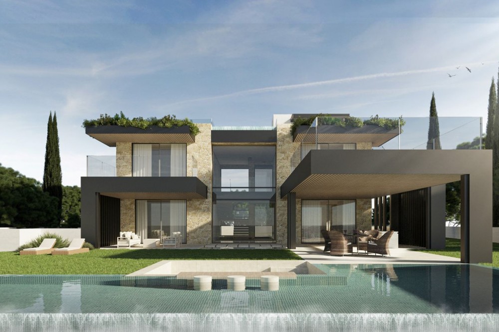 - New Development: Prices from €7,300,000 to €7,300,000. [Bedrooms: 7] [Bathrooms: 8] [Built size: 720m2]. This villa is in a private gated community. This splendid luxury villa project is set on a private plot of 1,550 m², located just a few minutes from Puerto Banús in the exclusive area of Altos de Puente Romano on the Golden Mile. A majestic entrance with a water feature welcomes you into this wonderful property. The large windows bring in abundant natural light throughout the villa and create a seamless connection between the indoors and the surrounding nature. Its wide entrance opens to a spacious and bright living-dining room with a fireplace and a functional luxury kitchen fully equipped with high-end finishes. From the living/dining area, you have access to a large, partly covered terrace featuring various lounge and seating areas, including a firepit area by the pool. The outdoor area also includes a bar and an outdoor kitchen, a large 70 m² heated saltwater pool, and lush gardens. The house offers 7 large bedrooms, all with en-suite bathrooms, including a studio apartment. There are 3 bedrooms in the basement with exterior windows and natural light, one bedroom on the ground floor, and 3 on the first floor. One of these is a very spacious master suite with a dressing room and a large en-suite bathroom with both a bath and a shower. An elevator connects all floors, from the basement to the solarium, where you will find multiple areas for sitting, dining, and sunbathing next to the plunge pool/jacuzzi. You can also enjoy a drink at the rooftop bar, which includes an outdoor kitchenette. There is an additional shower room on this level. Other features include: - Underfloor heating throughout the entire house - Hot/cold air conditioning controlled by an aerothermal system - A gas open fireplace - A large lift for 4 people - A sauna - A gym - A garage large enough for 3 cars Completion is expected by February 2026.
