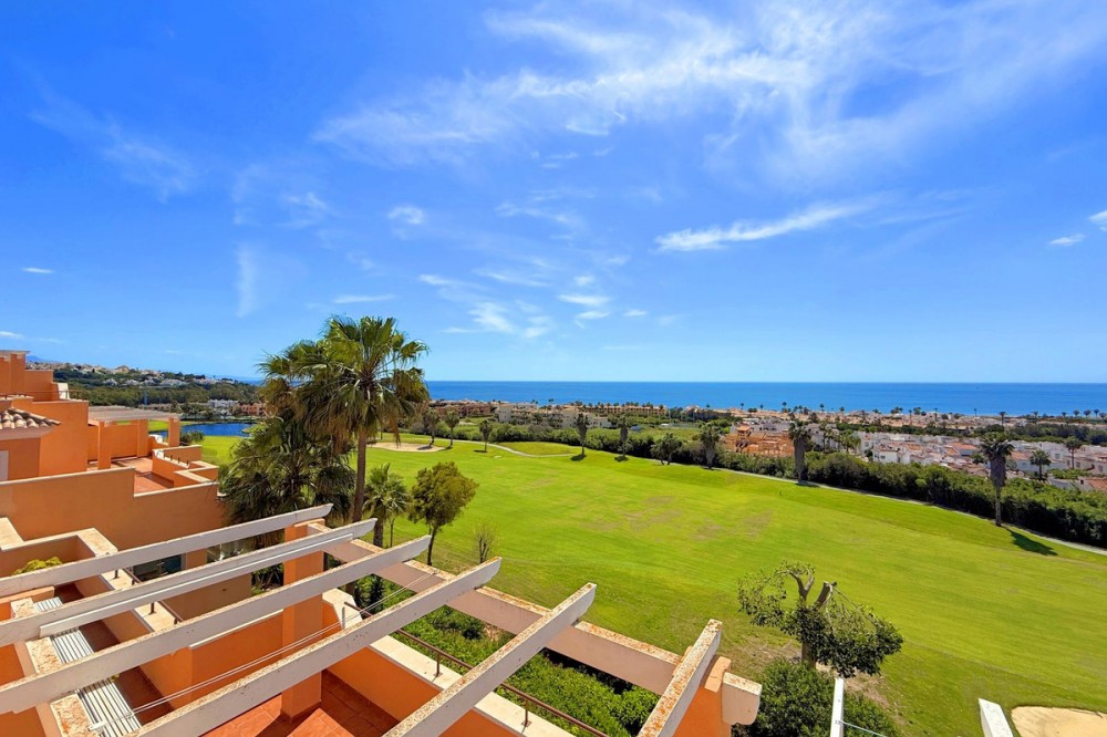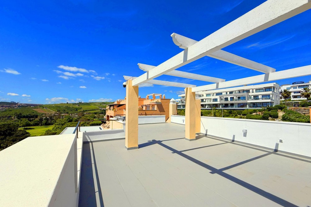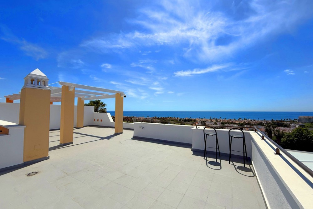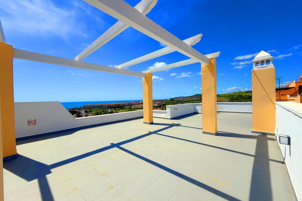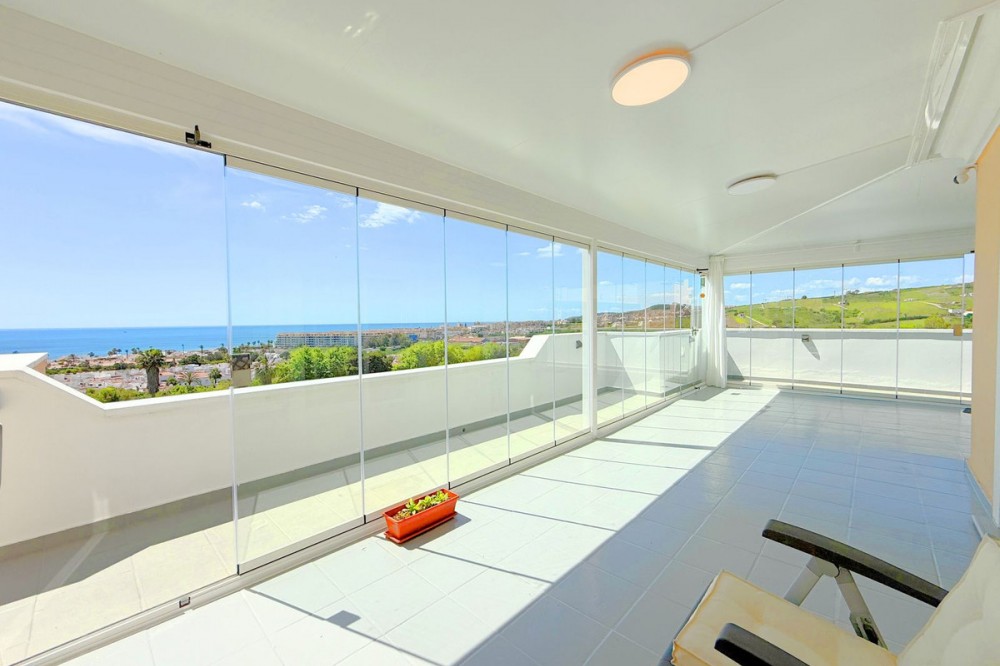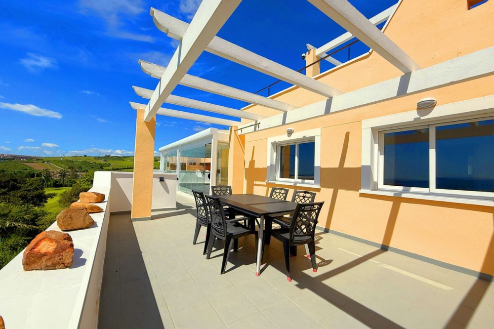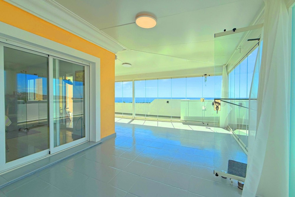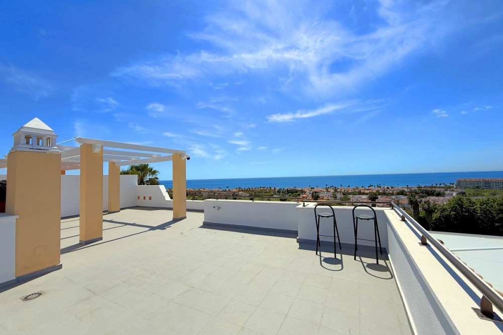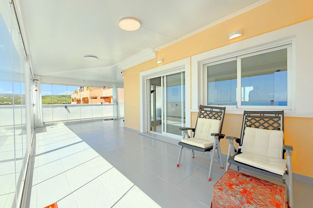 - PENTHOUSE WITH SPECTACULAR PANORAMIC VIEWS OF THE SEA AND GOLF COURSE Located in the El Mirador de Doña Julia development, this bright and cozy penthouse is set in a peaceful area surrounded by nature with excellent connections—ideal both as a permanent residence and as an investment. The property stands out for its stunning terrace with a glazed area and solarium, offering breathtaking panoramic views of the sea and the beautiful Doña Julia golf course. The home features a modern and functional layout with an open-concept living room and kitchen, two spacious bedrooms (one with an en-suite bathroom), a second full bathroom, and a separate laundry room. A garage space and storage room are also included. Thanks to its orientation and large windows, the property is flooded with natural light throughout the day, further enhancing its exclusive and comfortable character. This is a perfect opportunity for those seeking quality of life, endless views, and a peaceful setting without giving up proximity to all services. Don’t miss the chance to come and visit!