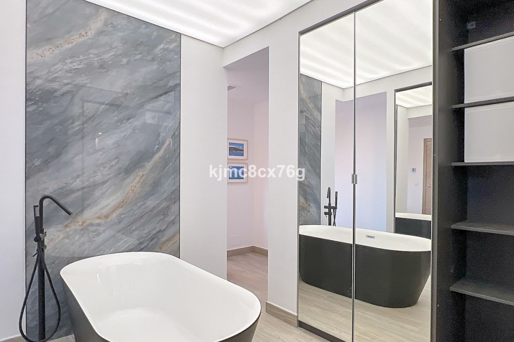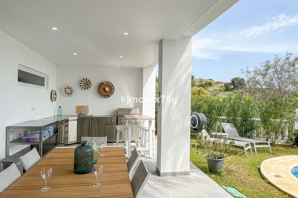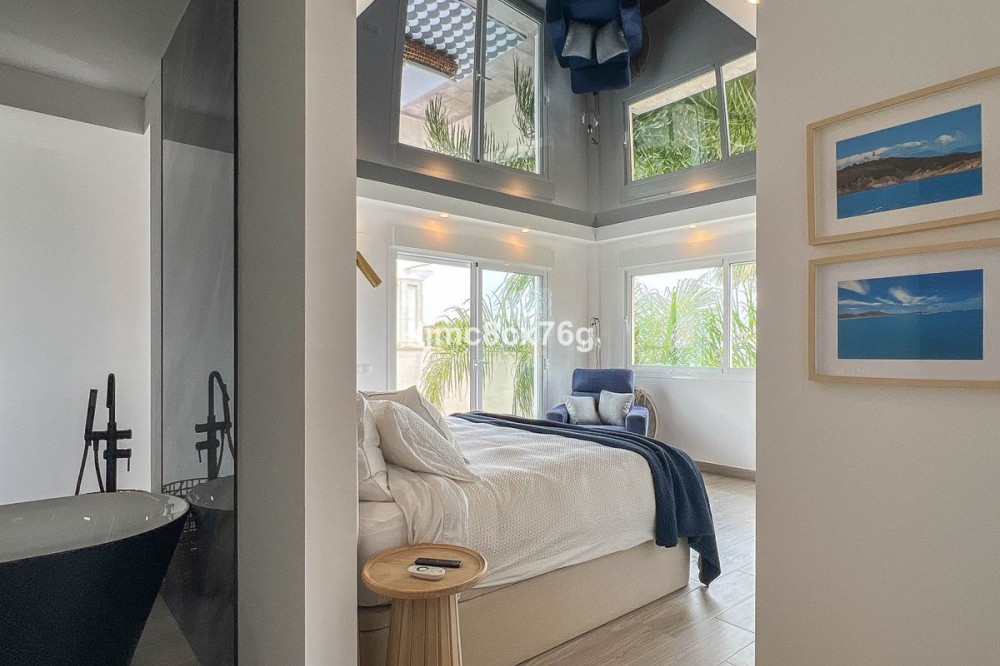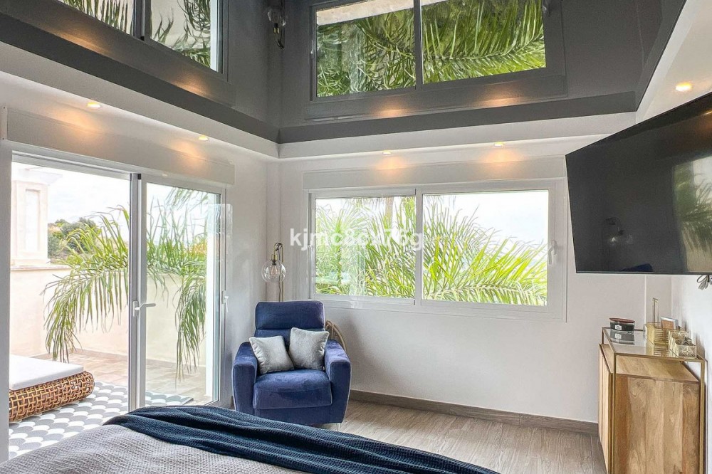 - FOR SALE – STUNNING LUXURY VILLA IN THE UPPER PART OF RIVIERA DEL SOL Set within an exclusive gated community of just 25 properties, this spectacular detached villa has been recently renovated to the highest standards and tastefully decorated throughout. Ideally located just 2 minutes from the prestigious Calanova Golf Club and 5 minutes from La Cala de Mijas, its beaches, restaurants, and amenities. Layout: Street level: Elegant entrance porch, spacious entrance hall, guest toilet, office, fully fitted kitchen, and open-plan living-dining area with direct access to a breathtaking glazed terrace with panoramic sea views and abundant natural light. First floor: Rest area with two double bedrooms, built-in wardrobes, and private terraces. The master suite is a haven of luxury, featuring a private terrace with jacuzzi, walk-in closet, and a spa-style bathroom designed for total relaxation. Garden level: A true entertainment floor for family and guests, with home cinema, bar and wine cellar, gym, full bathroom, laundry room, storage space, and two additional bedrooms with direct garden access. The outdoor terrace includes a full kitchen and industrial BBQ. The garden surrounds the property, crowned by a generous private pool. Features and extras: Macael marble flooring, white PVC windows with automatic shutters, high ceilings, fireplace, A/C and heating with independent systems, alarm with cameras, jacuzzi, home cinema, outdoor kitchen, wine cellar, 3,000L water tank and much more. Don’t miss this opportunity – this is your dream home. Live in luxury and comfort in a truly exceptional setting