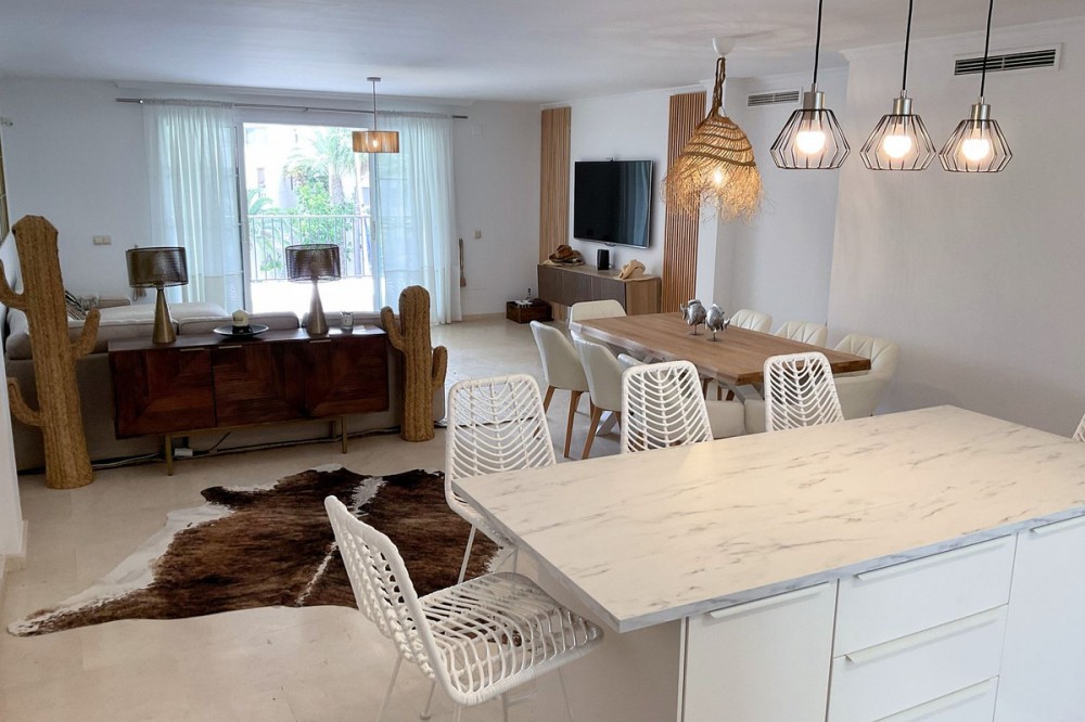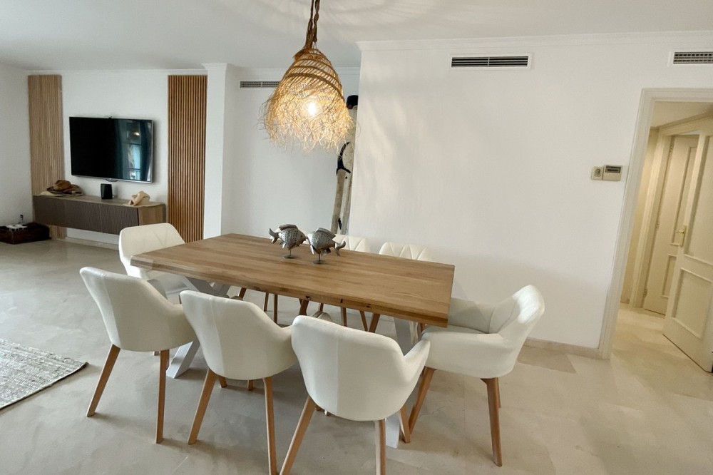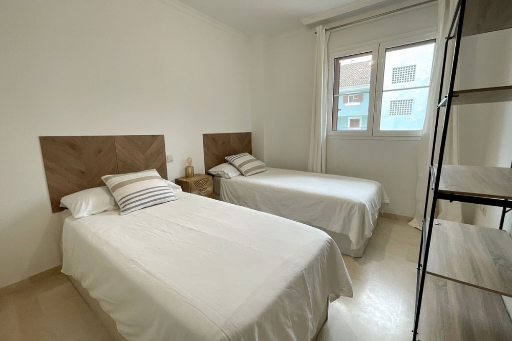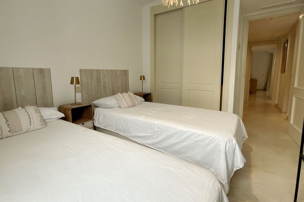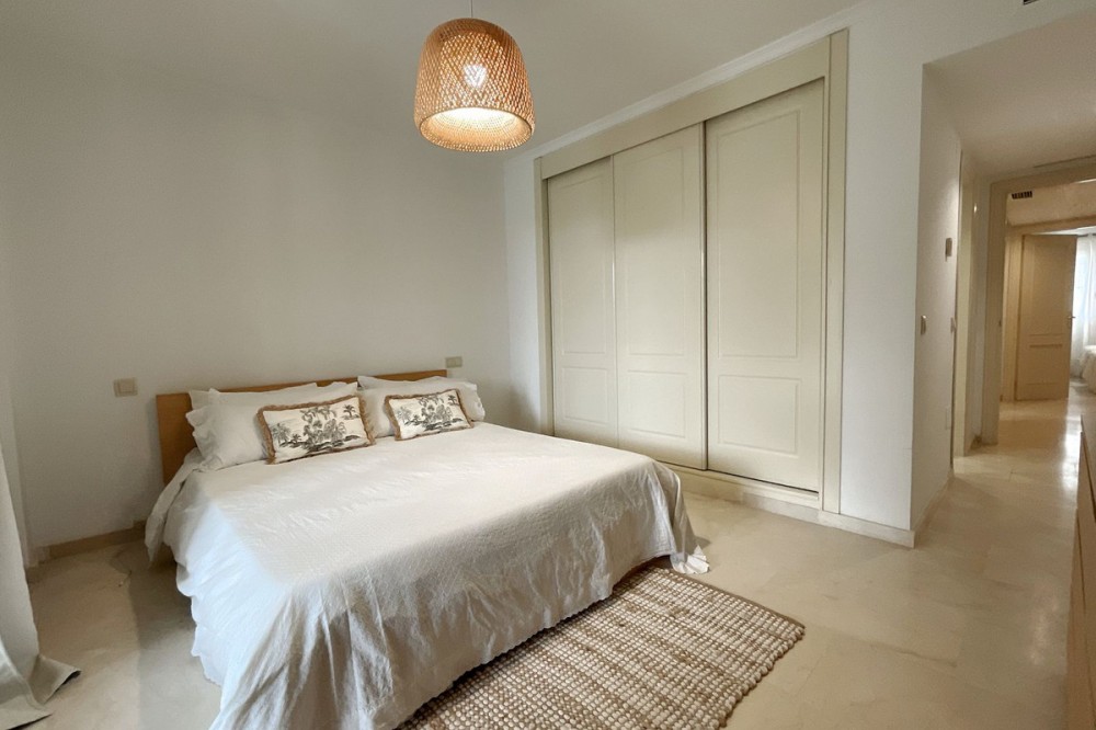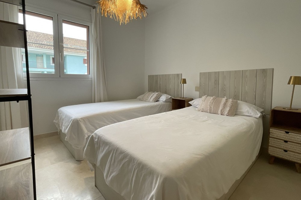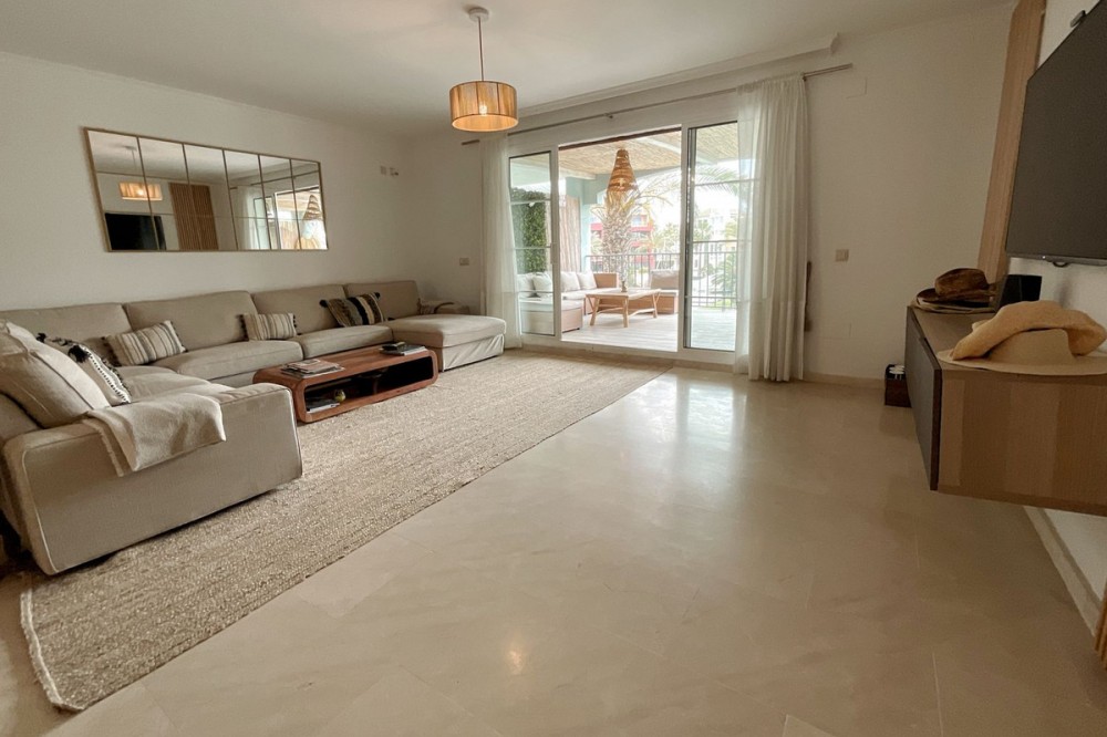 - Spacious and bright 3-bedroom, 2-bathroom apartment on the second floor, located on one of the exclusive islands of the prestigious Sotogrande Marina. Recently renovated, it features a light and relaxed style. Its soft tones enhance the generous spaces of the living area and terrace, which, when the doors are open, merge into a seamless open space of over 70 m² dedicated to leisure and socializing. The covered terrace offers 10 linear meters of panoramic views over the marina, allowing you to enjoy cool afternoons and glamorous drinks even on the hottest summer days. The master bedroom includes an en-suite bathroom, and the two additional bedrooms each accommodate two single beds—making this apartment ideal both for holiday getaways and year-round living. A lovely pool at the heart of the complex completes this beautiful property. In addition to its massage jets, it stands out as the only pool in the Sotogrande Marina that remains open all year round. The spacious garage space provides access to a large storage room—perfect for keeping beach gear, golf clubs, tennis equipment, and everything else you need to enjoy Sotogrande. Come see it before it disappears from the market.