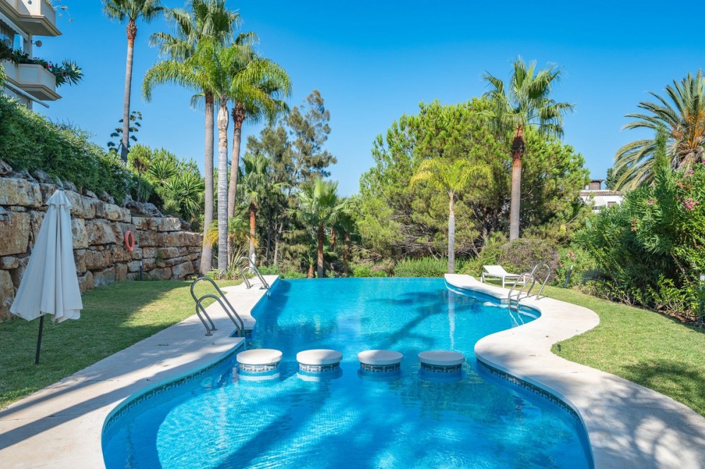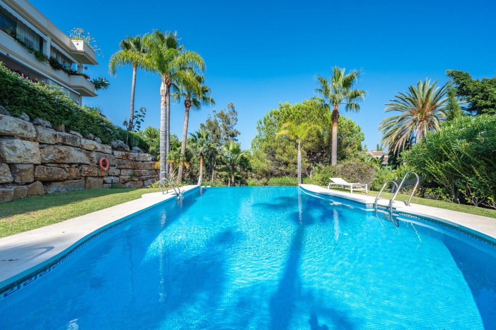 - This spacious apartment is located within an exclusive development in Las Lomas del Marbella Club, on Marbella’s prestigious Golden Mile — just 2 minutes from Puente Romano and the beach. The gated complex features only 14 premium apartments and penthouses, surrounded by lush tropical gardens and a peaceful communal pool. The apartment offers 4 generously sized bedrooms with en-suite bathrooms and a bright living area that opens onto a large south-facing terrace with sea views. The terrace is also accessible from the master suite and a second bedroom currently used as an office. There are two fully equipped kitchens, one of which connects to the living space, offering a practical layout for family living or entertaining. Additional features include underfloor heating, air conditioning, two underground parking spaces with lift access, and a storage room.