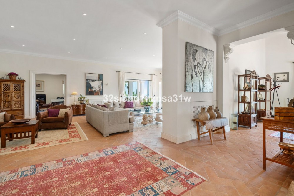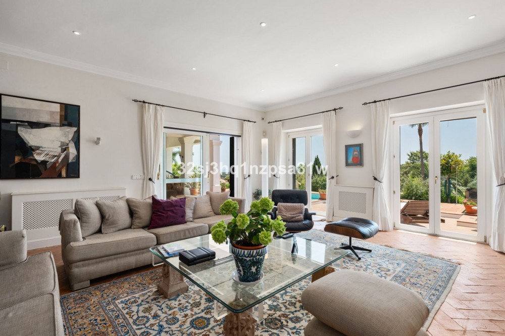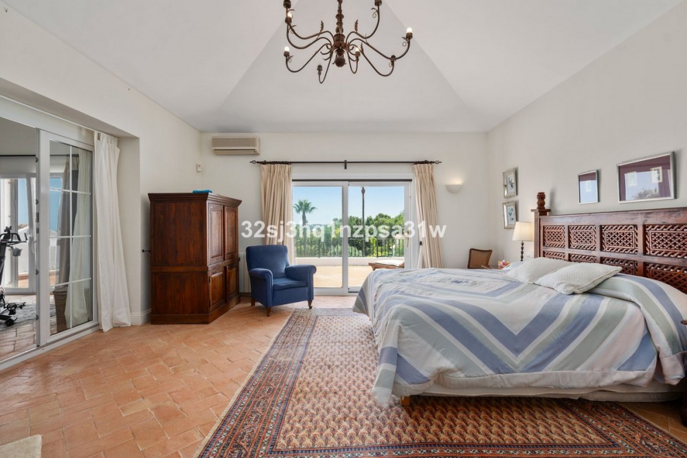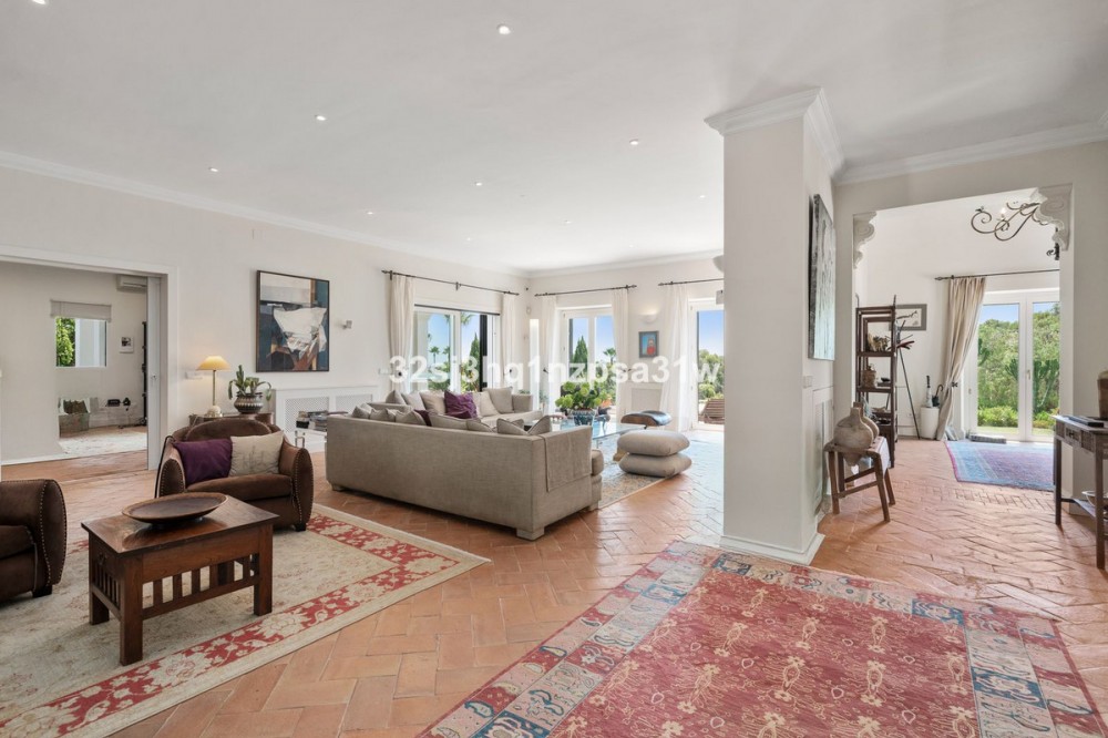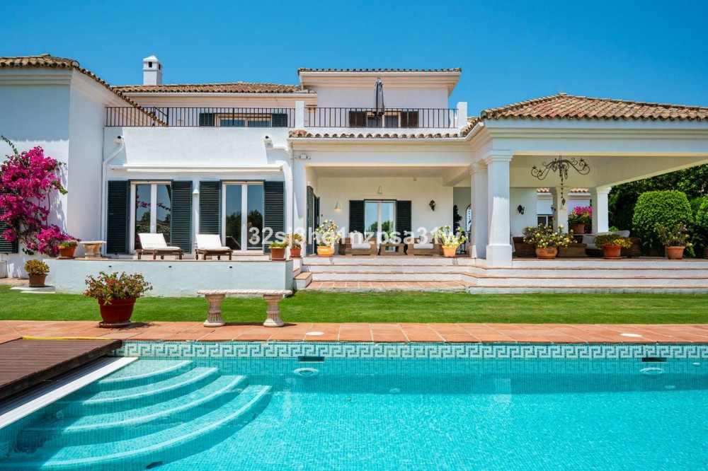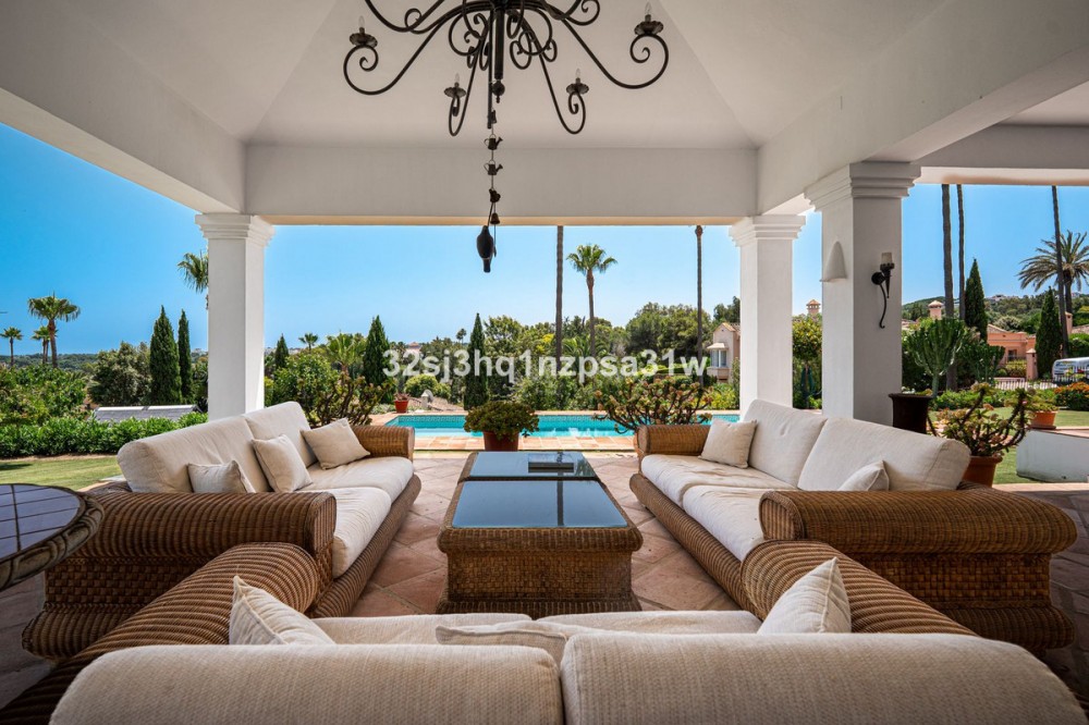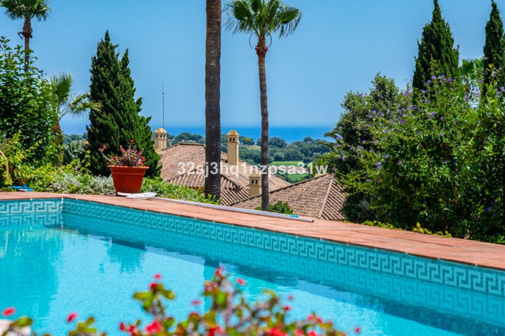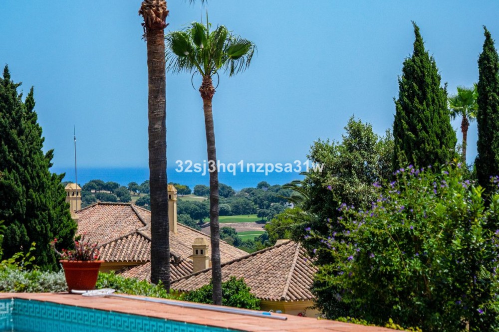 - EXCLUSIVE PROPERTY This stunning south-facing villa with pool, sea & golf views is located in Sotogrande Alto, set on a 2,090 m² plot with 622 m² of built area. It boasts breathtaking sea views and enjoys a prime location near the SO-Hotel, Real Club de Golf Valderrama, and Sotogrande International School. The property features 5 bedrooms, including a spacious master suite on the upper floor with fireplace, en-suite bathroom, dressing room, and private terrace. Three additional en-suite bedrooms are located on the ground floor, along with an independent guest/staff apartment with bedroom, bathroom, and kitchenette. Bright and generous living spaces include a lounge, an elegant dining area, and a TV room with vaulted ceiling. Outside, a covered terrace, long heated pool, and landscaped garden provide the perfect setting for year-round enjoyment. A double garage, ample parking space, and a well-designed layout complete this charming villa that combines comfort, privacy, and timeless Andalusian style.