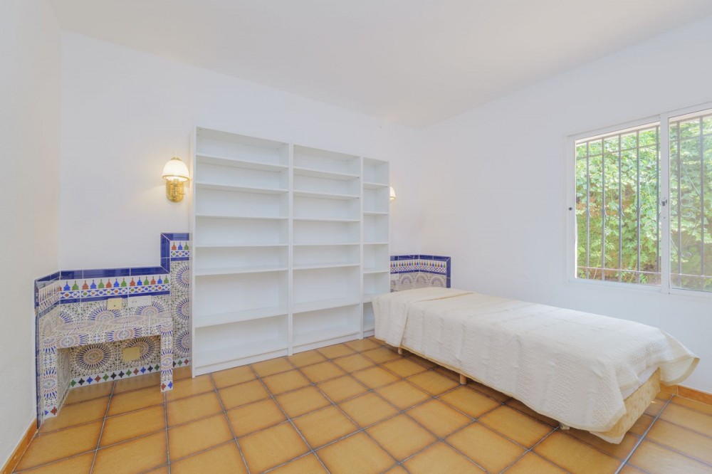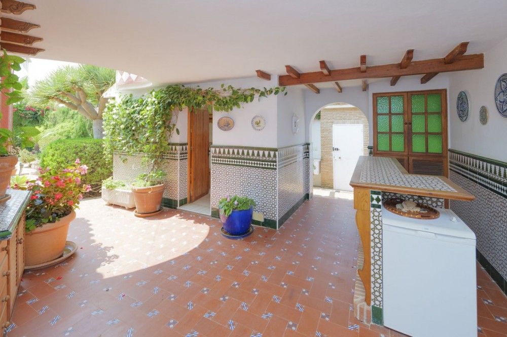 - Detached Villa at the renowned and consolidated residential area of El Mirador de Marbella. A house designed for relax and enjoyment, near schools, supermarkets and just a stone's throw away from the A7. With the enchanting Andalusian scent, and a 823sqm plot, the two level dwelling displays a fully fitted kitchen with pantry and independent entrance, a guest toilette, the cosy living room with access to the covered 20sqm terrace and garden plus an adjacent dining room; besides, two ample bedrooms that share a bathroom with Sauna. On the upper level, the main bedroom, with bathroom en suite, lounge and small office like corner adding a second 10sqm terrace with a glimpse of the sea. This charming traditional style property boasts, eventually, a nice and sunny pool and a BBQ area conveniently situated and covered. Private parking also covered. Charm and details for this property with an enviable location, within Marbella town area, with plenty of amenities and leisure offer at hand, and yet, tranquil and private, as one could expect from a property of this level.