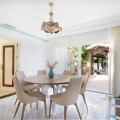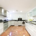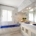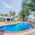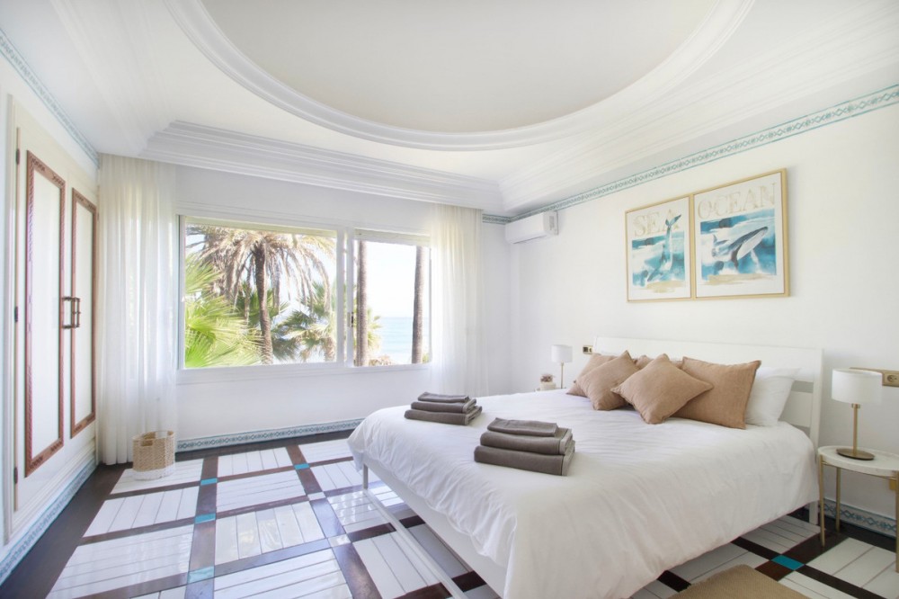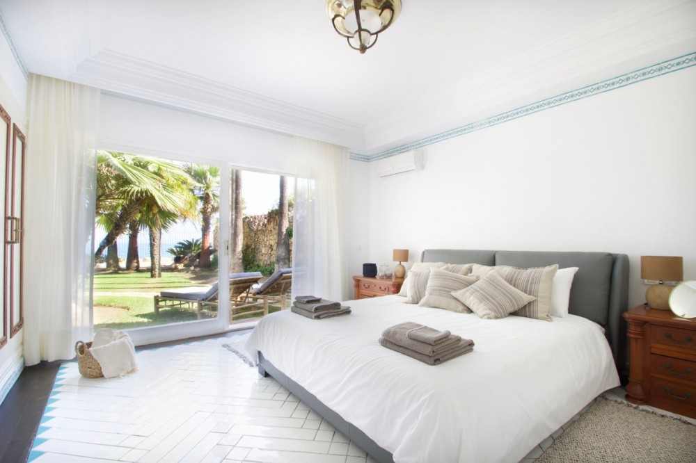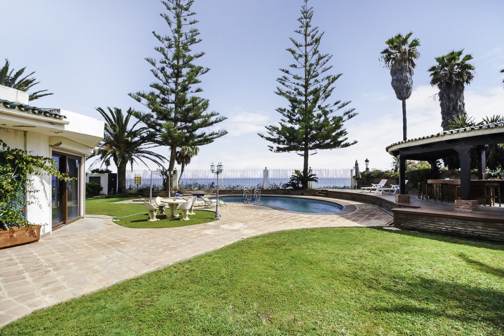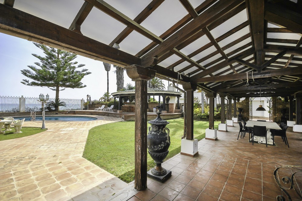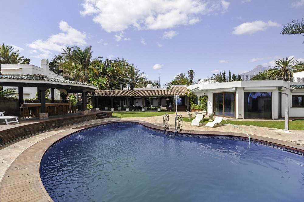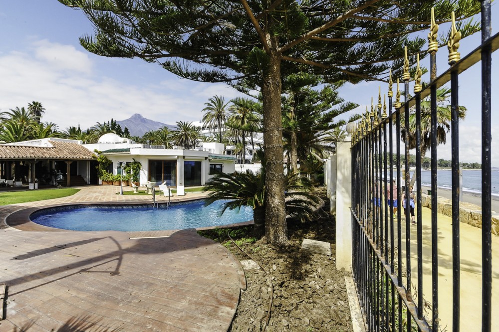 - A very spacious & unique villa situated in an unrivalled front line beach position in one of Spain's most privileged location, Marbella's exclusive Golden Mile. The villa is set on a double plot and offers on the ground level an entry hall, a guest toilet, office, spacious living room leading onto the garden with various terraces, swimming pool, bar, and direct access to the promenade. On this floor there is a separate dining room with vaulted skylight ceiling, a fully equipped kitchen with separate entrance, the master suite with walking wardrobes, 2 further double en suite bedrooms, and 2 bedrooms sharing a bathrooms. On this level there are two self contained guest apartments with 2 bedroom suites and living area, as well as a garage for four cars. These apartments are accessed separately form the main house. On this level we will also find a separate area with cinema room, an industrial kitchen with storeroom and 2 toilets. On the upper level there is a guest apartment with kitchenette, 2 en-suite bedrooms and a storeroom. The guest house is completely independent and consists of an ample living room, a fully equipped kitchen, both with access to the terrace and garden, an en-suite double bedroom on the main floor and 3 further en-suite bedrooms upstairs. The staff house offers 2 en-suite bedrooms, 2 rooms that can be used as gymnasium or multi-purpose room. Impossible to find a more prestigious and desirable location anywhere on the Costa del Sol. Simply unique!