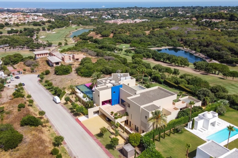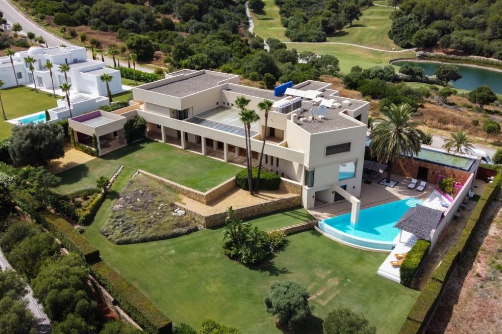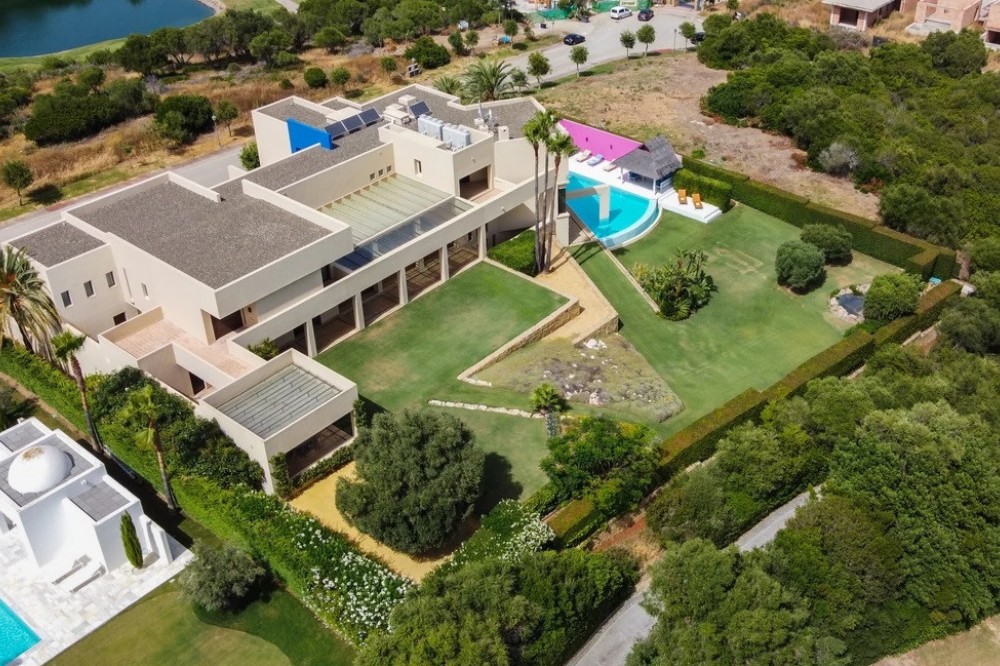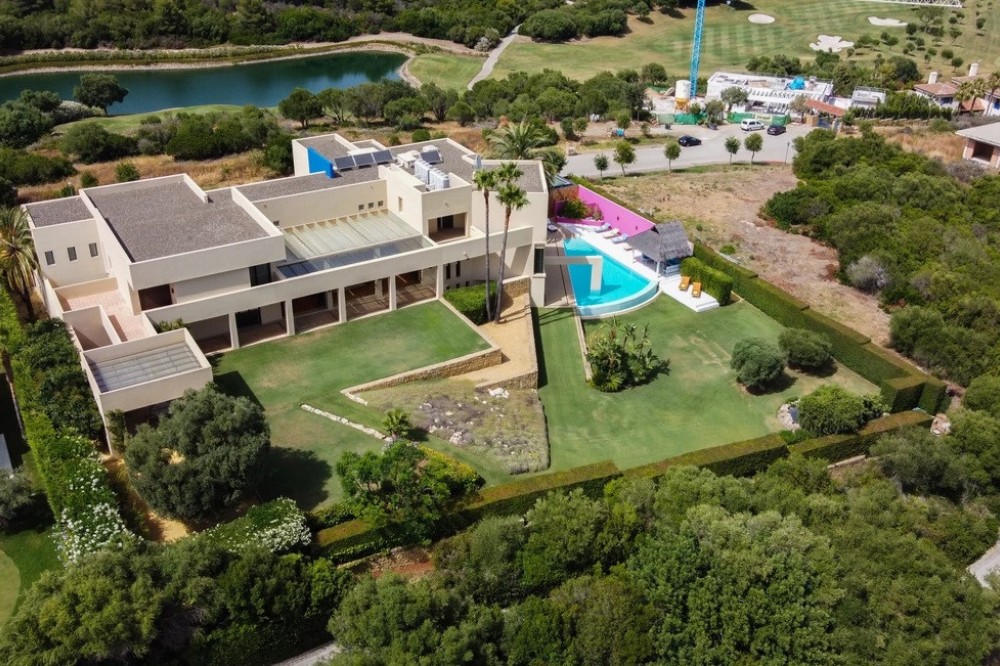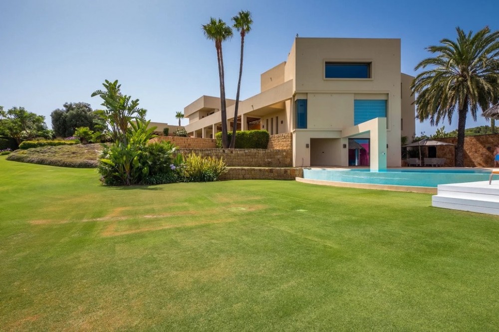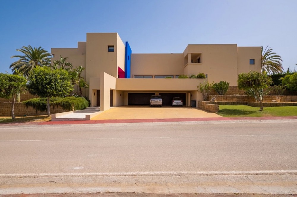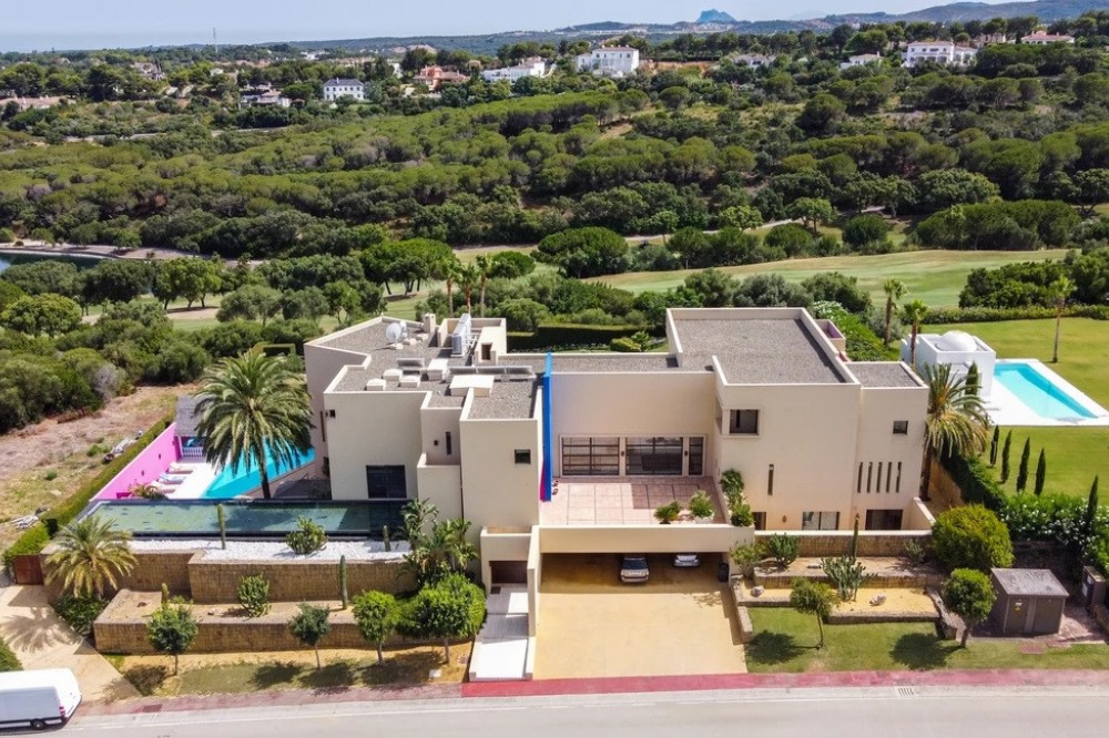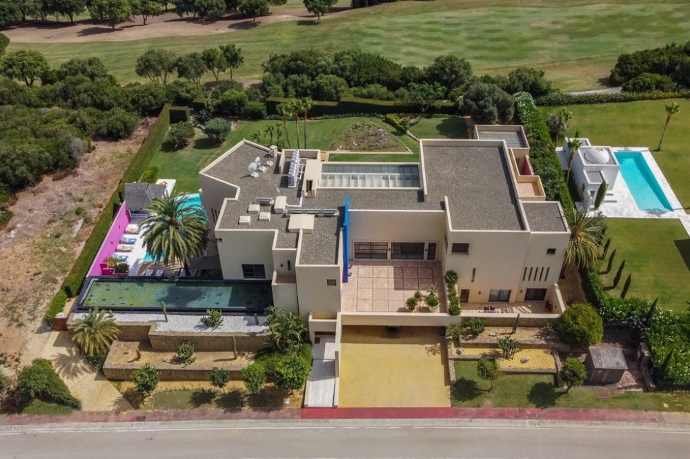 - Unique luxury mansion located south facing the extensive coastline with splendid views to the sea and the African border and surrounded by the famous 18 holes golf course La Reserva de Sotogrande and next to the Valderrama championship course. Designed and decorated by renowned architects and designers, it comprises, on the ground floor: a long corridor/gallery connecting the east wing with the tremendous living area and the study to the west wing's dining area. Sliding doors separating the dining room and the spacious kitchen with top-of-the-line equipment. Behind is the wet kitchen with a walk-in freezer, larder room, separate laundry room and the designed guest washroom. The upper floor consists of all the 5 bedrooms with en-suite bathrooms. The east wing is reserved for the master suite, consisting of the bedroom with panoramic window to the sea, rising TV screen in front of the bed, en-suite bathroom with terrace and outdoor shower. The walk-in closet is custom designed with wooden cabinets. The lower floor consists of one side of the house for housekeeping quarters with living room, kitchenette and separate toilet, bedroom, bathroom and spacious patio. In between is a 6-car garage and hobby room. The south side has a cinema room, massage room, wine cellar, pool/bar room as well as an extensive gym area, inside jacuzzi, Klafs Swedish sauna with infrared. The main rooms, decorated with the nicest Georgetti furniture and kitchen all have access to the outdoor with certain areas having the Barragan-specific strong colours. Bright walls accentuate the space on the terraces near the Koi pond and the sun protected outside BBQ area, which connects to a split-level garden with fountain and strong colour wall surrounding, protected to wind and offering total privacy. The infinity swimming pool with stunning Siccis mosaic, IPE wooden terrace and Mexican style hut. The most dramatic style part of this mansion is the spacious outdoor living area with glass roof and electric sculpted lattice shutters which play with ever changing quality of light and shade from roof and front part separating the garden without taking away the sea view. This one-of-a-kind villa is located in Sotogrande, in the South of Spain, close to Marbella, Malaga and Gibraltar. It is set in a gated residential complex at the end of a cul-de-sac and at the entrance of the world renown Club Reserva de Sotogrande Golf Course. A five-minute drive will bring you to the beach of the Mediterranean Sea and all of its entertainment. Stores, shopping malls and supermarkets are close by. The Málaga International Airport is over an hour's drive away. The adjoining plot is available at the price of 1,000,000 EUR (4,146 m2).
