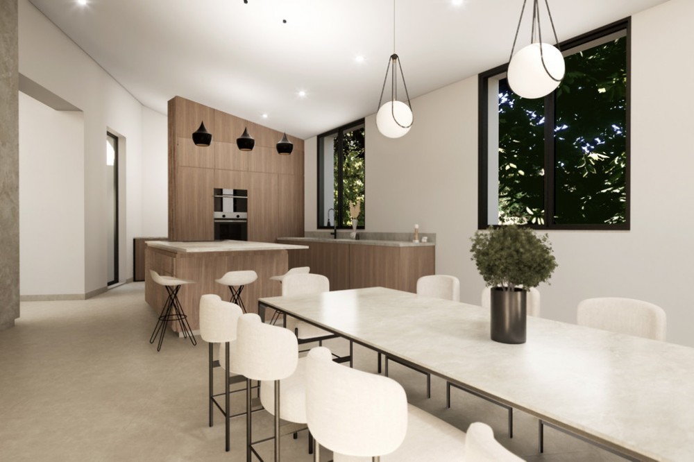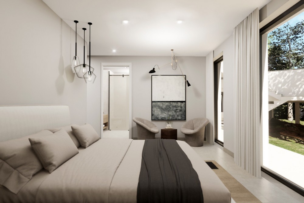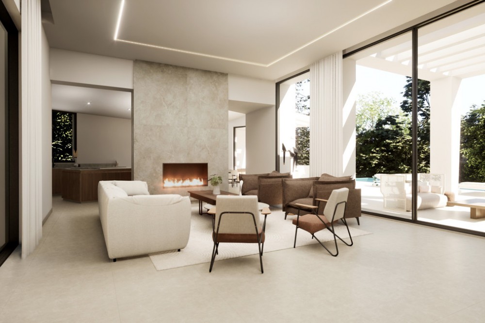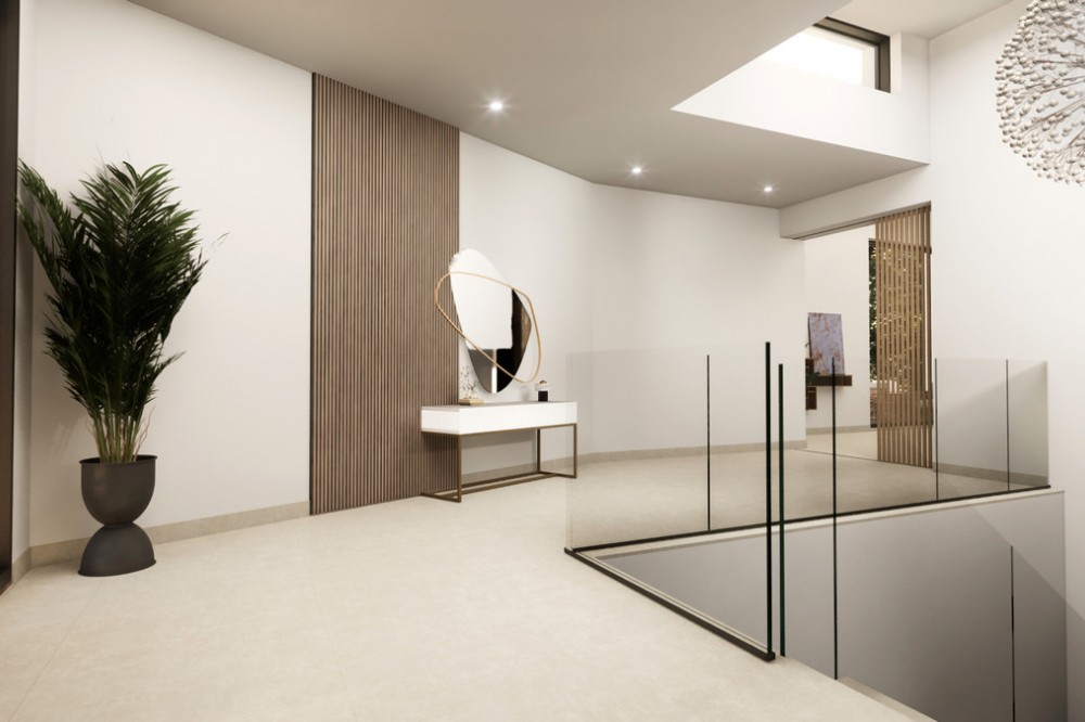 - Tucked away on a quiet cul-de-sac in Sotogrande’s tranquil F Zone, this striking new villa is currently under construction and set for completion in May 2025. Designed with modern living in mind, the home embraces its south-facing position, flooding the interior with natural light and opening up to lush garden views and the calming backdrop of native woodlands. Occupying a generous 1,786 m² plot, the villa is accessed via a long private driveway that ensures complete privacy. Inside, the 550 m² layout is spacious and thoughtfully planned, offering five large bedrooms, multiple living and entertaining areas, and seamless transitions to outdoor spaces. There are 265 m² of open terraces, 64 m² of covered terraces, and a stunning rooftop terrace—perfect for sunset views and alfresco evenings. The home will be equipped with high-spec features, including underfloor heating, full air conditioning, and an advanced domotic system for effortless control of lighting, climate, and security. Outside, the 14.5 m x 5 m saltwater infinity pool—solar-heated for energy efficiency—sits in harmony with the landscaped gardens, creating an ideal space for relaxing and entertaining. Combining sleek architecture, sustainable tech, and a peaceful setting, this property is a rare find for buyers looking for a refined lifestyle in one of Sotogrande’s most desirable neighborhoods.