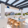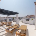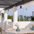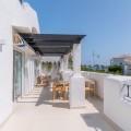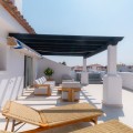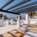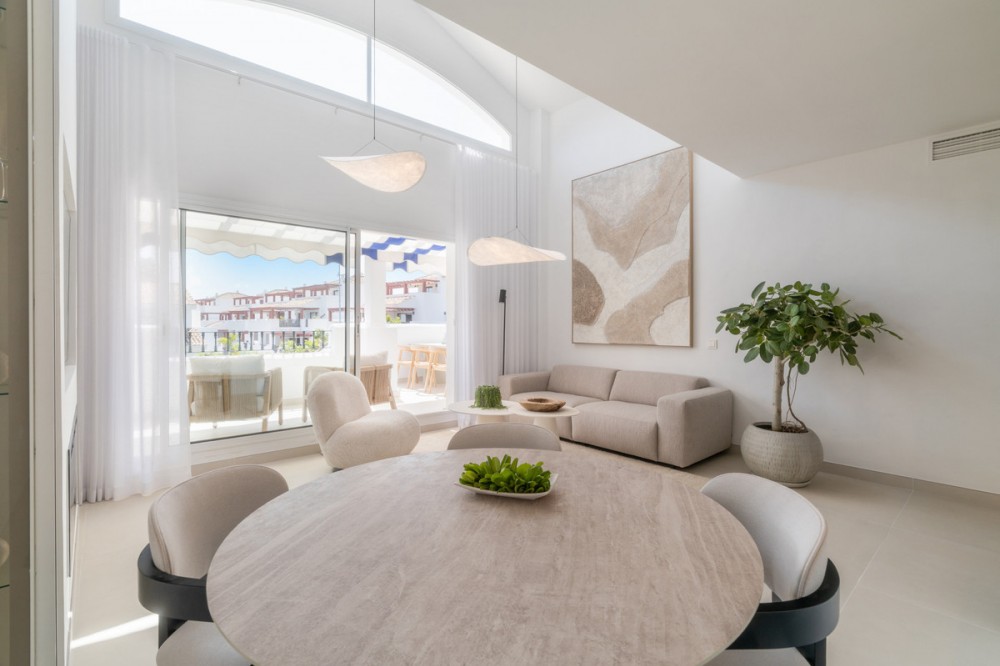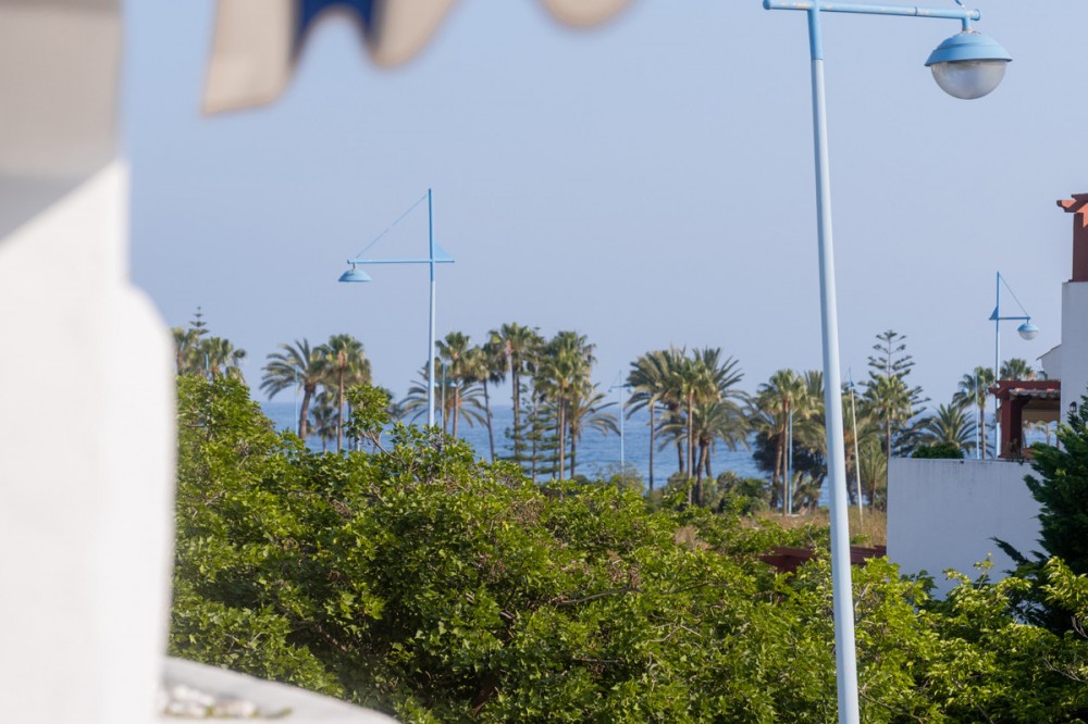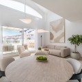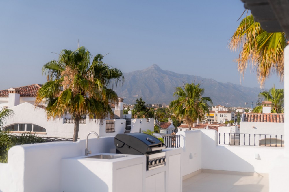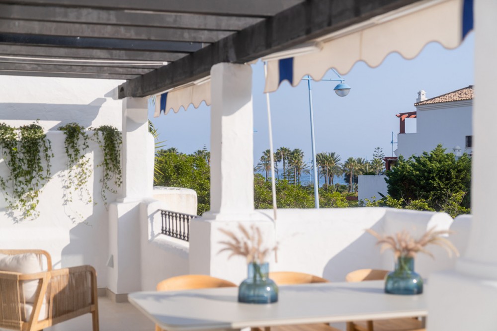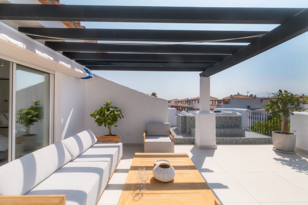 - Step into this beautifully renovated 3-bedroom, 3.5-bathroom duplex penthouse, ideally situated just steps from the beach and within easy walking distance to shops, the town center, restaurants, and bars. Nestled within a small and exclusive gated community, the property offers access to a communal swimming pool surrounded by beautifully landscaped and well-maintained gardens, providing a serene and private atmosphere. Furnished in elegant Scandinavian style, the home features a bright open-plan kitchen, and a spacious living area with a charming vaulted ceiling. Glass doors that open out to a private terrace with an outdoor dining table—perfect for enjoying the Mediterranean lifestyle. Upstairs, the master suite spans the entire top floor and features its own en-suite bathroom and private terrace which leads to a stunning upper patio with a jacuzzi and barbecue, offering panoramic and sea views—ideal for relaxing or entertaining. The property also includes an underground parking with enough space for two cars and a private storage room. A move-in ready beachside home in a boutique community—offering modern comfort, privacy, and elegant coastal living.