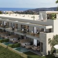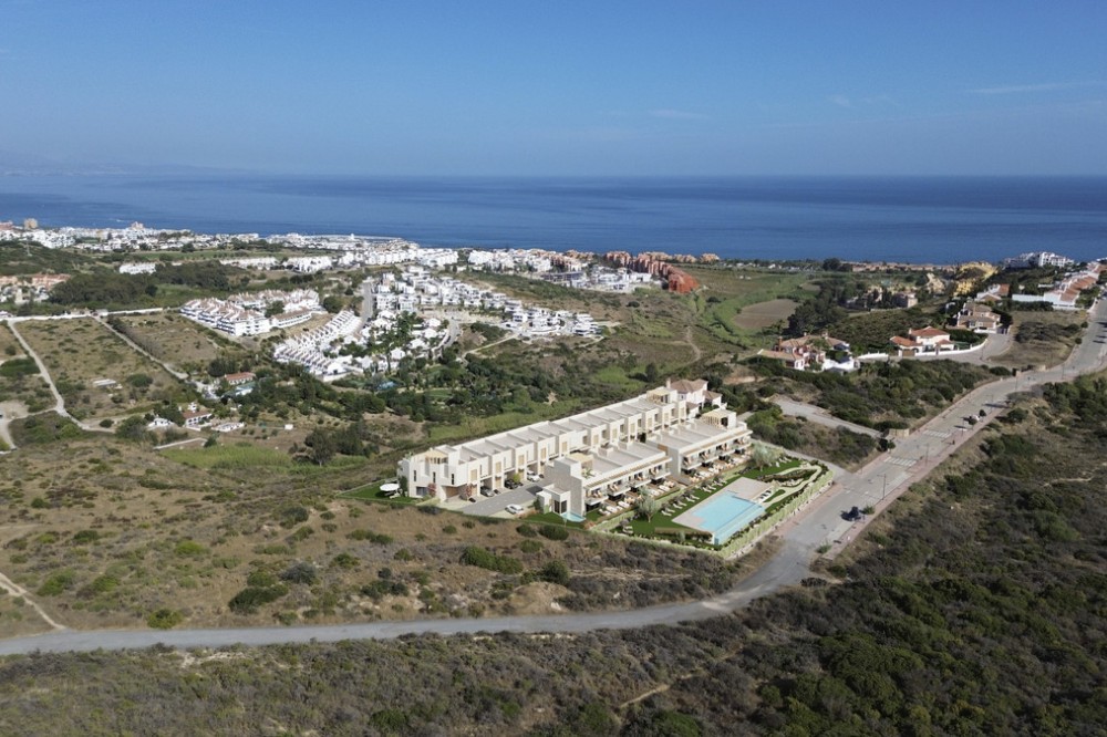 - New Development: Prices from €545,000 to €740,000. [Bedrooms: 3 - 4] [Bathrooms: 3 - 4] [Built size: 128m2 - 167m2]. Between Estepona and Sotogrande, in the up-and-coming Manilva, lies this development: an exclusive new-build project with 20 modern townhouses. Here you can enjoy breathtaking views of the Mediterranean Sea and the green hinterland every day. The architecture combines natural materials such as natural stone and wood with sleek lines and warm finishes. Each home has at least 128 m² of living space, a bright living room with large windows, an open kitchen with cooking island and high-quality materials. Upstairs there are three bedrooms and two stylish bathrooms. The corner houses offer extra luxury: a fourth bedroom with bathroom on the ground floor and a roof terrace with spectacular views. Some homes have a private garden with the option for a swimming pool, others have a spacious terrace with a view of the valley. UPCOMING AREA MANILVA This development features a beautifully landscaped communal garden with Mediterranean plants, a large swimming pool and a fully equipped gym. The beach of La Chullera is just a 3-minute drive away, while the lively marina of La Duquesa is 4 minutes away. Supermarkets and restaurants are located in the immediate vicinity. The charming centre of Estepona is also just a 20-minute drive away. For golf enthusiasts, this is a true paradise, with Finca Cortesin, Real Club Valderrama and various prestigious courses in Sotogrande within easy reach.