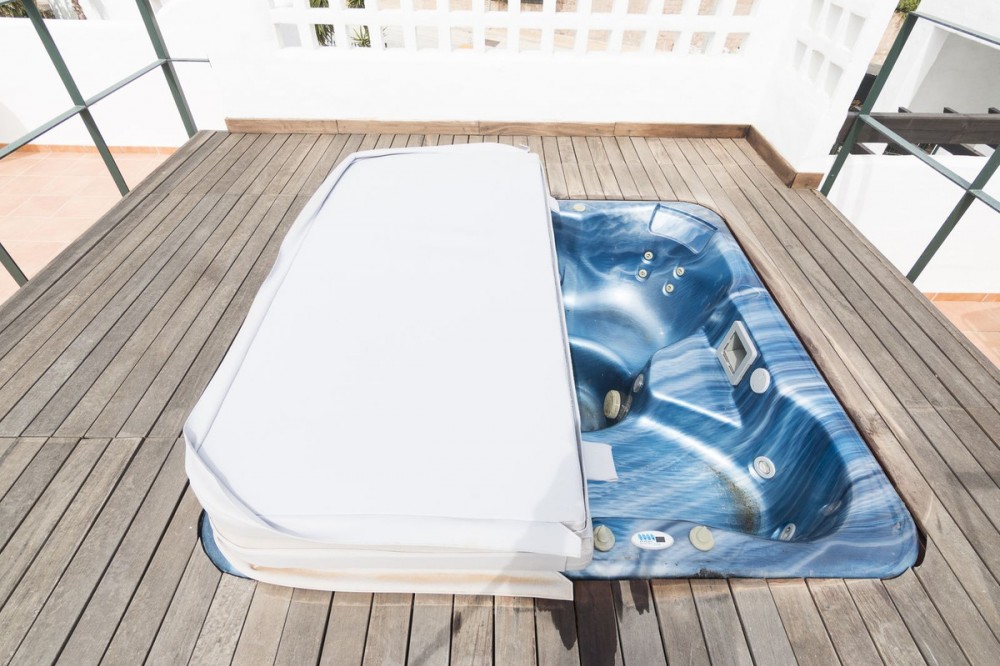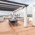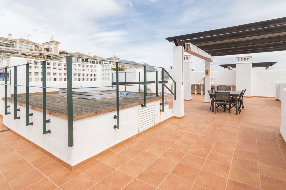 - Within a pleasant residential complex where the apartments are distributed across 8 small blocks of three levels, this penthouse offers a spacious living room, a fully fitted kitchen with separate utility room, 3 bedrooms (one en-suite with its own bathroom and access to the terrace), a second full bathroom, and a beautiful large terrace of 47m² leading up to a 128m² solarium with pergola and jacuzzi, boasting breathtaking views of the golf course, the mountains, and the sea. An underground parking space is included in the price. The residence, set in a peaceful and green environment, has a communal swimming pool with children’s pool. You can easily reach the centre of Sabinillas and Puerto de la Duquesa (10 minutes), as well as Estepona (15 minutes). Málaga airport is 60 minutes away.