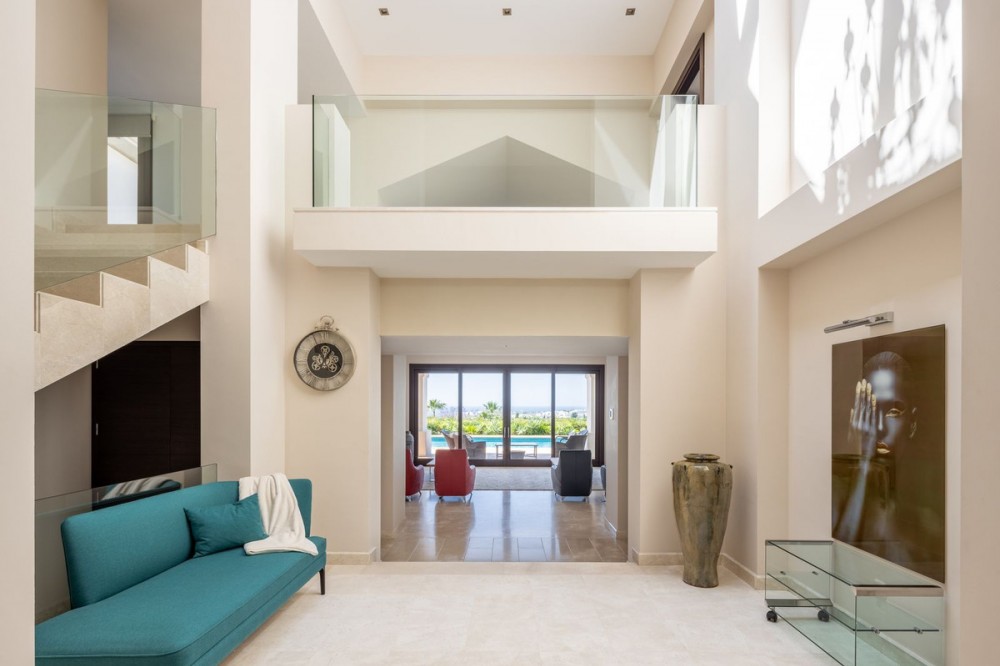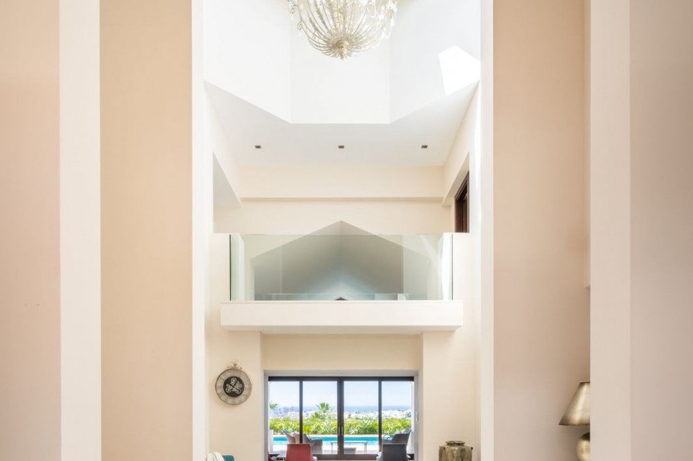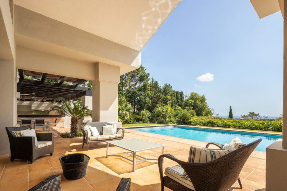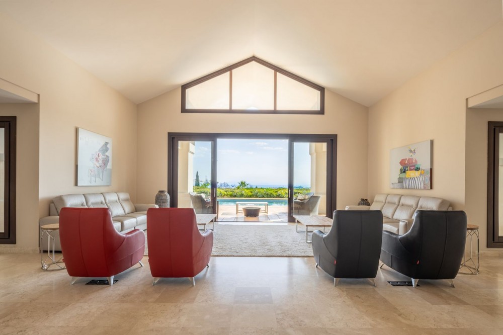 - VILLA FLAMINGOS – PROPERTY FOR SALE IN LOS FLAMINGOS, BENAHAVÍS Located in one of the most prestigious areas of Los Flamingos, this stunning south-facing villa offers spectacular panoramic sea views and is just minutes away from all amenities, the beach, and only 10 minutes from Puerto Banús. Set on a generous plot of 2,239 m² with a total built area of 727 m², the property is distributed over three floors, combining elegance, functionality, and comfort. A perfect home for those seeking exclusivity, privacy, and unparalleled views of the Mediterranean. Main Features: Detached 3-level villa 6 spacious bedrooms and 6 bathrooms Plot size: 2,240 m² Terraces and balconies with open views Private garage included Excellent condition (built in 2005) Fitted wardrobes and storage room South-facing, with maximum natural light Central gas heating and underfloor heating Air conditioning Additional Amenities: Private swimming pool (83.26 m²) Well-maintained gardens Additional outdoor parking Home cinema room Fully equipped barbecue area Layout: Basement Floor: 257.5 m² allocated to two guest or staff bedrooms, home cinema, storage room, utility room, technical room, garage for at least two vehicles, and exterior parking area. Includes internal stairs connecting to the main level. Ground Floor: 288.73 m² plus 52.80 m² of porches and pergolas. Features an elegant entrance hall, guest toilet, spacious main living room, hallway, en-suite bedroom, family lounge, independent kitchen, dining room, and direct access to covered terraces and barbecue area. Upper Floor: 180.74 m² comprising a majestic master suite with private bathroom and two additional en-suite bedrooms. Internally connected to the lower floors.