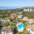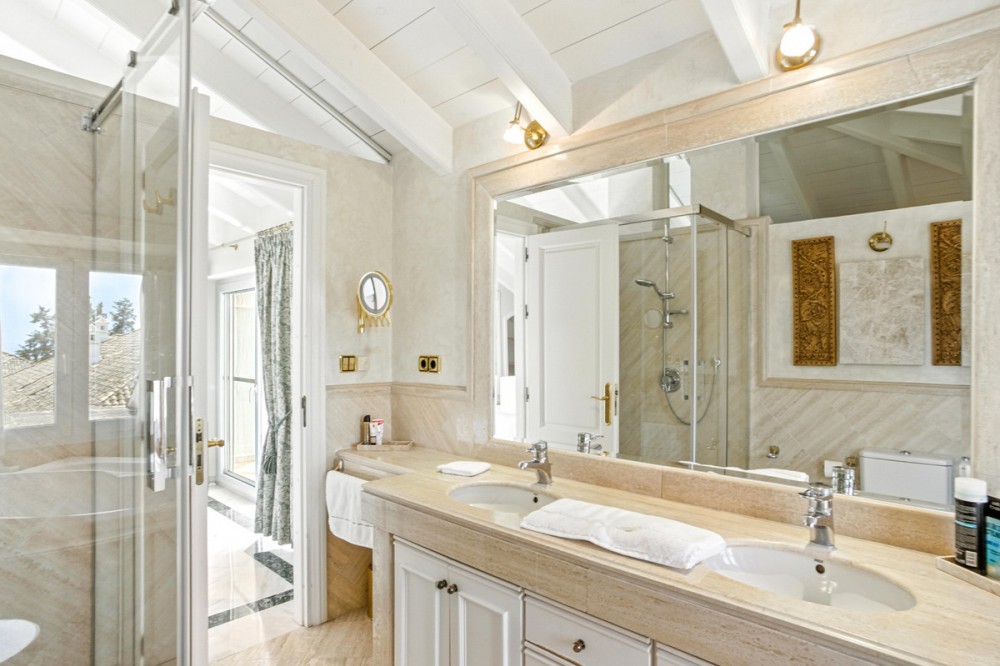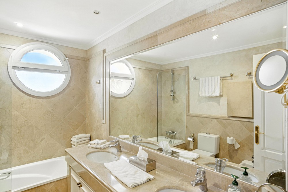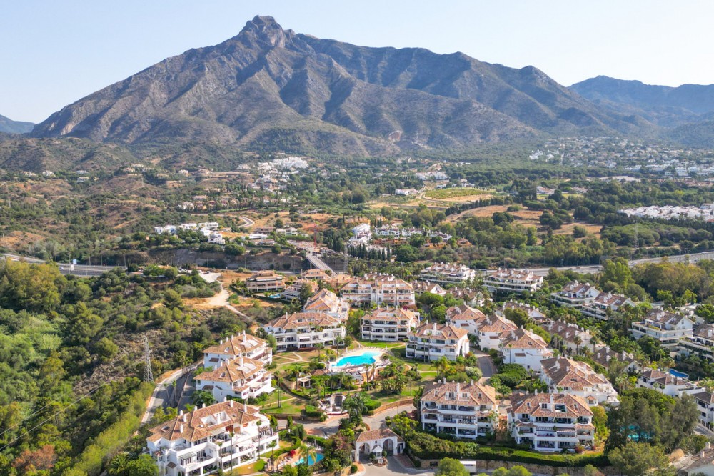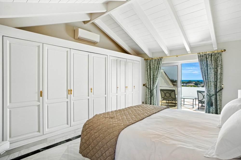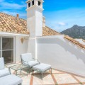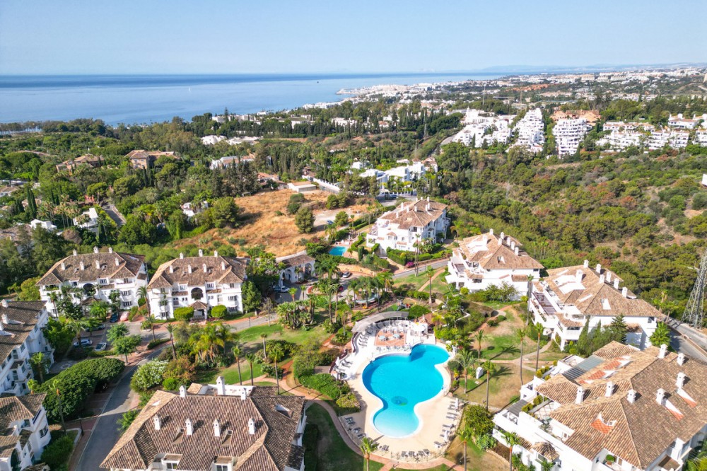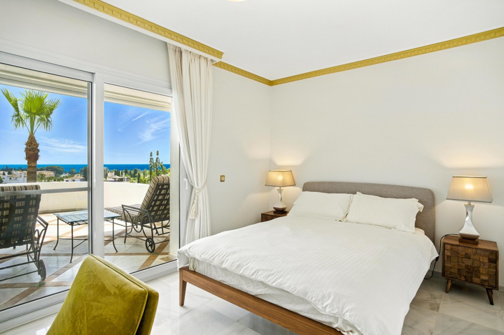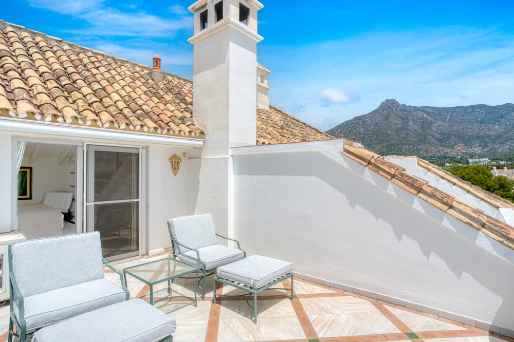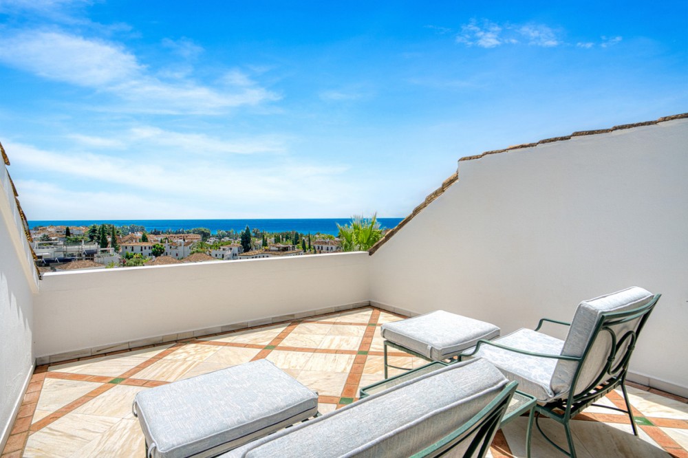 - Wonderful three bedroom, south east facing duplex penthouse in the exclusive and gated community of Monte Paraiso on the Golden Mile, with 24hr security, several outdoor swimming pools, a bar/restaurant, children’s play area, fully equipped gym, steam room, sauna, squash court, massage room, indoor heated swimming pool and tropical gardens that are maintained to the highest standards. As well as all this it is only a short walk to the famous Puente Romano Hotel and the beach. The main level of the property has a large living and dining area with patio doors leading out to the spacious terrace with amazing sea views; a fully fitted kitchen with separate utility room; two guest bedrooms, one with a private terrace with stunning views to La Concha mountain; and a guest bathroom. The upper level leads to the master suite with vaulted ceilings, a Jacuzzi bath and access to a private terrace with spectacular sea views. Other features include marble floors, fireplace, fitted wardrobes, hot and cold air conditioning, two private parking spaces and a storage room.