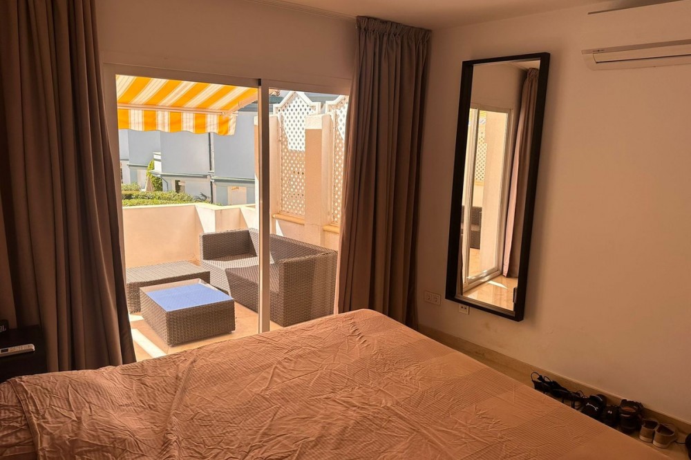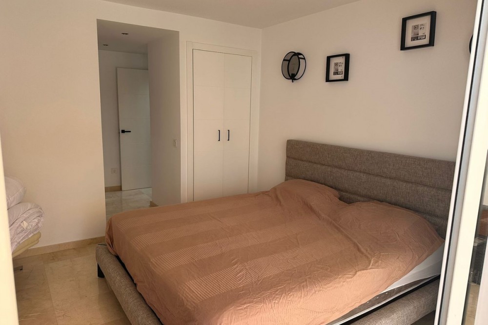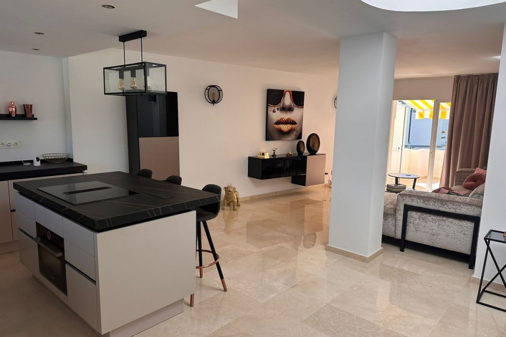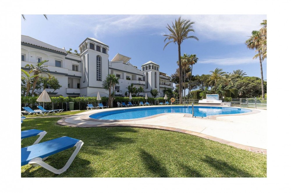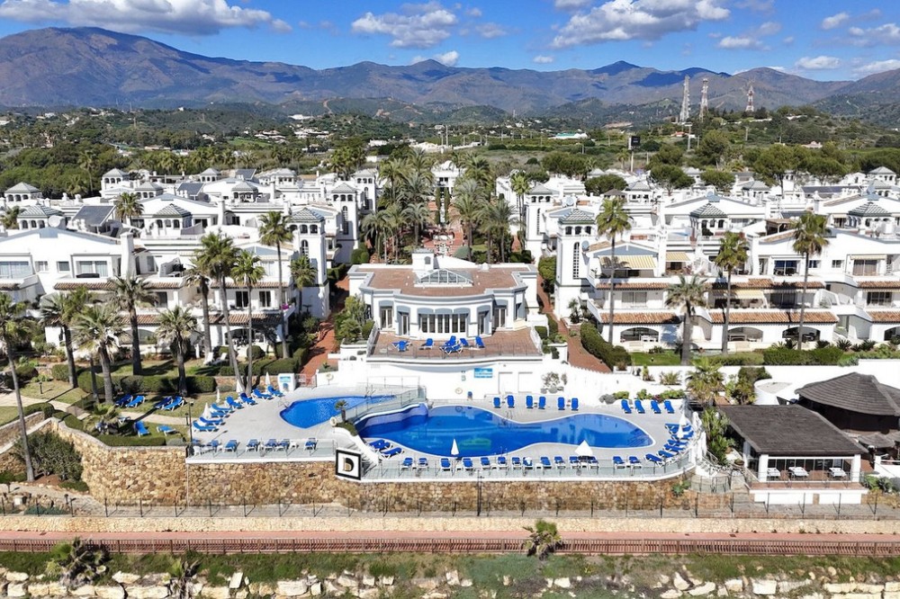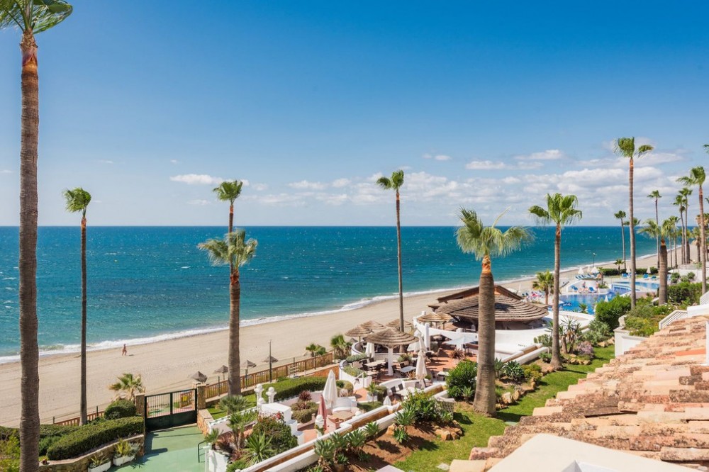 - 1st line beach on the New golden Mile between Marbella and Estepona! Top-floor apartment on 1st floor with large south facing terrace, partly covered. Built area of 96 sqm. Offering entrance area leading to the open plan kitchen-dining lounge with outgoing to the terrace. Spacious master bedroom with en-suite bathroom, 2nd bedroom and a 2nd bathroom separate. Storage room. Parking space internal in the gated community in front of the entrance of the apartment. The apartment is located in the lower building-part of Dominion Beach, which has 2 storys. 24-hours security urbanisation with 24-hours guardians. Tropical, old grown community gardens with 2 swimming pools, one on beachfront with direct access to the beaches. To the urbanisation belongs as well a restaurant and bar next to the beachfront swimming pool. Features: creme marble floors, built-in wardrobes, new aircondition hot/cold, new built-in wardrobe doors, double glazing windows and doors, security entrance door, sun blinds, furnished, new modern contemporary kitchen fitted with all appliances, open plan, storage room. The apartment is completely new refurbished. Beautiful manicured gardens with water features such as fountains and mosaic themed little ponds Gym and social area Administration office Private slipway to the beach and sea for easy access of waterski / jet-ski and windsurfing equipment Busstop in front of the complex. Golf courses are several around in only few minutes drive. Supermarket, bars and restaurants as well as Laguna Village with beach club is in walking distance. 5 minutes drive to Estepona and 10 minutes drive to the the famous and sophisticated port of Puerto Banus. High rental potential and very good investment opportunity at one of the high class areas west side of Marbella.