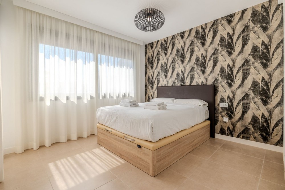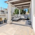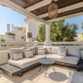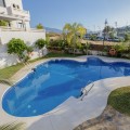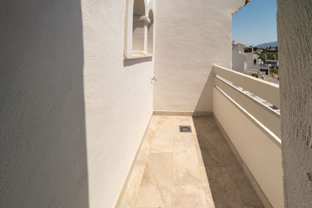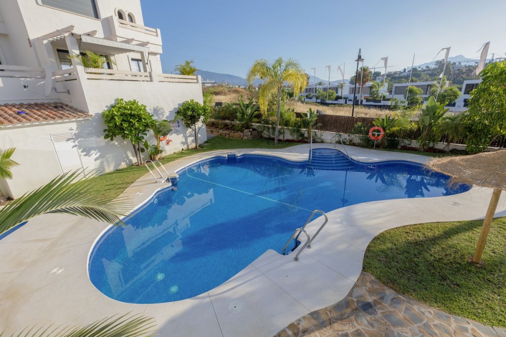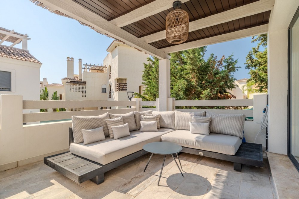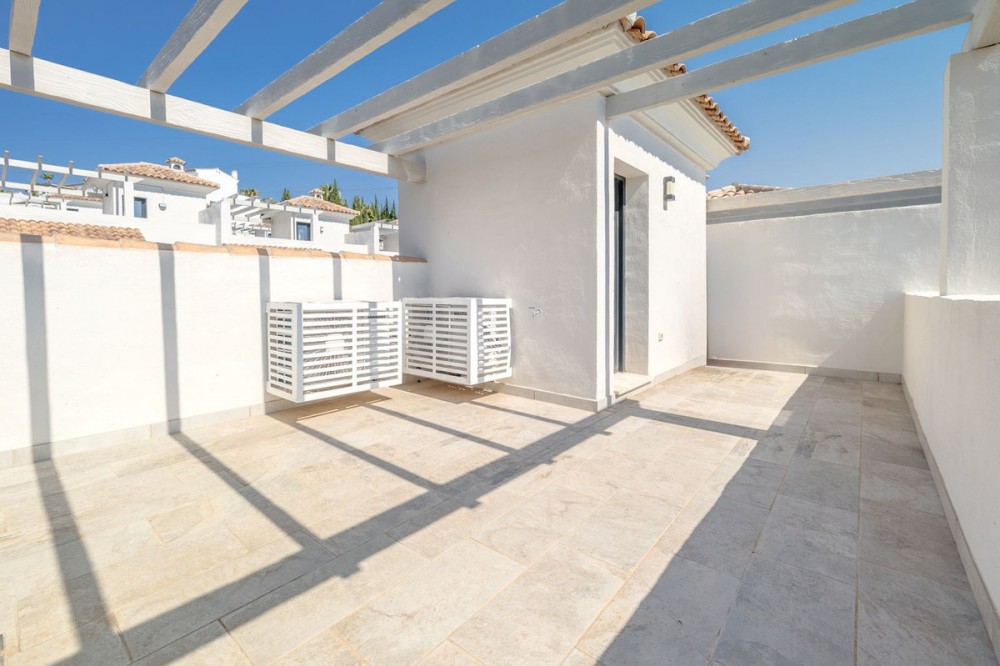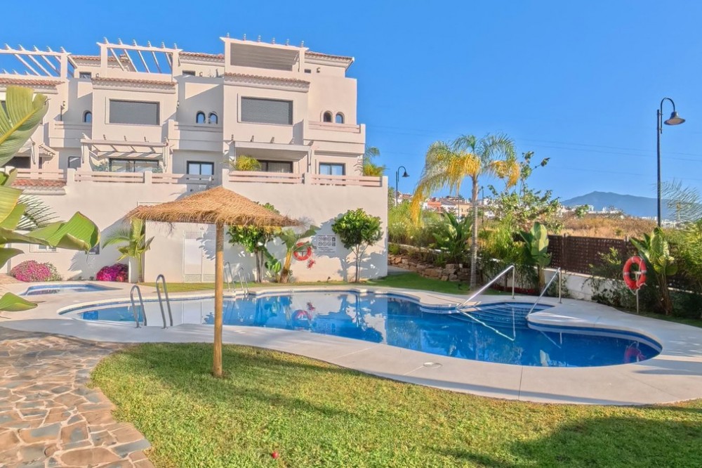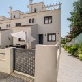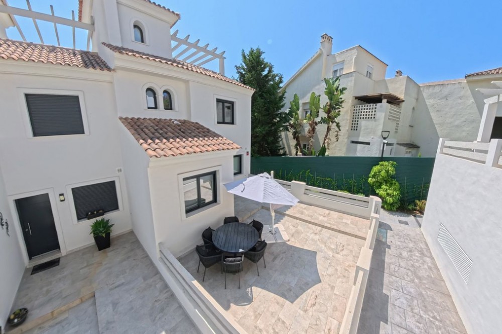 - Located within the exclusive El Campanario area of Estepona, this elegant corner townhouse is part of a peaceful development of just 47 homes. Designed with traditional Andalusian architecture, the property enjoys spacious terraces and an abundance of natural light throughout. Spanning 131.34 m² across three levels, the townhouse features three bedrooms, two bathrooms, a guest toilet, a bright living-dining area, and a fully equipped kitchen. Outdoor spaces include a welcoming entrance terrace, a second terrace off the main living area, and a rooftop solarium with a pergola—ideal for relaxing or entertaining. The home also includes a basement, two private parking spaces, and two storage rooms as well. Residents of this charming complex have access to beautifully landscaped gardens and a communal swimming pool. Ideally situated, the property is just 5 minutes from San Pedro Alcántara, 15 minutes from Puerto Banús, and within easy reach of Marbella town centre and Estepona. Malaga International Airport is conveniently located only 45 minutes away as is Gibraltar Airport. The home is also surrounded by some of the best golf courses in the area, making it perfect for golf enthusiasts.