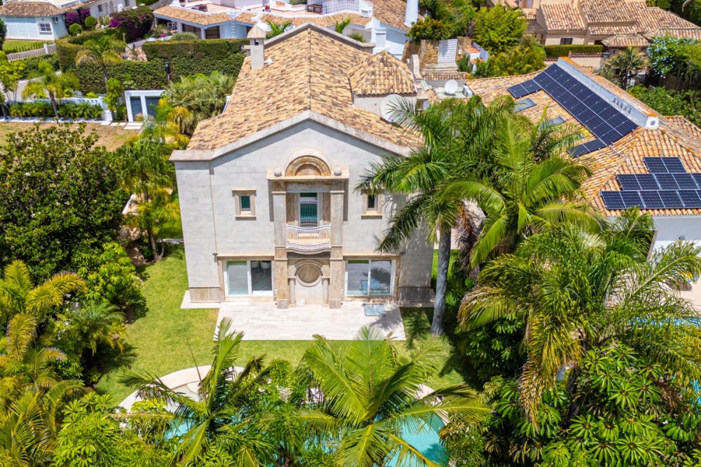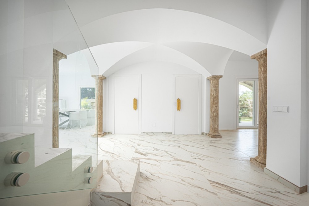 - Villa Roma is a stunning four-bedroom, four-bathroom home in the exclusive beachside area of Los Monteros, Marbella East. Just a short walk from the beach, this elegant villa sits on a 933m² plot and combines classic European design with modern coastal comfort. Spread across three levels, it offers generous living spaces, two en-suite bedrooms, and seamless indoor-outdoor flow, creating the perfect balance of style and practicality. Step inside through a grand entrance with elegant pillars and marble floors that set the tone for this exceptional home. The open-plan living room features a grand fireplace, while the upper level enjoys natural light from a domed ceiling and large windows. The master suite includes a walk-in dressing room, a Juliet balcony overlooking the pool, and a sense of calm and privacy. The lower level adds flexibility with space for a gym, cinema, or guest suite—ideal for modern living. Outside, Villa Roma offers a private haven surrounded by tall palm trees. The pool, with its four waterfalls, creates a peaceful, spa-like atmosphere, while a stone terrace with a wood-burning barbecue makes entertaining easy. A fishlake beside the terrace adds to the villa’s charm and serenity. Every detail of Villa Roma has been designed with care, making it a rare opportunity to own a truly timeless property just moments from Marbella’s finest beaches.