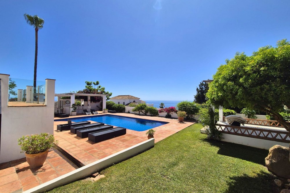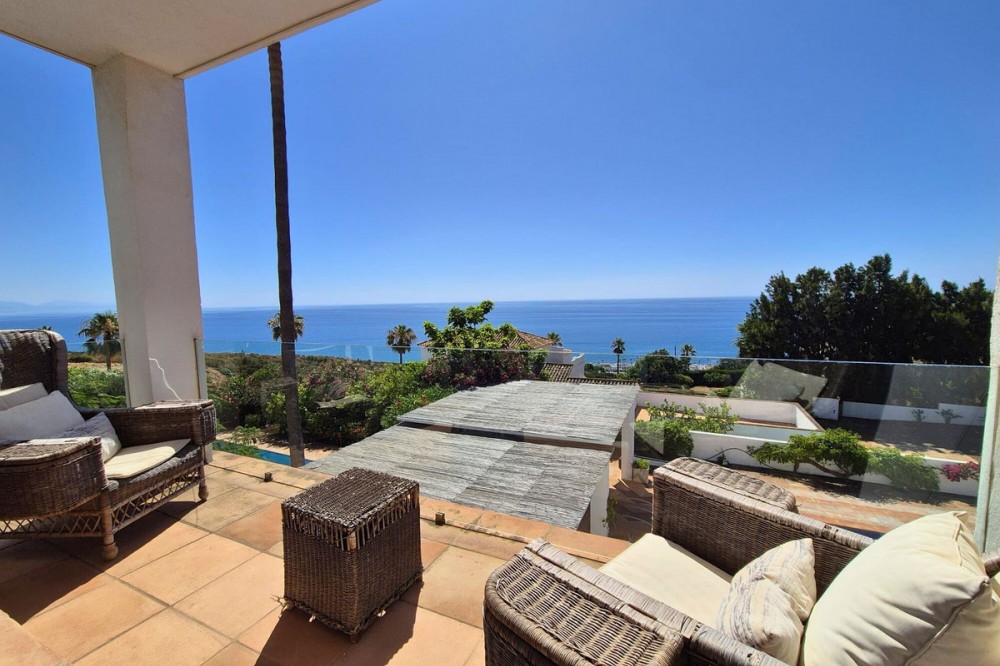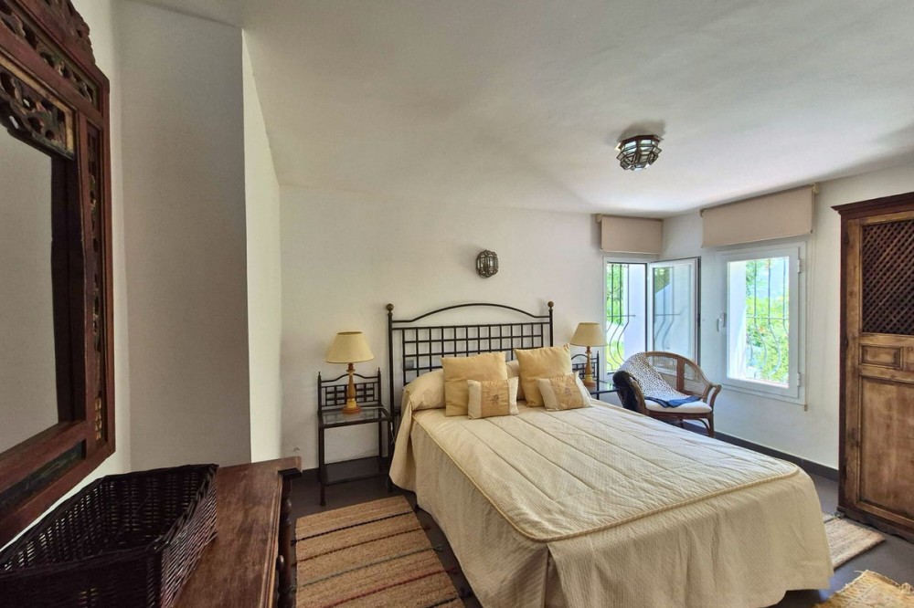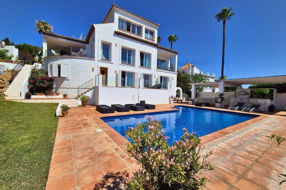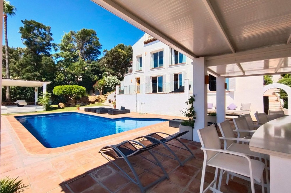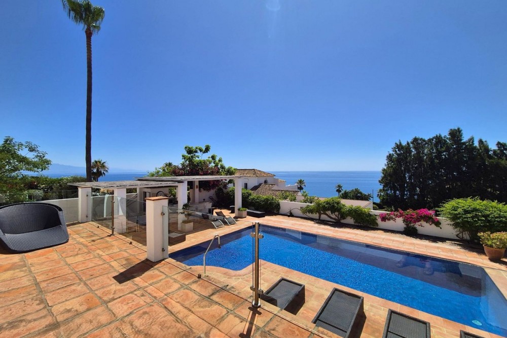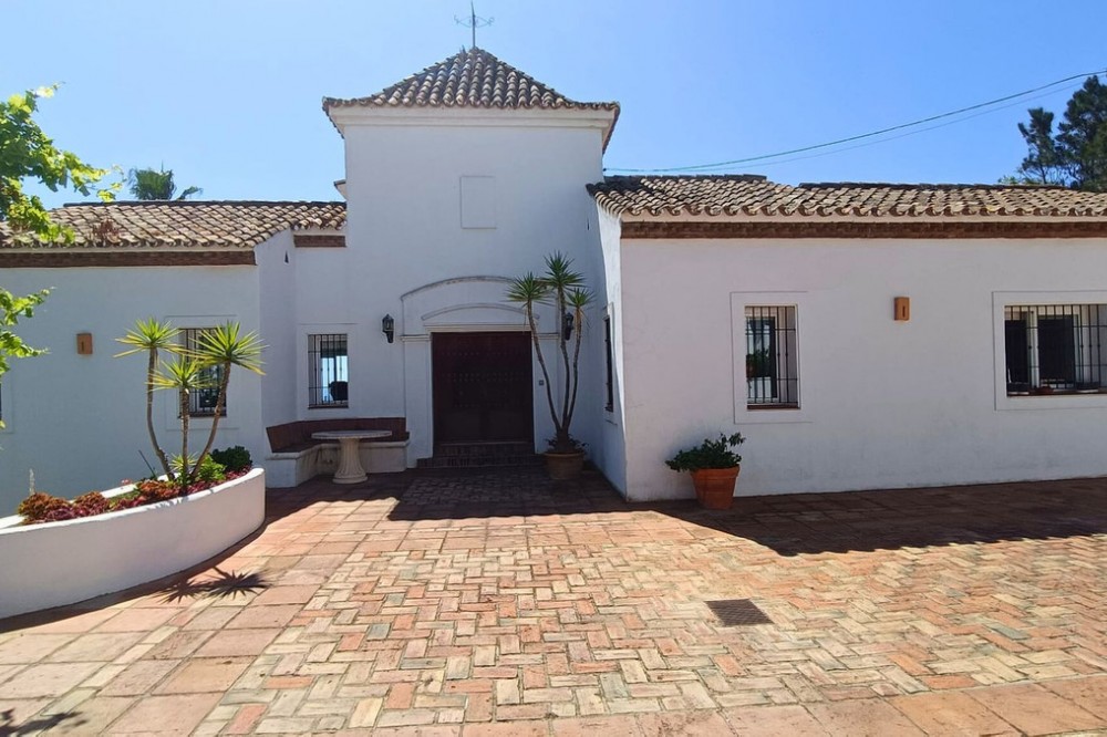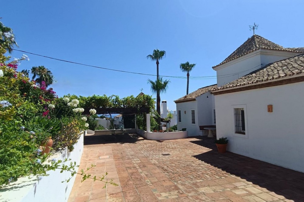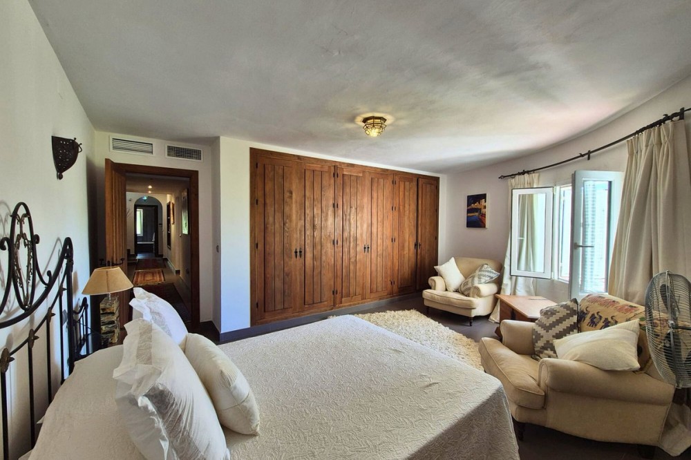- Classical Villa with Stunning Sea Views in La Paloma, Manilva Discover this exceptional classical-style villa that perfectly blends elegance, comfort, and breathtaking sea views, ideally located in the prestigious residential area of La Paloma in Manilva. As you step inside, you're welcomed by a spacious entrance hall where the beautiful Mediterranean views immediately capture your attention. You’ll find a fully equipped kitchen with a separate laundry room, a spacious living room with fireplace, and a dining room that connects directly to a covered terrace ideal for indoor-outdoor living. There's also a guest toilet and another covered terrace accessible from several rooms. The master suite occupies the entire upper floor, offering ultimate privacy. It features a charming dressing area with high vaulted ceilings and exposed wooden beams, adding warmth and character to the space. An en-suite bathroom and stunning sea views complete this peaceful and private retreat. On the lower ground floor, you’ll find four additional bedrooms and a second living room, which can easily be converted into a sixth bedroom. From here, step out onto another terrace that leads to the spacious pool area and garden, designed for pure relaxation with various lounge zones, a pergola, a pool bar, and an outdoor dining area — perfect for entertaining. The villa boasts a beautifully modernized interior while retaining its classical charm. Multiple terraces offer captivating views of the sea, surrounding countryside, and mountains, creating a unique atmosphere of peace and luxury. A private covered parking area within the plot provides space for two cars, adding convenience to this remarkable home. Located within walking distance to the beach and the popular Chiringuito Tubalitas, and close to the picturesque beaches and vibrant towns of Sotogrande and Estepona, this villa offers the perfect blend of tranquility and accessibility. An unparalleled opportunity to enjoy luxurious Mediterranean living in one of the Costa del Sol’s most desirable locations.