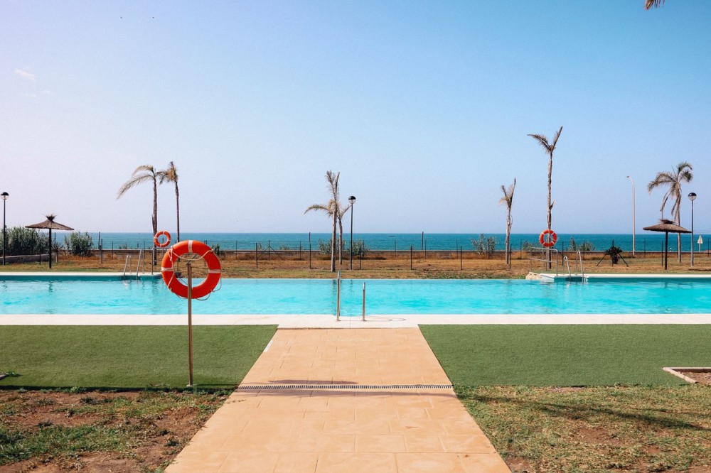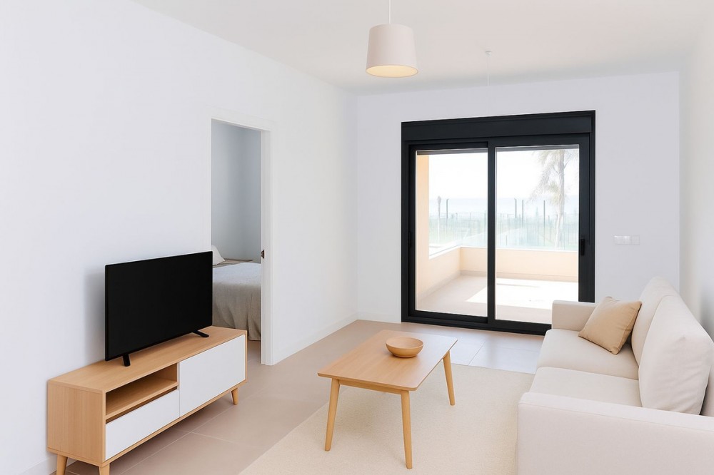 - First-Floor Apartment with Terrace and Sea Views Modern 2-bedroom, 2-bathroom apartment located in a quiet residential area, just minutes from the sea and with excellent access to local amenities and main roads. It features a private terrace with partial sea views, ideal for enjoying the Mediterranean climate all year round. Main features: Fitted kitchen with ceramic hob, sink, and extractor hood Bathrooms with furniture, mirror, and shower screens Built-in wardrobes with interior lining Double-glazed windows and motorized shutters Automatic garage door with remote control Elevator with direct access to the basement Landscaped communal areas with automatic irrigation and paved walkways Building entrances decorated with high-quality materials 2 communal swimming pools and 2 paddle tennis courts Perfect as a main residence, holiday home, or investment.