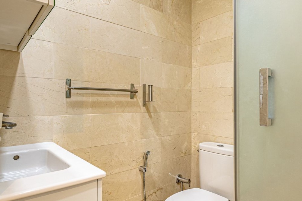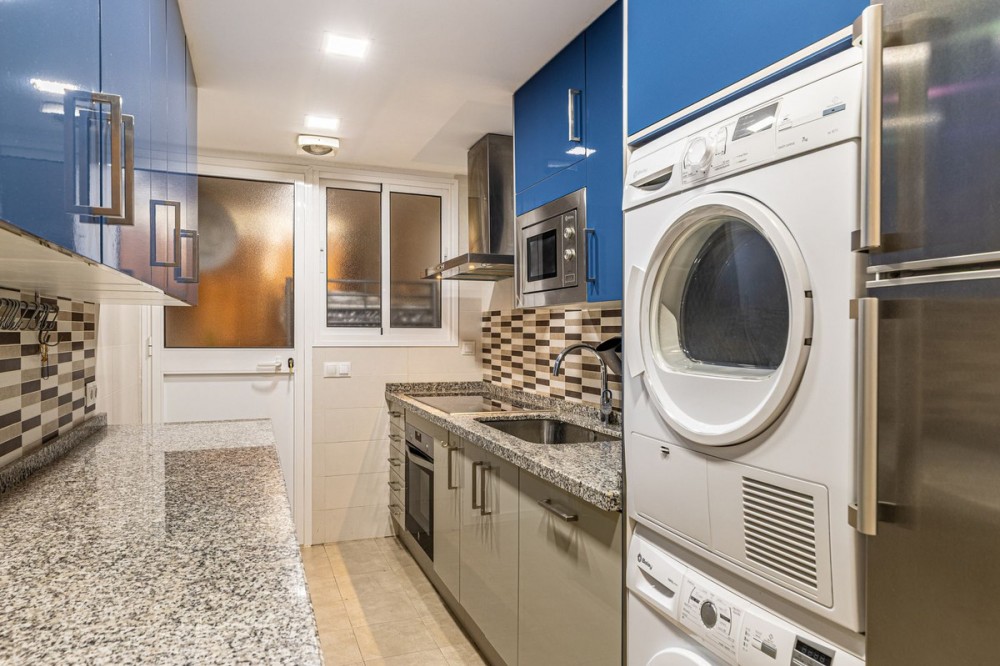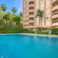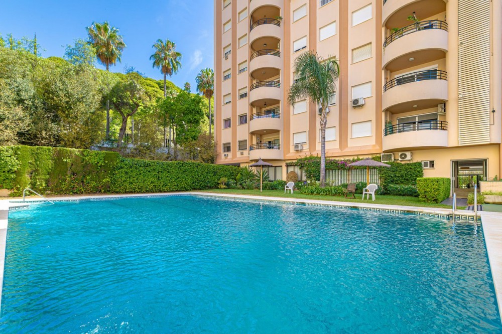 - Impeccable corner apartment on the fifth floor with views of the pool and morning sun. The property has been completely renovated and is ready to move into. It has a living-dining room with access to the terrace, a fully equipped kitchen with a laundry room, a master bedroom with an en-suite bathroom and built-in wardrobes, and two further bedrooms, each with its own bathroom. Being on the corner, the property enjoys plenty of natural light. The car park is communal and enclosed with a gate. The building has a communal garden and swimming pool. Located in the heart of the city, just a stone's throw from Marbella's promenade and the beach.