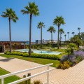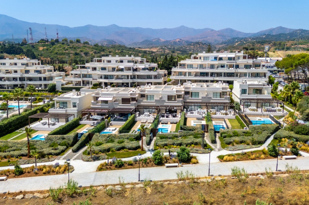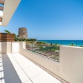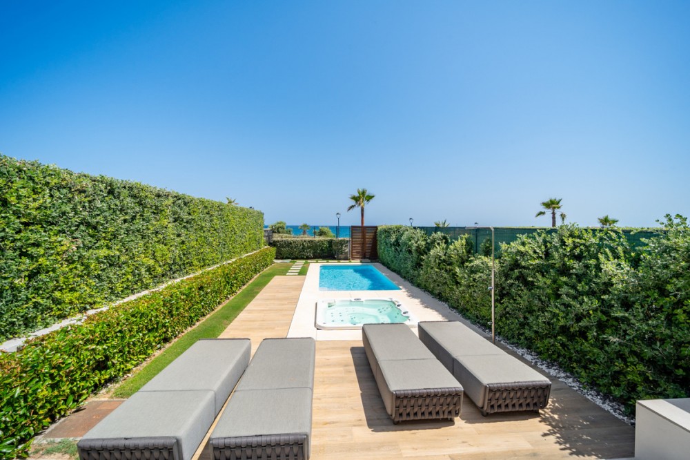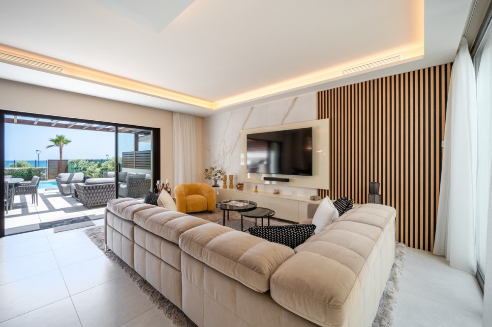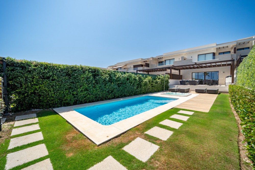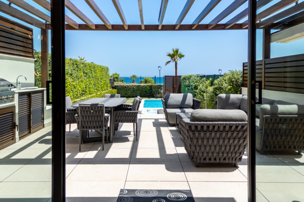 - Situated on the frontline of the New Golden Mile, between Puerto Banús and Estepona, this exceptional townhouse offers a unique blend of coastal luxury, privacy, and resort-style amenities. Located in a secure gated community with beautifully landscaped gardens, a spacious communal swimming pool, and direct access to the beach and promenade, it is the ideal Mediterranean retreat. The property spans three levels and features three bright bedrooms and four elegantly designed bathrooms. The open-plan American kitchen flows seamlessly into the living and dining area, where expansive windows frame uninterrupted sea views and fill the home with natural light. From the main living space, step out onto a large terrace and private garden with your own swimming pool — the perfect spot for entertaining or relaxing in the sun. A generous basement level offers flexible space, ideal for a home cinema, private gym, or the potential to add an additional bedroom. Two secure underground parking spaces provide added convenience and peace of mind. Residents of the community also benefit from access to tennis and padel courts, making this property a haven for both relaxation and active living. Combining a prime beachfront location, refined architecture, and versatile leisure options, this is the perfect home for those seeking a premium coastal lifestyle on the Costa del Sol.