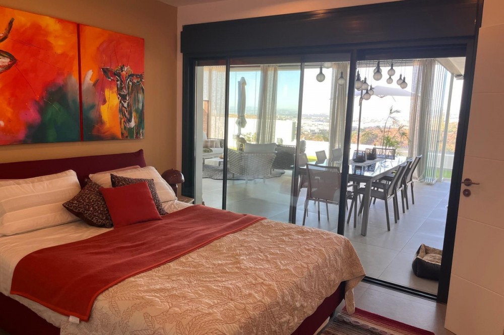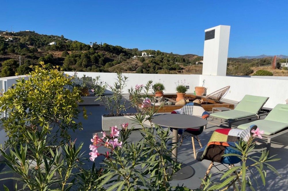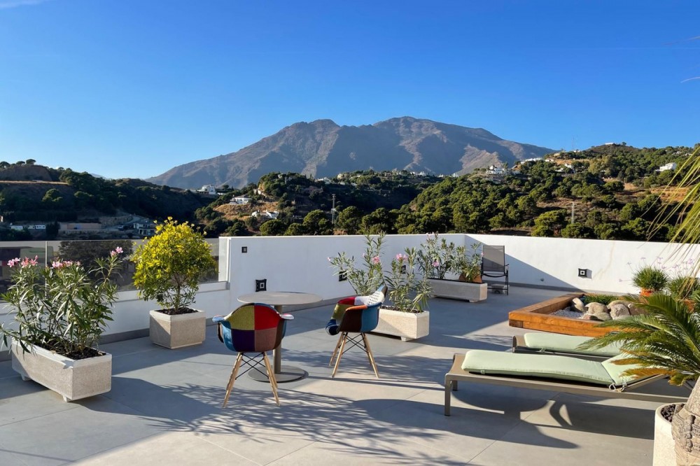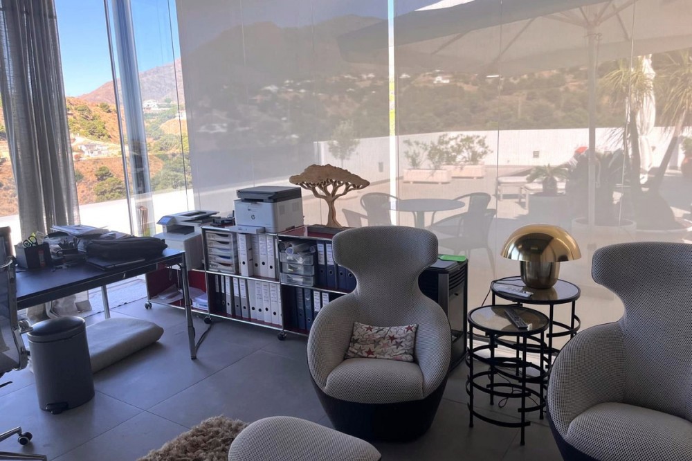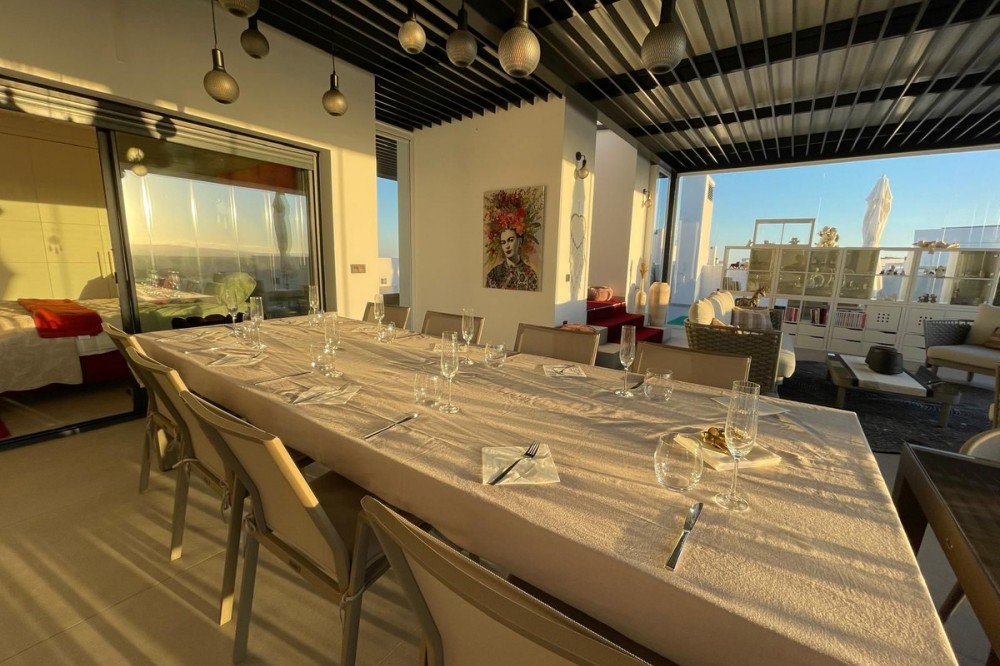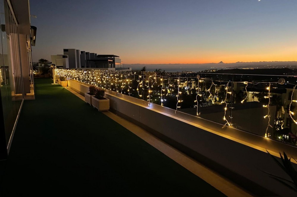 - Exclusive Penthouse in Mirador de Estepona Hills with Unmatched Panoramic Views Introducing a truly spectacular penthouse in the prestigious Mirador de Estepona Hills residential complex. Perfectly oriented to the southwest, this home offers breathtaking 360-degree views of the Mediterranean Sea, Gibraltar, the African coastline, and Marbella’s iconic skyline. Originally designed with three bedrooms and two bathrooms, the property has been meticulously transformed to create a contemporary and versatile layout, featuring approximately 200 m² of interior living space and 200 m² of surrounding terraces. Upon entering, you are welcomed into an elegant open-plan concept: • A spacious designer kitchen to the right combines style and functionality. • To the left, a walk-in dressing room provides convenience and storage. • Behind the kitchen, a generous utility/storage room offers additional flexibility. From the kitchen, you step into a large office space that flows seamlessly onto a private terrace, perfect for installing a jacuzzi or plunge pool, with unparalleled views of Sierra Bermeja. To the left, a bright dining area enclosed with glass curtains invites natural light and panoramic views, providing access to one of the most impressive wrap-around terraces on the Costa del Sol – a perfect setting for year-round outdoor living. The sleeping area, located straight ahead from the entrance, comprises two bedrooms and two bathrooms, including a master suite with its own en-suite bathroom. Additional features include two private parking spaces, two storage rooms, and direct lift access to the penthouse, ensuring absolute privacy and exclusivity. A unique home where luxury meets tranquility – the perfect retreat in the heart of the Costa del Sol.