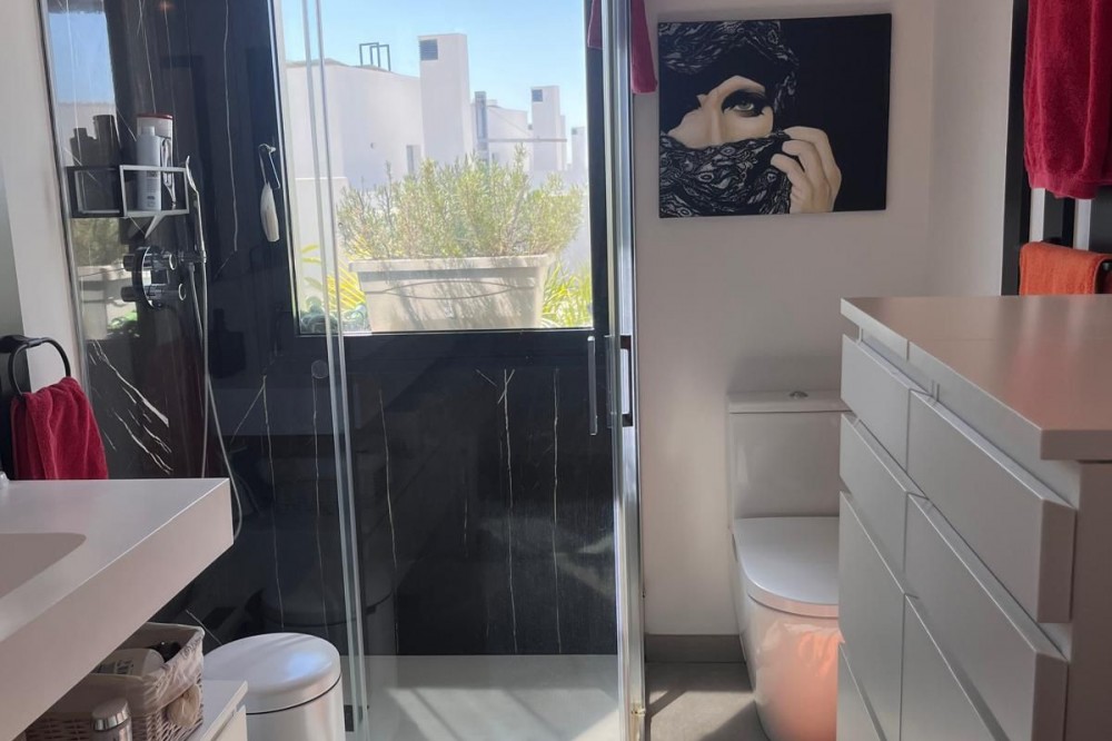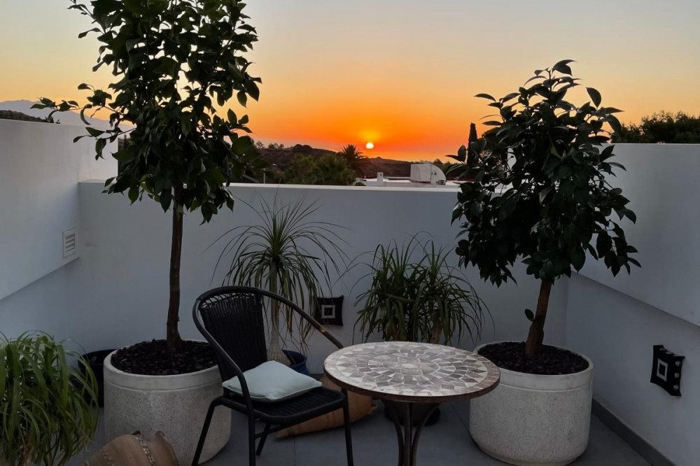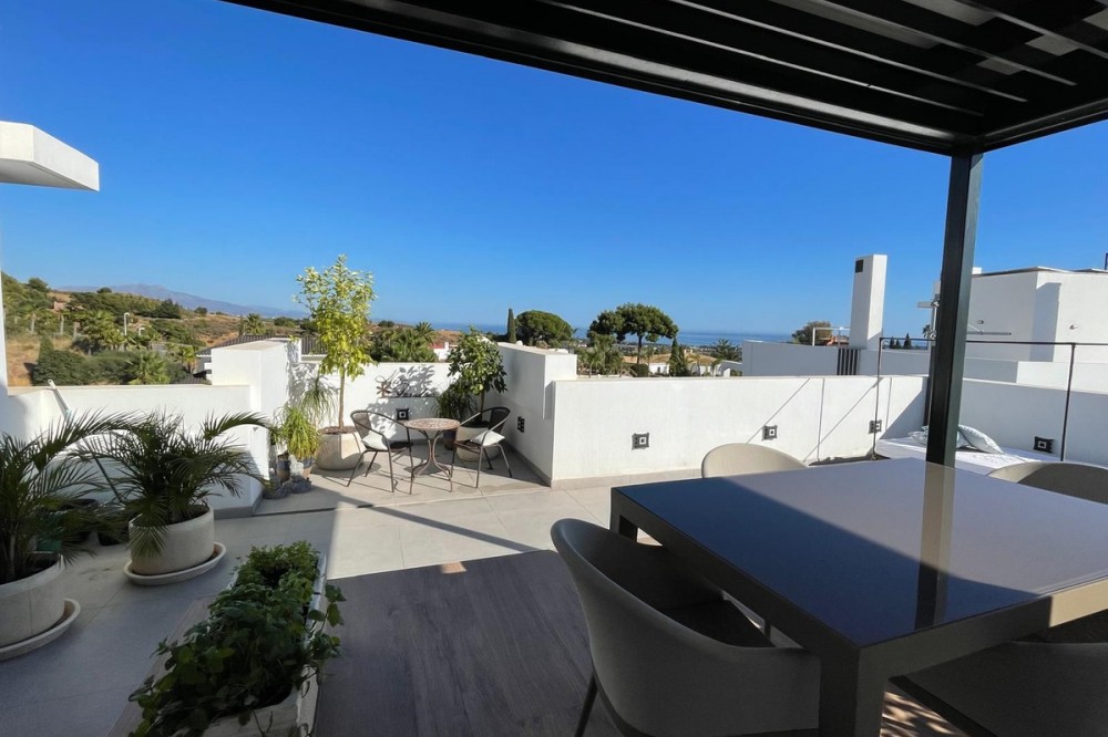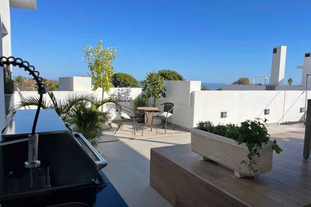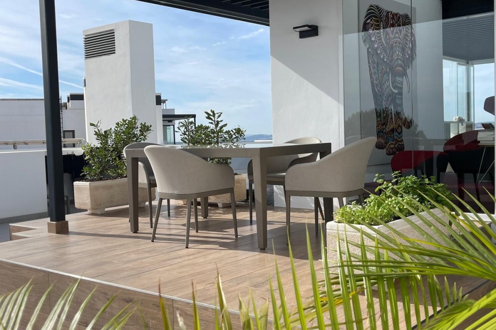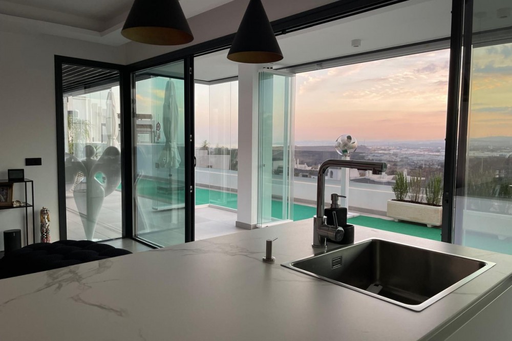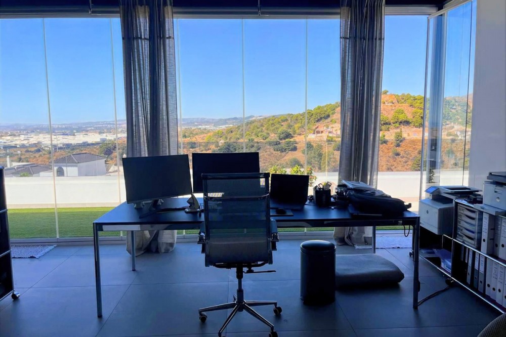 - Exclusive Penthouse in Mirador de Estepona Hills with Unmatched Panoramic Views Introducing a truly spectacular penthouse in the prestigious Mirador de Estepona Hills residential complex. Perfectly oriented to the southwest, this home offers breathtaking 360-degree views of the Mediterranean Sea, Gibraltar, the African coastline, and Marbella’s iconic skyline. Originally designed with three bedrooms and two bathrooms, the property has been meticulously transformed to create a contemporary and versatile layout, featuring approximately 200 m² of interior living space and 200 m² of surrounding terraces. Upon entering, you are welcomed into an elegant open-plan concept: • A spacious designer kitchen to the right combines style and functionality. • To the left, a walk-in dressing room provides convenience and storage. • Behind the kitchen, a generous utility/storage room offers additional flexibility. From the kitchen, you step into a large office space that flows seamlessly onto a private terrace, perfect for installing a jacuzzi or plunge pool, with unparalleled views of Sierra Bermeja. To the left, a bright dining area enclosed with glass curtains invites natural light and panoramic views, providing access to one of the most impressive wrap-around terraces on the Costa del Sol – a perfect setting for year-round outdoor living. The sleeping area, located straight ahead from the entrance, comprises two bedrooms and two bathrooms, including a master suite with its own en-suite bathroom. Additional features include two private parking spaces, two storage rooms, and direct lift access to the penthouse, ensuring absolute privacy and exclusivity. A unique home where luxury meets tranquility – the perfect retreat in the heart of the Costa del Sol.