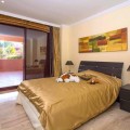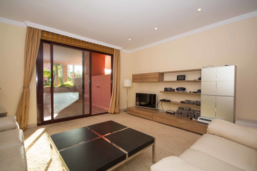 - Fantastic 201m2 built,183 m2 usable ground floor south oriented apartment (elevated 2 meters above ground floor), fully furnished in a new beach side urbanization located in the heart of the "New Golden Mile", close to the 5 stars Hotels Ikos & Las Dunas. The property offers an entrance hall, 4 bedrooms and 3 bathrooms (2 of them en-suite with jacuzzi, a large fully fitted kitchen, a living/dining room with access to a large covered 104 m2 terrace with beautiful views over the tropical garden. The entire apartment is finished to the highest standards, (cream marble, granite and terracotta in the grounds), telephone, satellite T.V., air conditioning hot & cold and alarm. The property also enjoys a useful utility room beside the kitchen, and a private parking space in the communal underground garage. Furthermore, the complex offers 18 hours security per day and a set of luxury equipments such as 2 superb swimming pools (one outside and the other one inside and heated in the underground), gymnasium, sauna and social room.