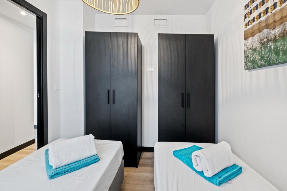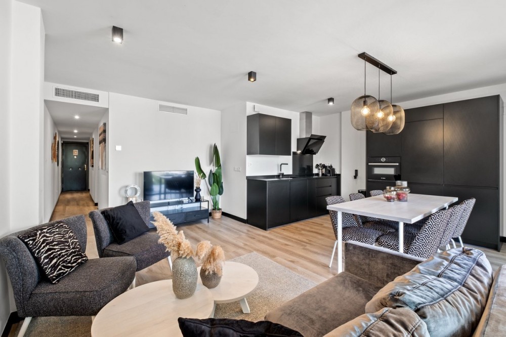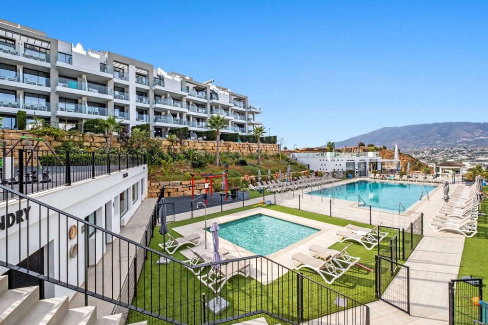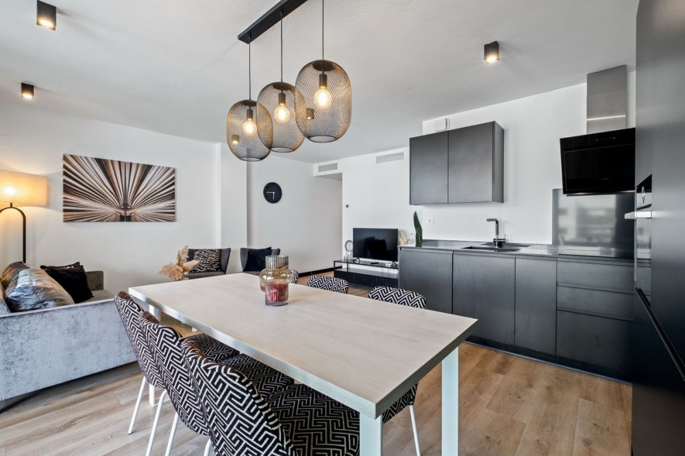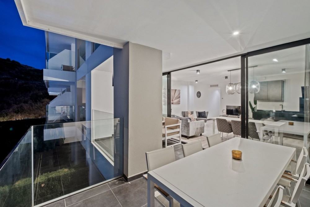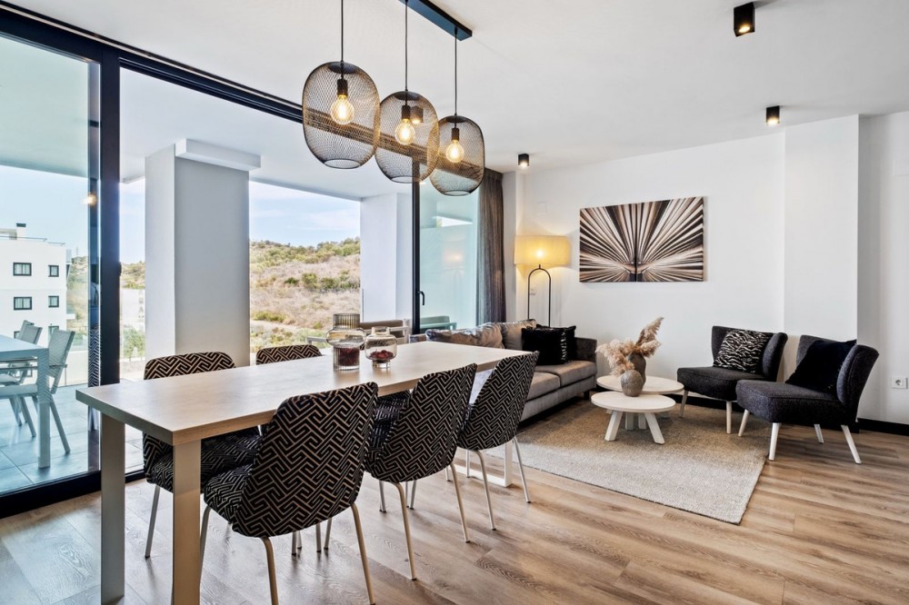 - This spacious 3-bedroom apartment is perfectly located in the center of the complex, with direct views of the pool but without any disturbance from the garage or restaurant. Thanks to the natural slope of the mountains, the entrance is at ground level while the terrace is elevated, offering both comfort and privacy. Inside, you’ll find a bright living area with large sliding glass doors that open onto a partially covered terrace, creating a seamless indoor-outdoor space. The modern open-plan kitchen features a large cooking island and is fully equipped with oven, electric hob, dishwasher, and Nespresso machine. The apartment offers three bedrooms (one with a bunk bed) and a stylish bathroom with a spacious walk-in shower. It comfortably accommodates up to six people, making it ideal for families, couples, or as a rental investment. The terrace is a highlight, with a dining table for six and a relaxing lounge area, perfect for enjoying views over the pool, lagoon, and surrounding hills. The property is tastefully furnished and ready to move into. The community offers top-notch amenities, including a gym, sauna, and fully equipped laundry facilities. The property also includes a private underground parking space and storage room for added convenience. Hacienda del Sueño provides tranquility and privacy while remaining close to local services, restaurants, and the coast, making it an ideal location for a luxurious lifestyle. Don’t miss this opportunity—contact us today to arrange a viewing!