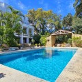 - Exclusive villa with private garden and pool in Sotogrande Alto Central A truly unique residence, designed and custom-built by its owner with a tasteful renovation that keeps it current while preserving its original essence. Its architecture blends contemporary lines with the warmth of traditional materials, such as exclusive hand-crafted Corian bricks and elegant serpeggiante marble floors, combined with iroko wood parquet in the bedrooms. Spread across three levels, the home offers 5 bedrooms, a study, spacious living areas, porticoed galleries, porches, and terraces that invite you to enjoy every corner. There are six bathrooms in total, three of them en suite. Comfort and character meet in every detail, from underfloor heating to the inviting wood-burning fireplace. The entrance welcomes you with a ribbed vaulted ceiling leading into a double-height living room, dining room, kitchen with breakfast area, guest bedroom, guest restroom, and a versatile sitting room that can also serve as a master suite with its own bathroom. Upstairs, three bedrooms are found, including a main suite with a walk-in closet, along with an impressive library overlooking the main living room. The semi-basement, fully open to the garden, features a summer lounge perfect for gatherings, along with a study and the home’s service and storage areas. The property sits on sloping terrain with two distinct gardens: a south-facing front garden and a more private rear garden designed for outdoor living, complete with a pergola, swimming pool, summer kitchen, and barbecue area. Surrounding the house, the lush native vegetation of Los Alcornocales Natural Park creates a serene and private sanctuary. A singular home where design, comfort, and nature come together in perfect harmony.