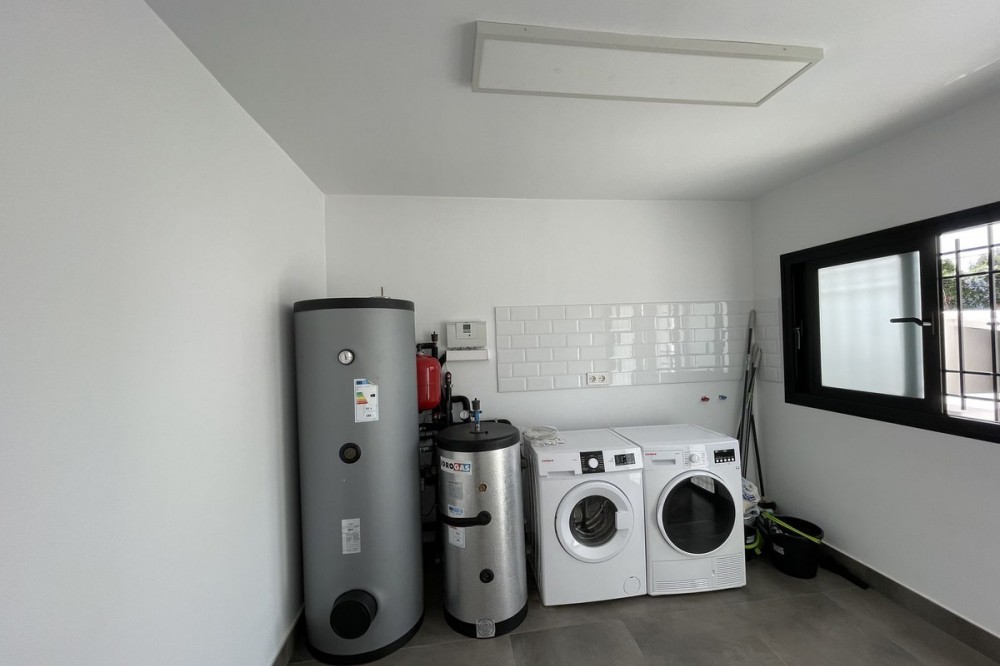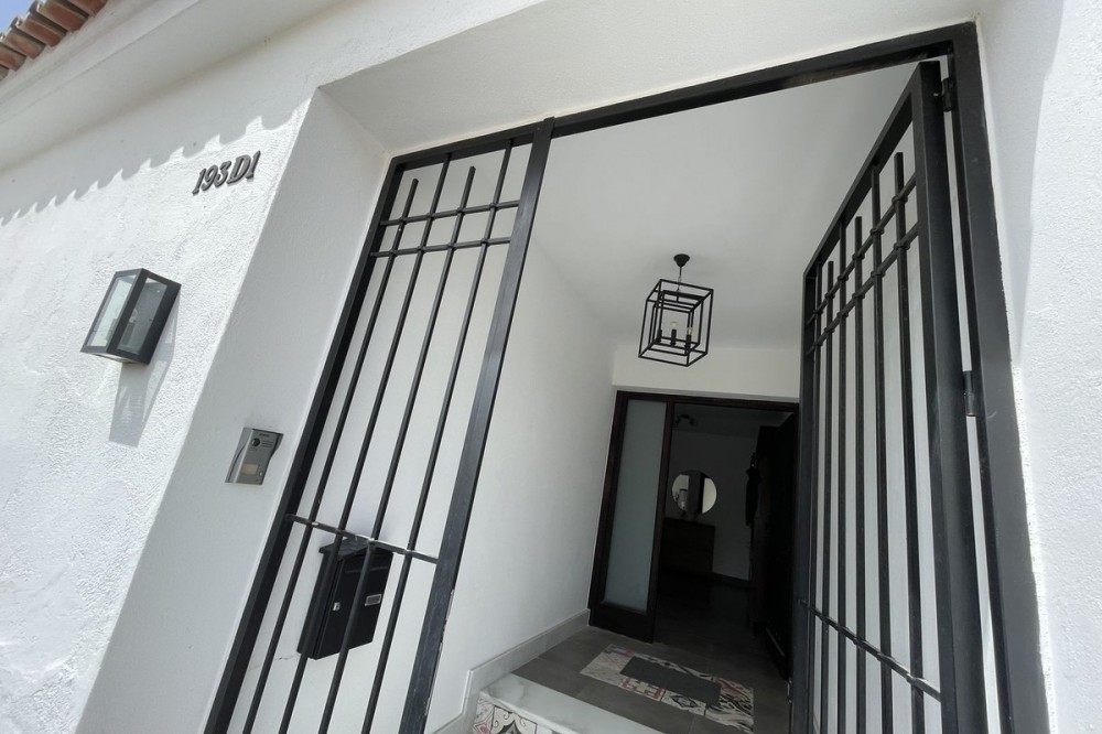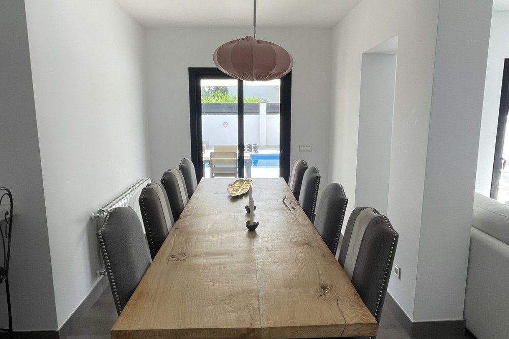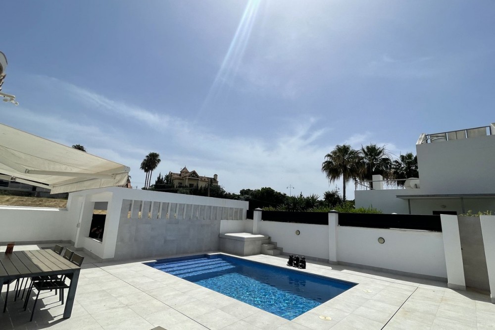 - Discover this spectacular modern design villa for sale! Located on a 420 m² plot and with 195 m² of usable area, this property offers an exclusive and sophisticated lifestyle. Upon entering, you'll be greeted by an elegant hall that leads to an open-plan kitchen, perfect for enjoying time with family or friends. The dining area and living room are designed to maximize natural light, thanks to its south-facing orientation. The villa has three bedrooms, each with an en-suite bathroom, arranged around a charming interior patio that provides a touch of serenity and privacy. It also has a laundry area and built-in wardrobes that add functionality to the space. The exterior is simply stunning: a large pool with a shower and sun loungers invites you to relax in the sun. You'll also find a separate covered parking area for two cars, ensuring comfort and security for your vehicle. Located near the prestigious San José School and just 700 meters from San Pedro Beach, this villa, built in 2015, is your perfect opportunity to live in a privileged setting with all the amenities you've always dreamed of. Come and see it and fall in love!