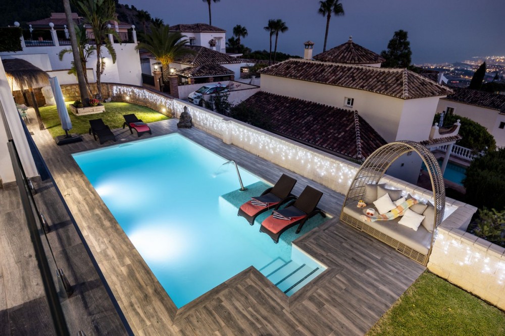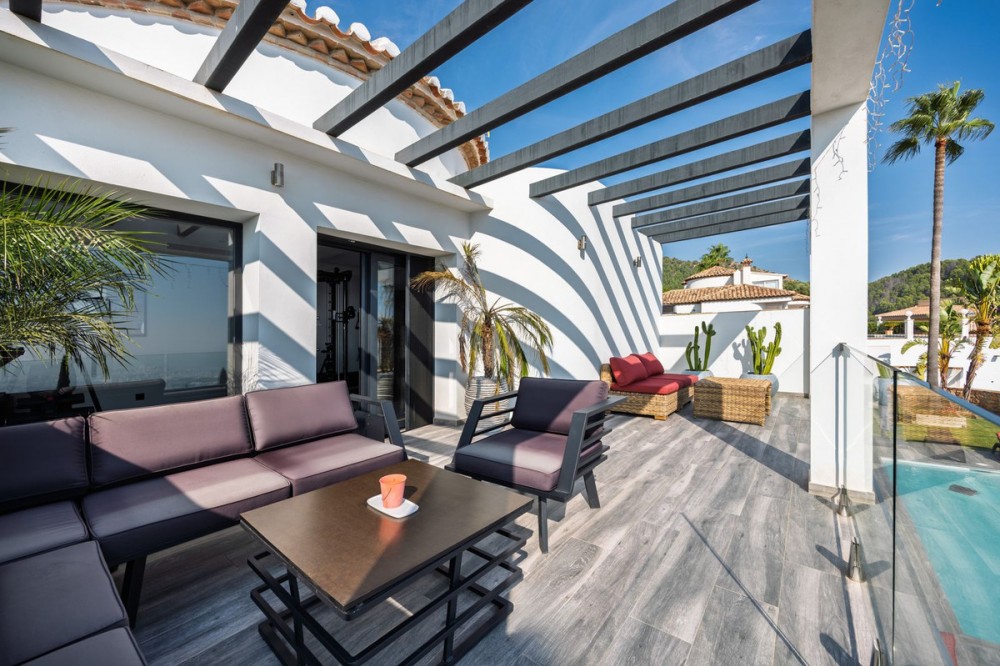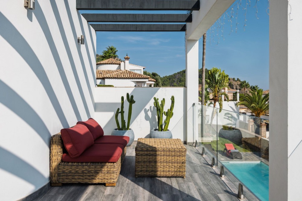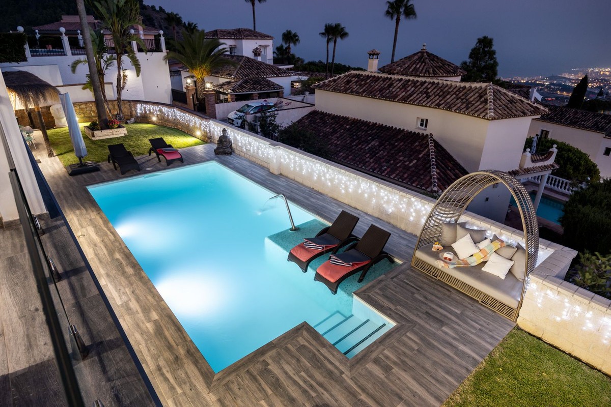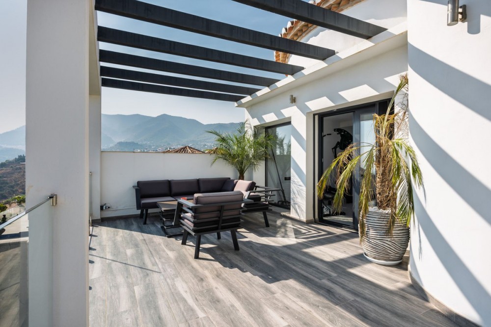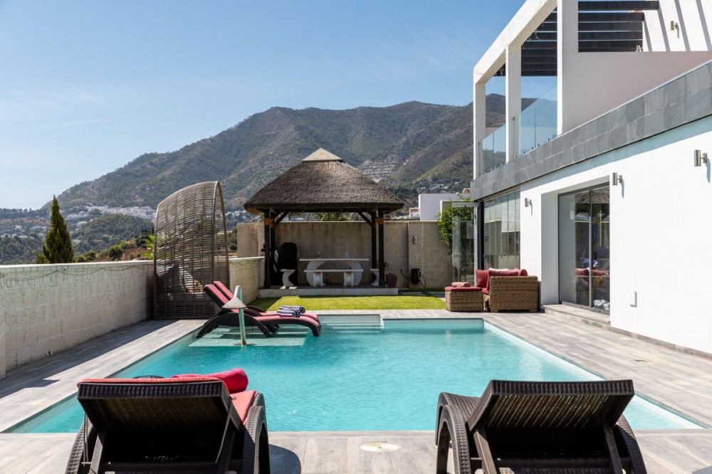 - Spectacular villa that perfectly blends Mediterranean style with contemporary design, combining traditional charm with modern comfort and top-quality finishes. Located in the prestigious Buena Vista area of Mijas, it offers a unique lifestyle in a peaceful and private setting, with stunning panoramic views of the Mediterranean Sea, the coastline, Africa, and the mountains. Set on a plot of 800 m² with a built area of 251 m², the property is in immaculate condition and ready to move into. Its location is unbeatable: just 5 minutes from Fuengirola, 2 minutes from the exclusive Higuerón commercial area with all kinds of services, 10 minutes from the finest beaches of the Costa del Sol, and only 20 minutes from Málaga city center and the airport. The villa is mainly distributed on one floor, ensuring functionality and comfort. Upon entering, the home immediately stands out for its brightness and sense of space thanks to the open-plan design. The modern fully fitted kitchen seamlessly integrates with the spacious living room with fireplace, creating a warm atmosphere that connects with the terraces and garden through large sliding doors. The exterior is a true private retreat, featuring a swimming pool with sunbathing area and hydromassage jet, a barbecue area ideal for outdoor gatherings, and a landscaped garden with fruit trees, all with open views to the sea and mountains. The property offers four bedrooms. The master bedroom, with en-suite bathroom and walk-in wardrobe, has direct access to a terrace with a private jacuzzi. Two additional bedrooms with their own bathrooms are located on the opposite wing of the house, ensuring privacy for family or guests. On the upper floor, a versatile space currently used as a gym with bathroom and private terrace can easily be converted into an independent suite with spectacular views. Additional features include a cinema room, sauna, laundry room, air conditioning, solar panels for hot water, and parking space for three vehicles, including a closed garage and covered carport. An ideal residence both for year-round living and as a luxury holiday home, perfect for those seeking privacy, comfort, and a strategic location on the Costa del Sol.