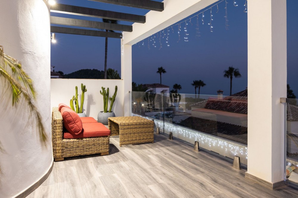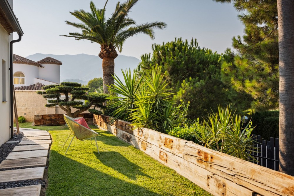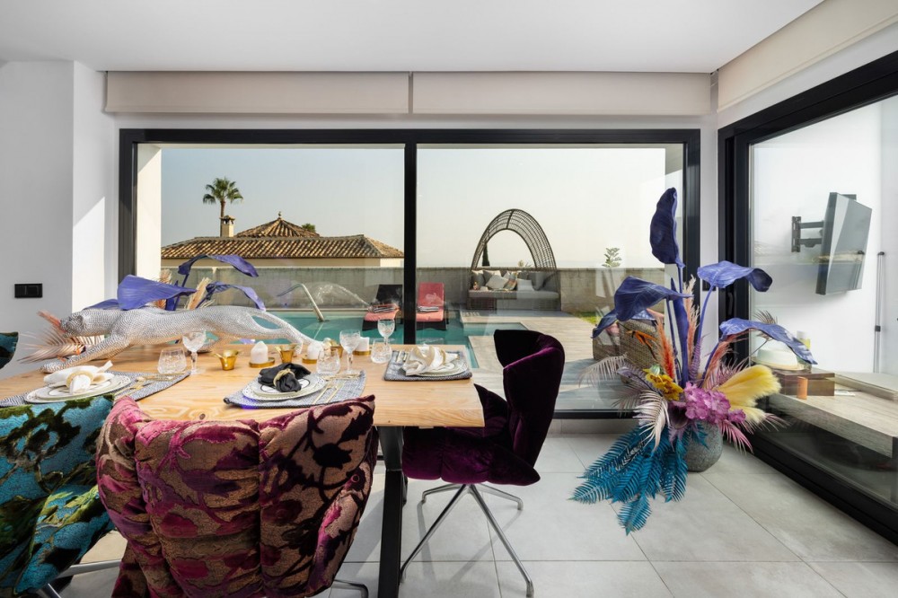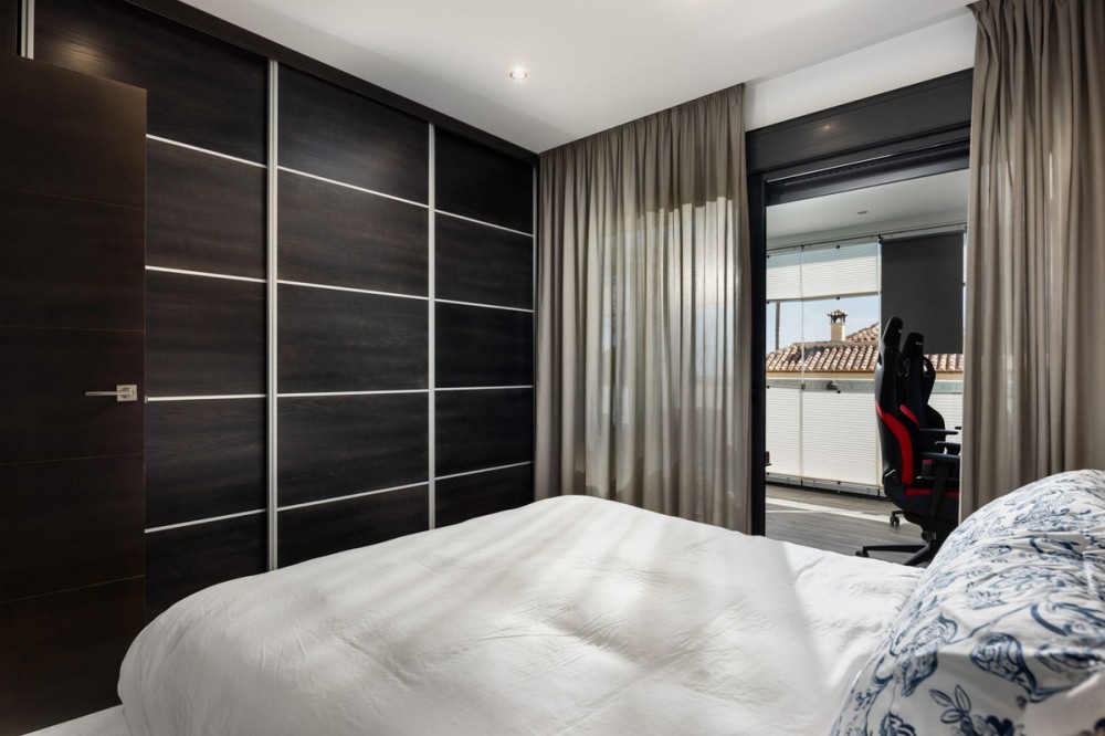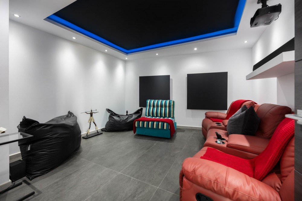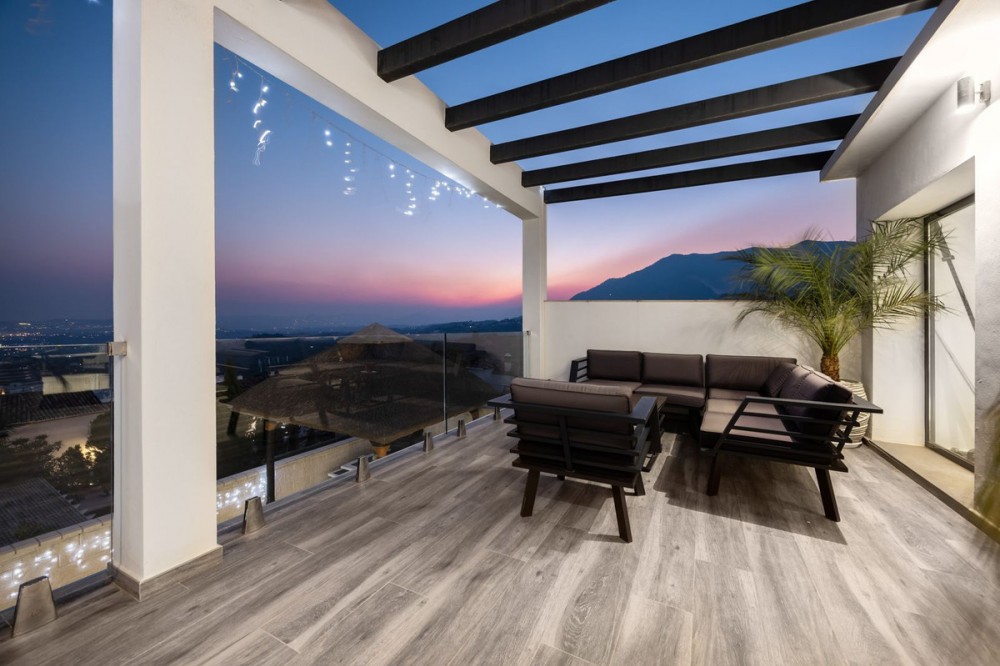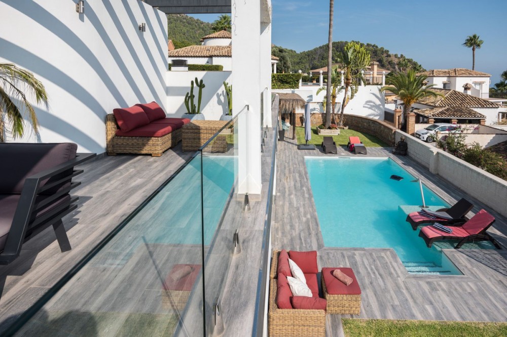 - Spectacular villa that perfectly blends Mediterranean style with contemporary design, combining traditional charm with modern comfort and top-quality finishes. Located in the prestigious Buena Vista area of Mijas, it offers a unique lifestyle in a peaceful and private setting, with stunning panoramic views of the Mediterranean Sea, the coastline, Africa, and the mountains. Set on a plot of 800 m² with a built area of 251 m², the property is in immaculate condition and ready to move into. Its location is unbeatable: just 5 minutes from Fuengirola, 2 minutes from the exclusive Higuerón commercial area with all kinds of services, 10 minutes from the finest beaches of the Costa del Sol, and only 20 minutes from Málaga city center and the airport. The villa is mainly distributed on one floor, ensuring functionality and comfort. Upon entering, the home immediately stands out for its brightness and sense of space thanks to the open-plan design. The modern fully fitted kitchen seamlessly integrates with the spacious living room with fireplace, creating a warm atmosphere that connects with the terraces and garden through large sliding doors. The exterior is a true private retreat, featuring a swimming pool with sunbathing area and hydromassage jet, a barbecue area ideal for outdoor gatherings, and a landscaped garden with fruit trees, all with open views to the sea and mountains. The property offers four bedrooms. The master bedroom, with en-suite bathroom and walk-in wardrobe, has direct access to a terrace with a private jacuzzi. Two additional bedrooms with their own bathrooms are located on the opposite wing of the house, ensuring privacy for family or guests. On the upper floor, a versatile space currently used as a gym with bathroom and private terrace can easily be converted into an independent suite with spectacular views. Additional features include a cinema room, sauna, laundry room, air conditioning, solar panels for hot water, and parking space for three vehicles, including a closed garage and covered carport. An ideal residence both for year-round living and as a luxury holiday home, perfect for those seeking privacy, comfort, and a strategic location on the Costa del Sol.